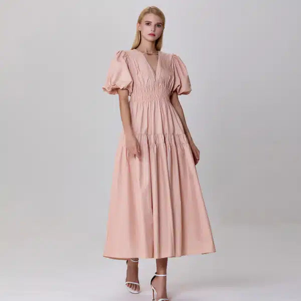 Robe smockée manches 3/4 évasée à col carré et imprimé floral