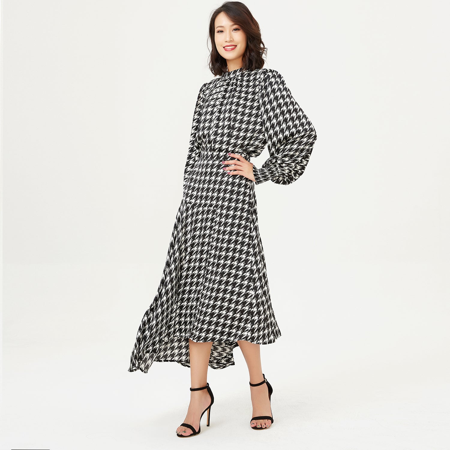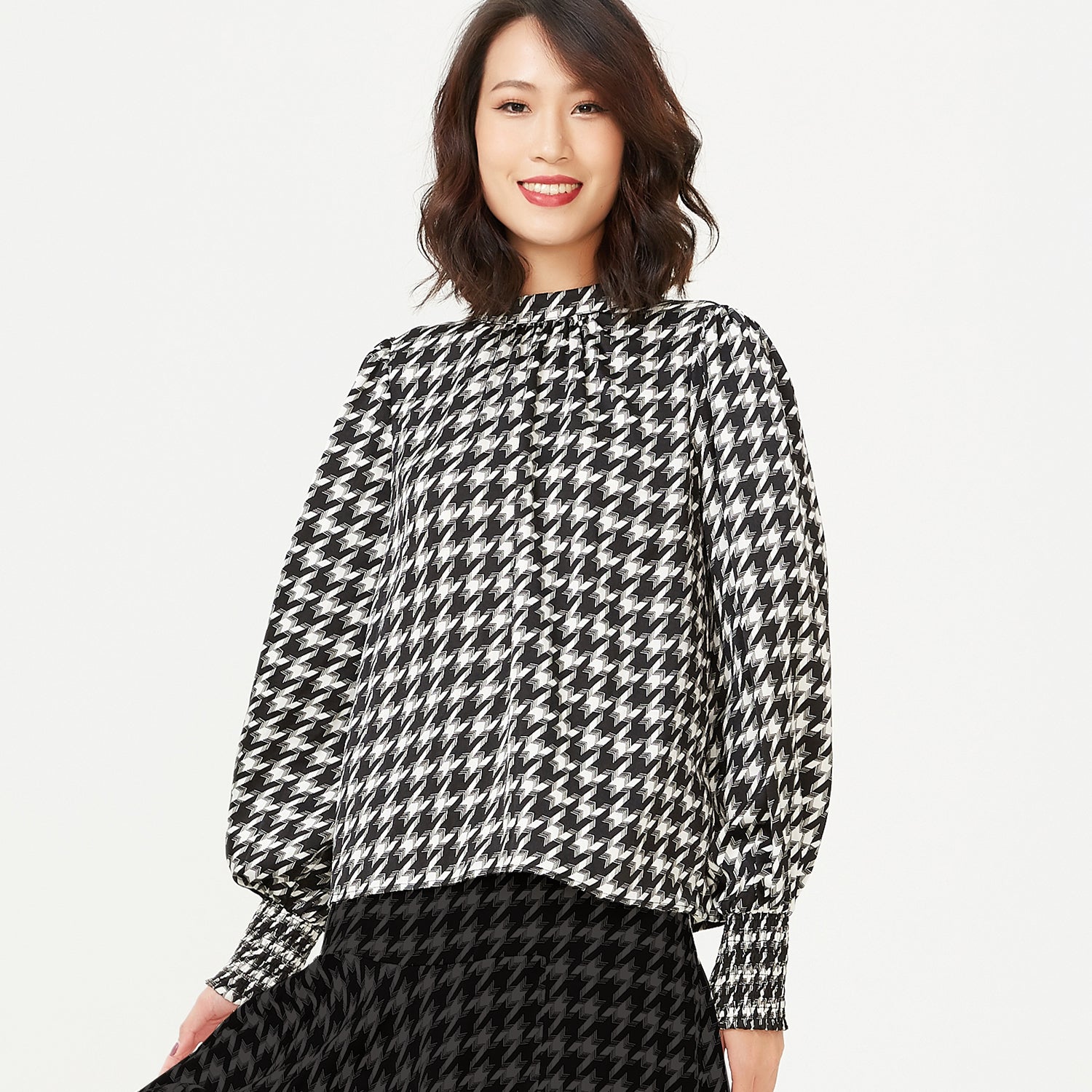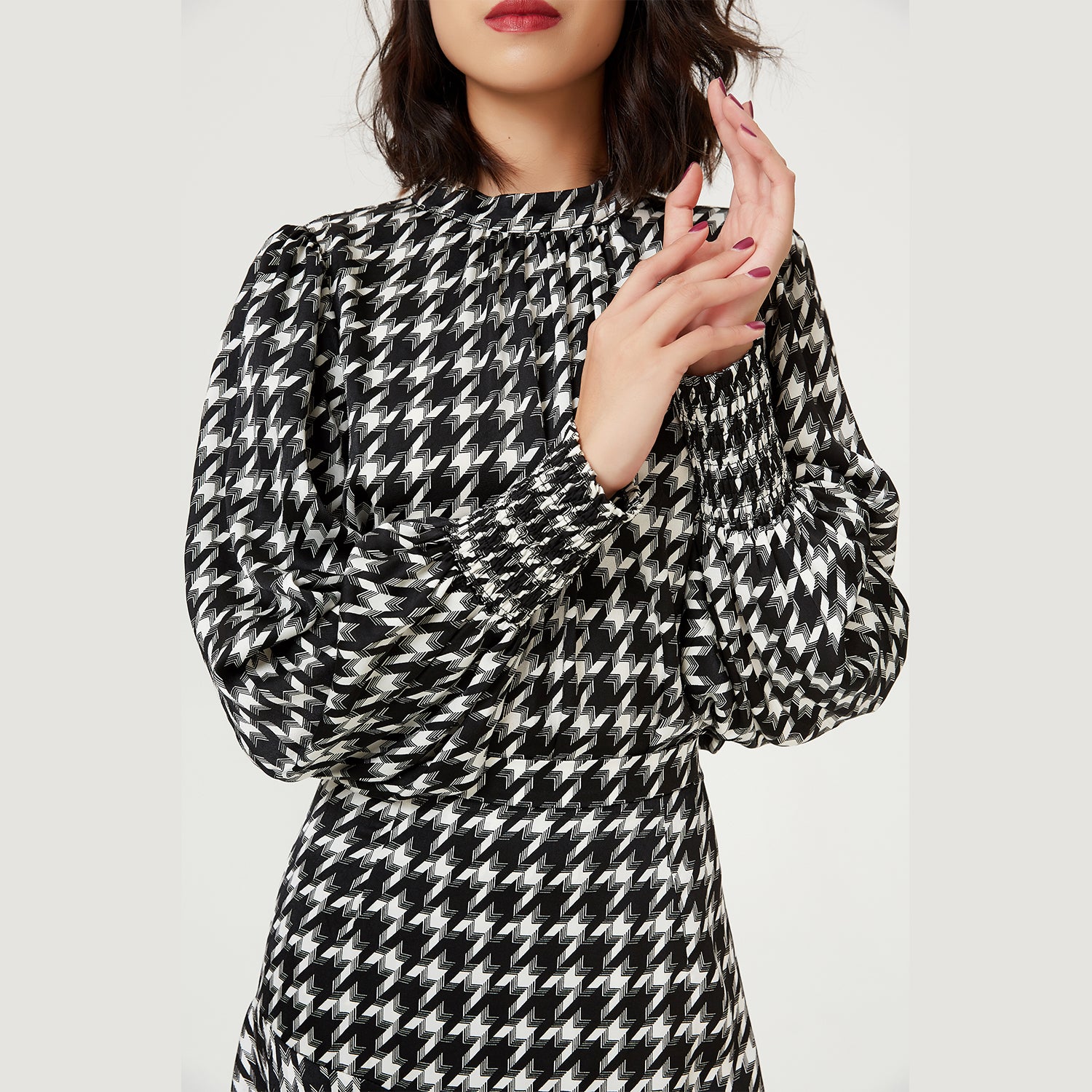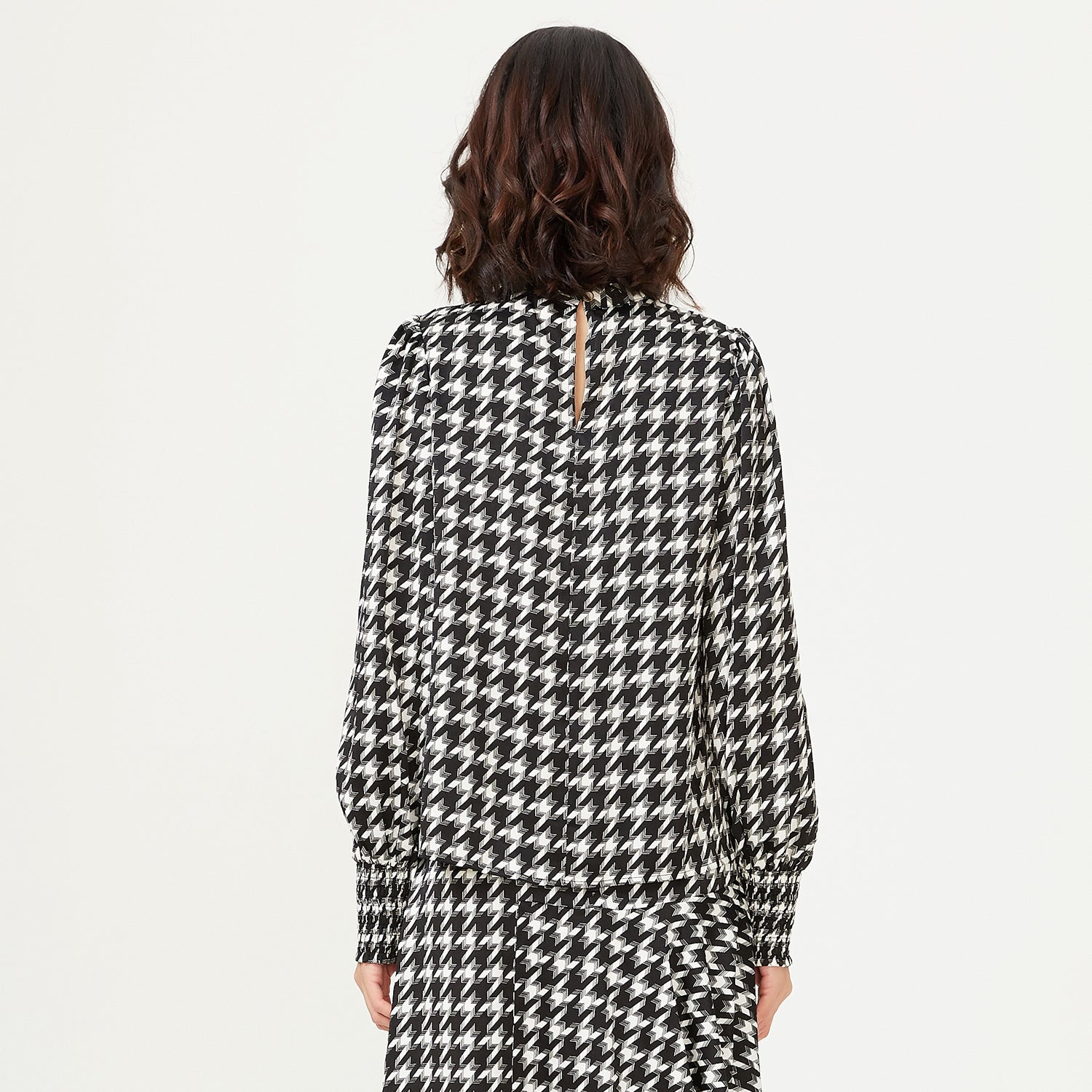 Une pièce très actuelle avec son imprimé monochrome. Ornée aux poignets des smocks qui donnent un volume généreux, plis partant du col montant qui apportent caractère et sophistication. A associer avec un blouson ou une veste tailleur et pour le bas un jean noir ou notre jupe trapèze plongeante à imprimé pied de poule.