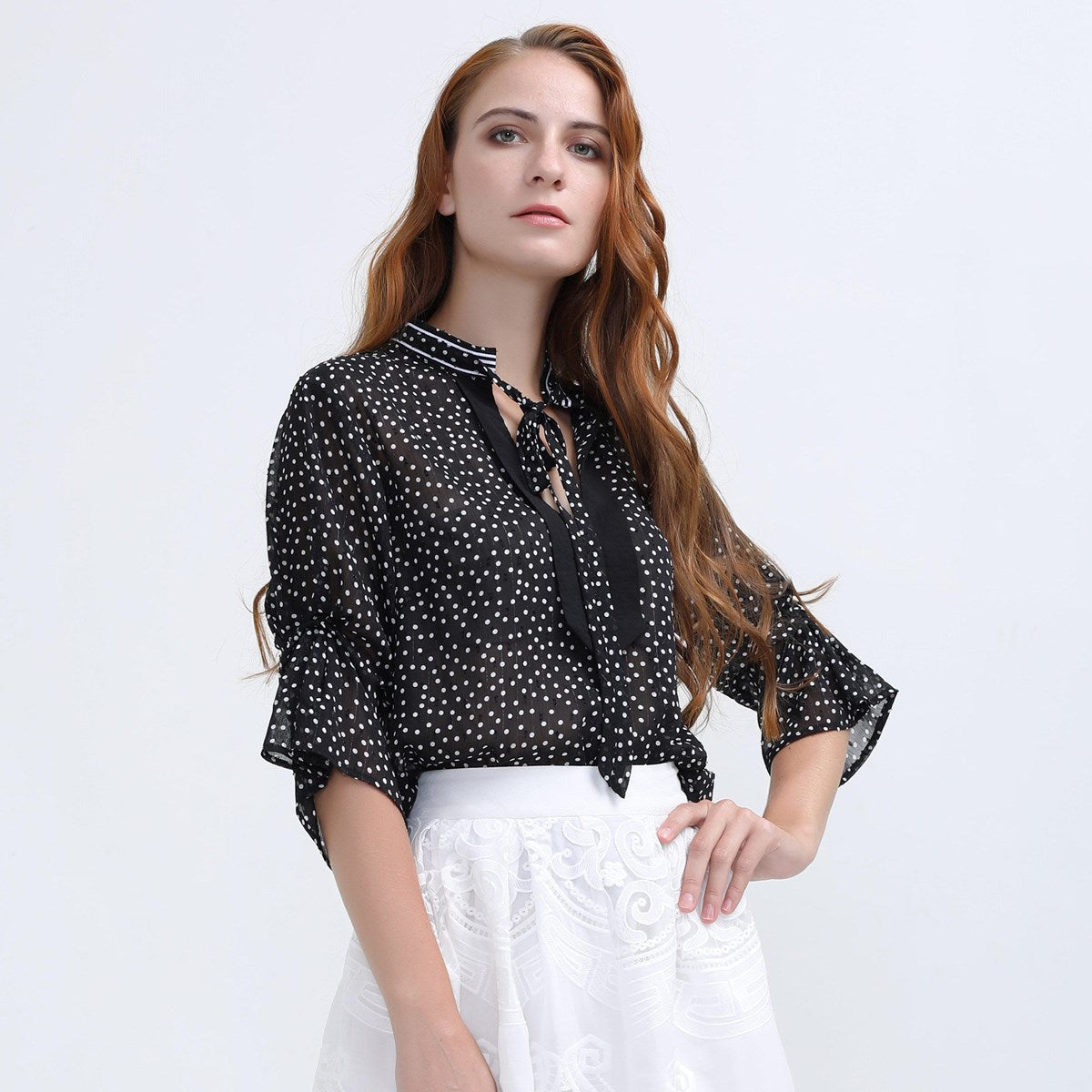 Un chemisier léger et chic qui vous servira pour de nombreuses occasions différentes. Plastron noir uni sur le devant et garniture sur le pied de col pour dynamiser l’allure. Elégante mousseline plumetis imprimée à pois, manches tulipes très actuelles. À porter avec un jean décontracté ou à associer dans une jupe plus formelle pour le bureau.