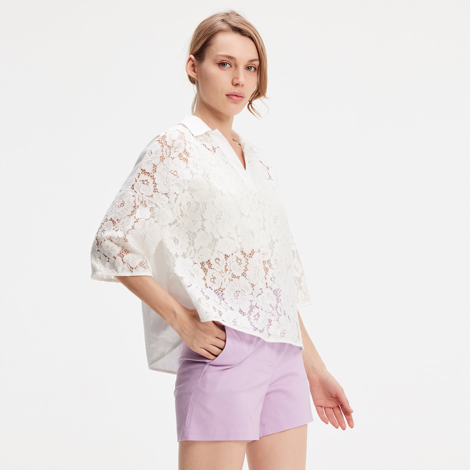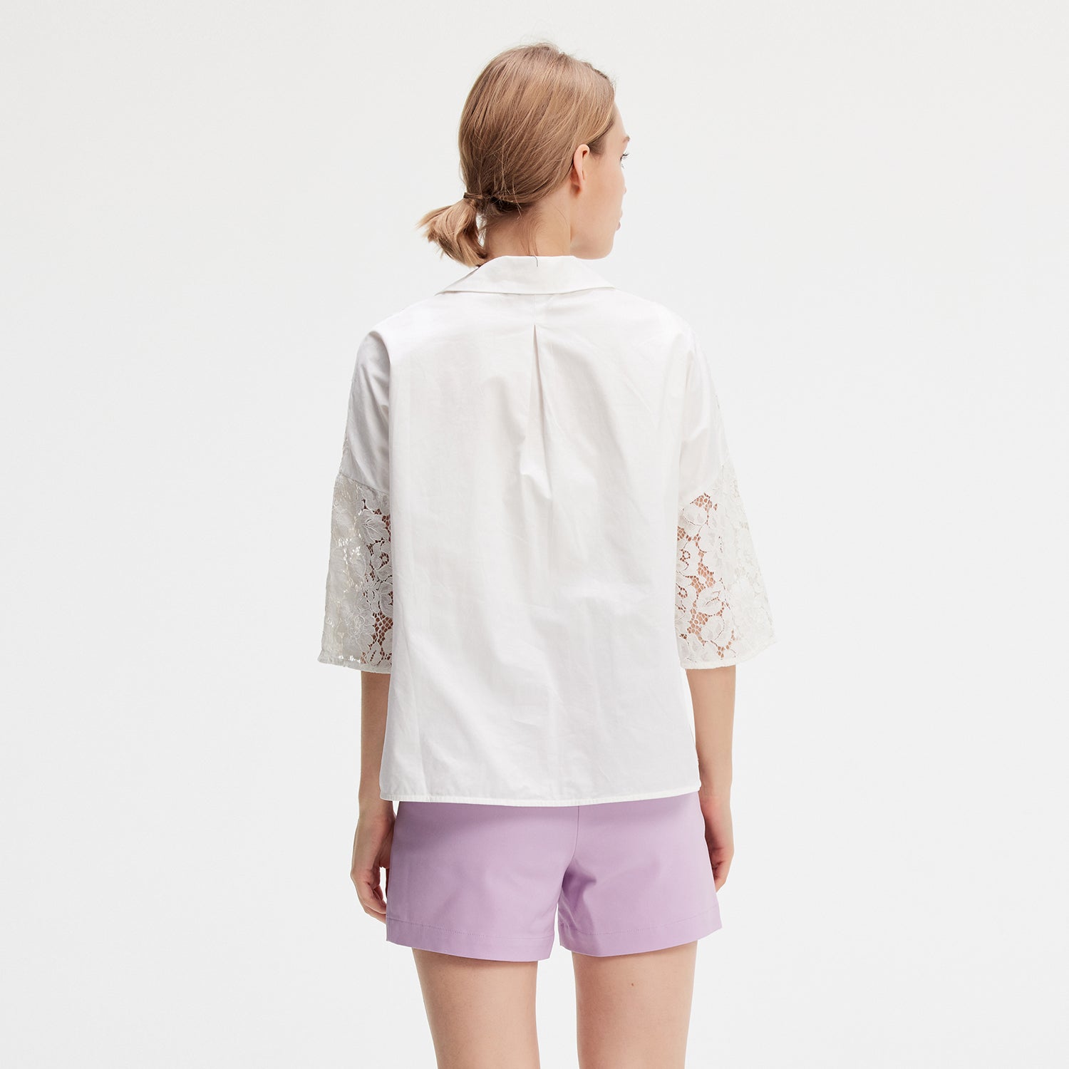 Un modèle ample et raffiné, cette tunique présente un devant et des manches en dentelle. Le col, l’encolure et le dos sont en popeline de coton. Une pièce décontractée qui s’associe bien avec un jean. A porte avec un bandeau, une brassière ou un débardeur en dessous.