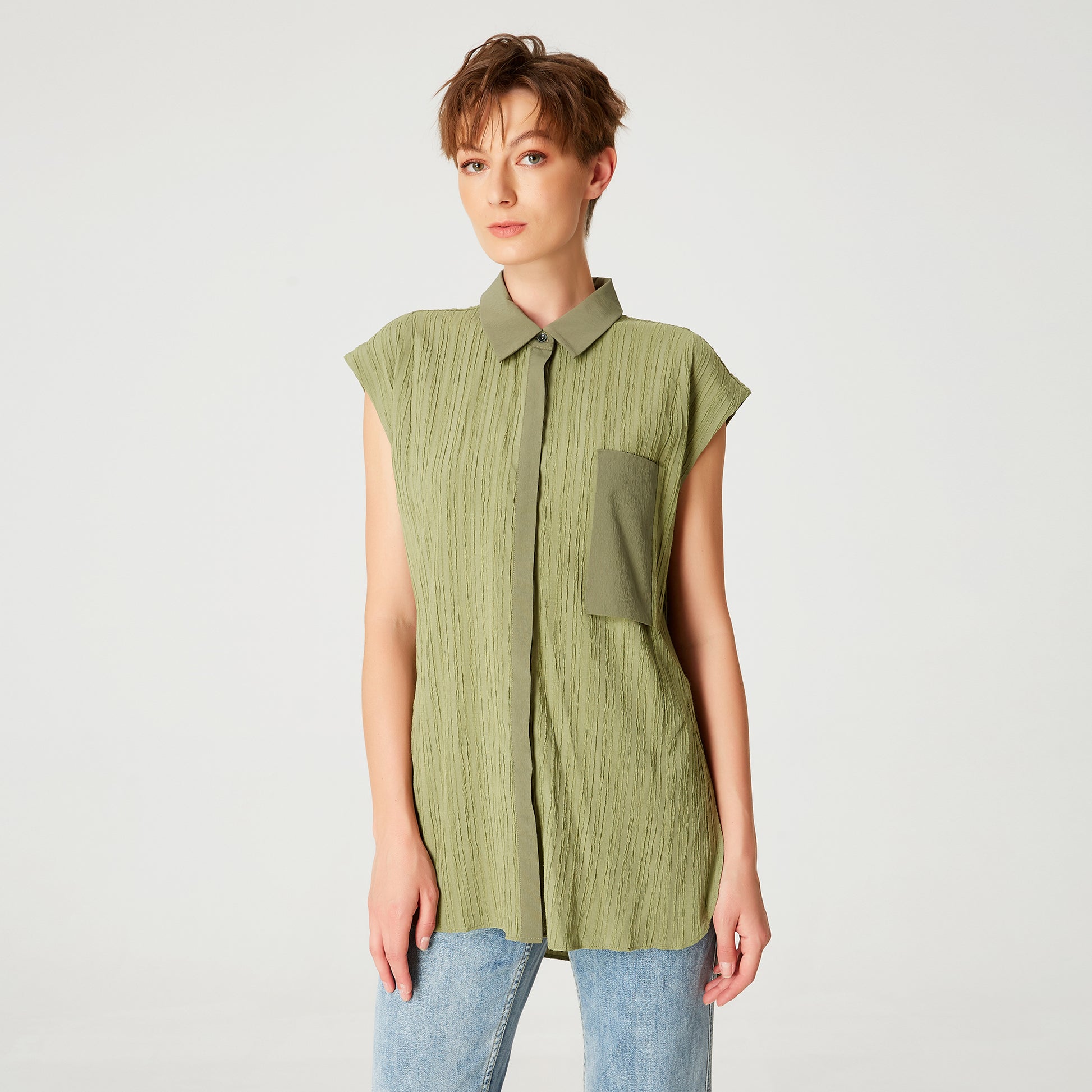 Une allure décontractée et androgyne pour cette chemise coupée dans un tissu subtilement plissé. Un article très actuel qui peut se rehausser d’une ceinture ou être laissé lâche. Portez-la sur un jean ou rentrez-la dans une jupe plus formelle avec une veste de tailleur pour aller au travail. Une pièce chic et polyvalente, très utile pour toute garde-robe.