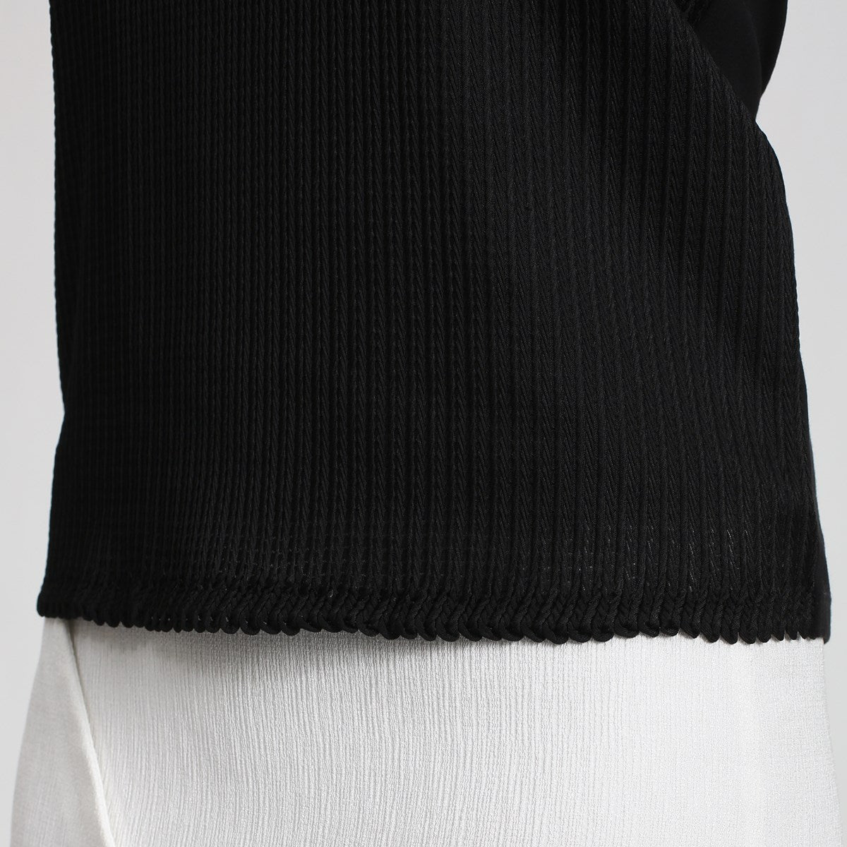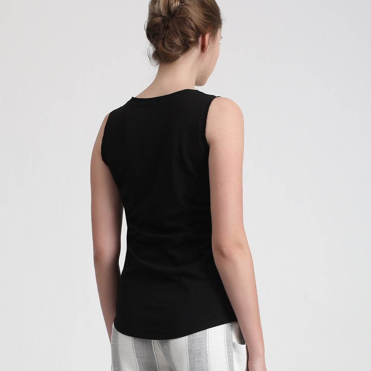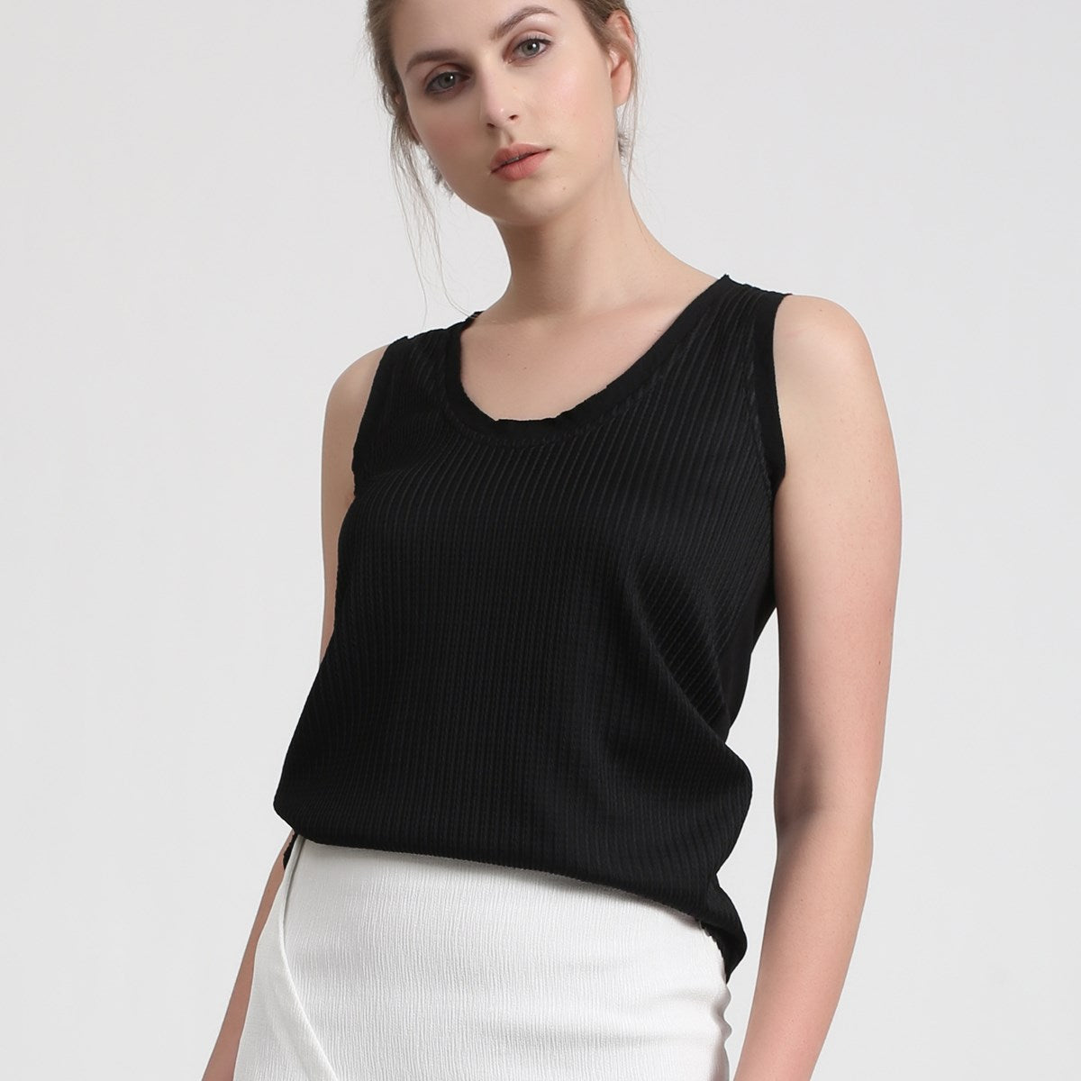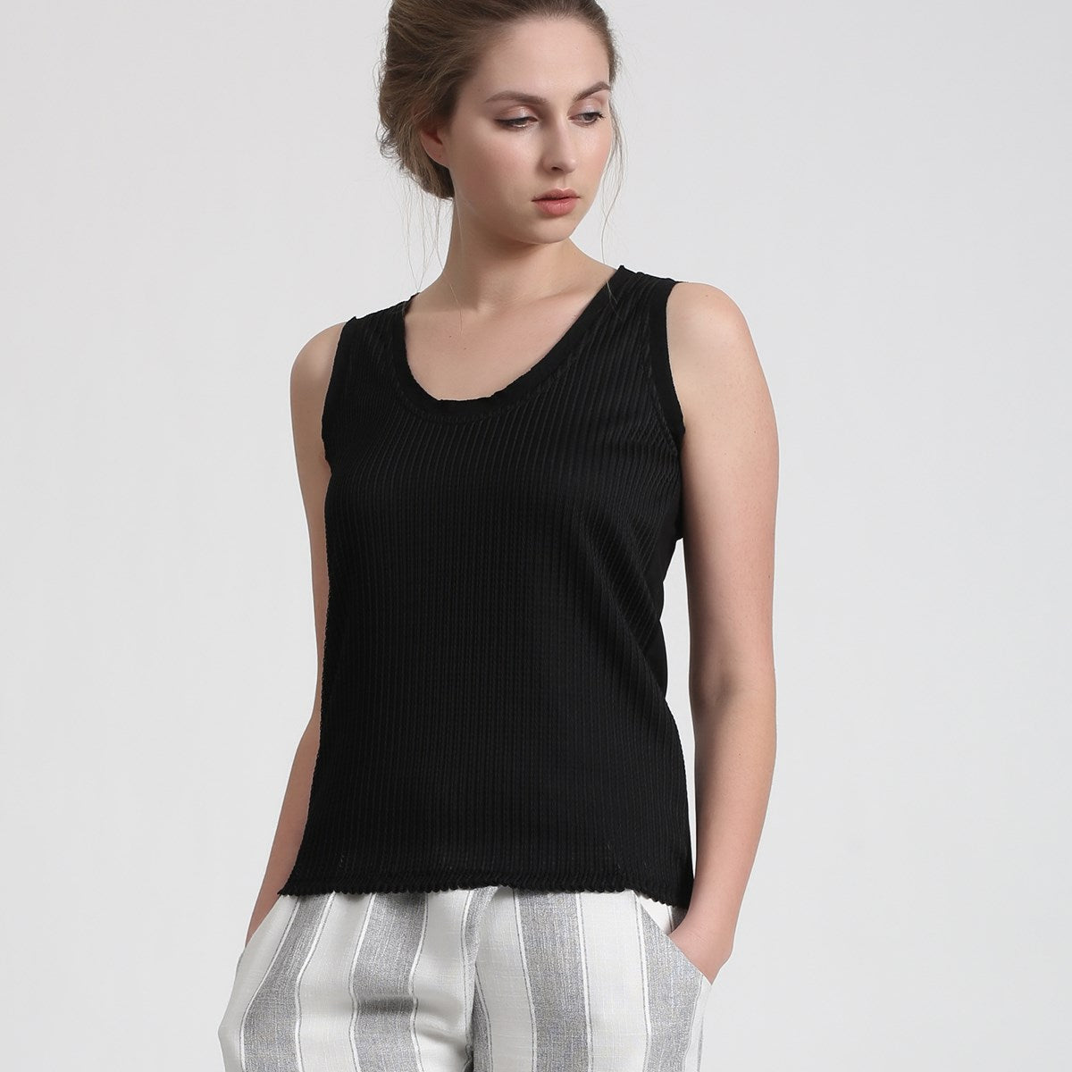 Une pièce de coupe simple et à finitions raffinées : encolure et emmanchures soulignées par un biais coton bord franc. Devant la matière est un tricot respirant et le dos présente dans un satin de viscose.