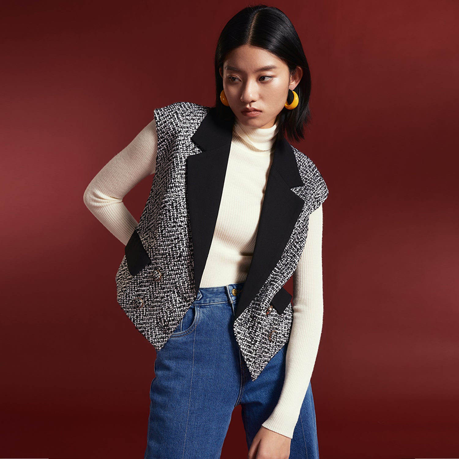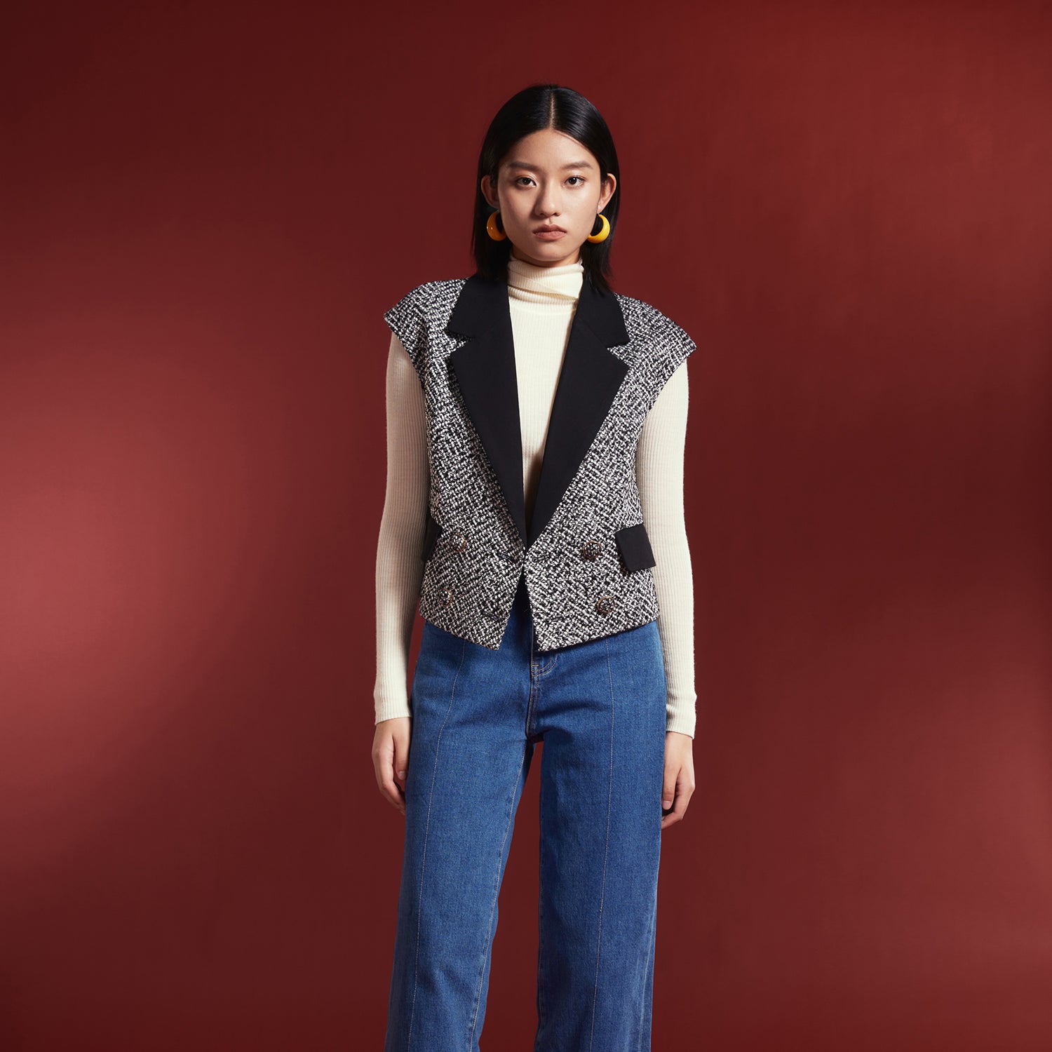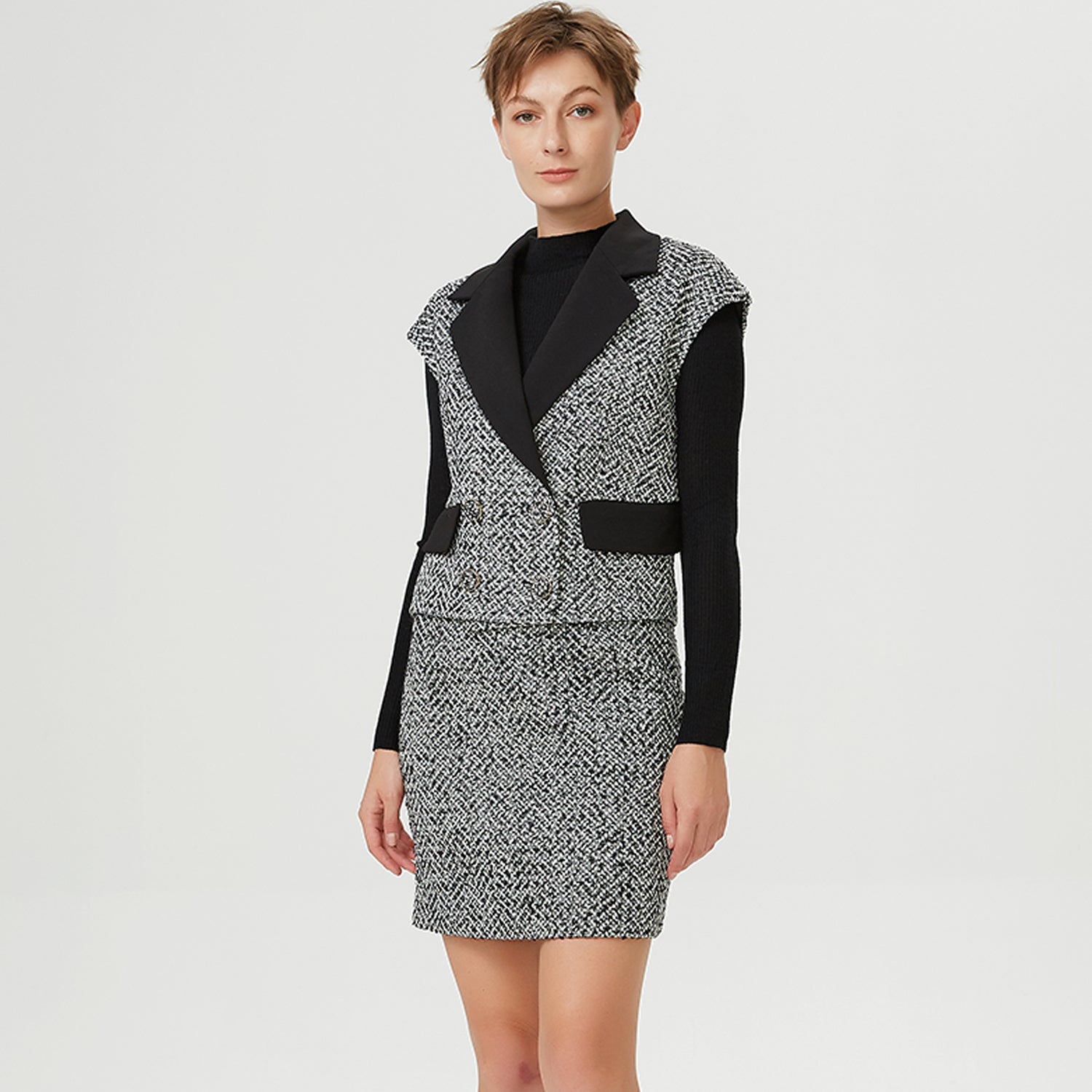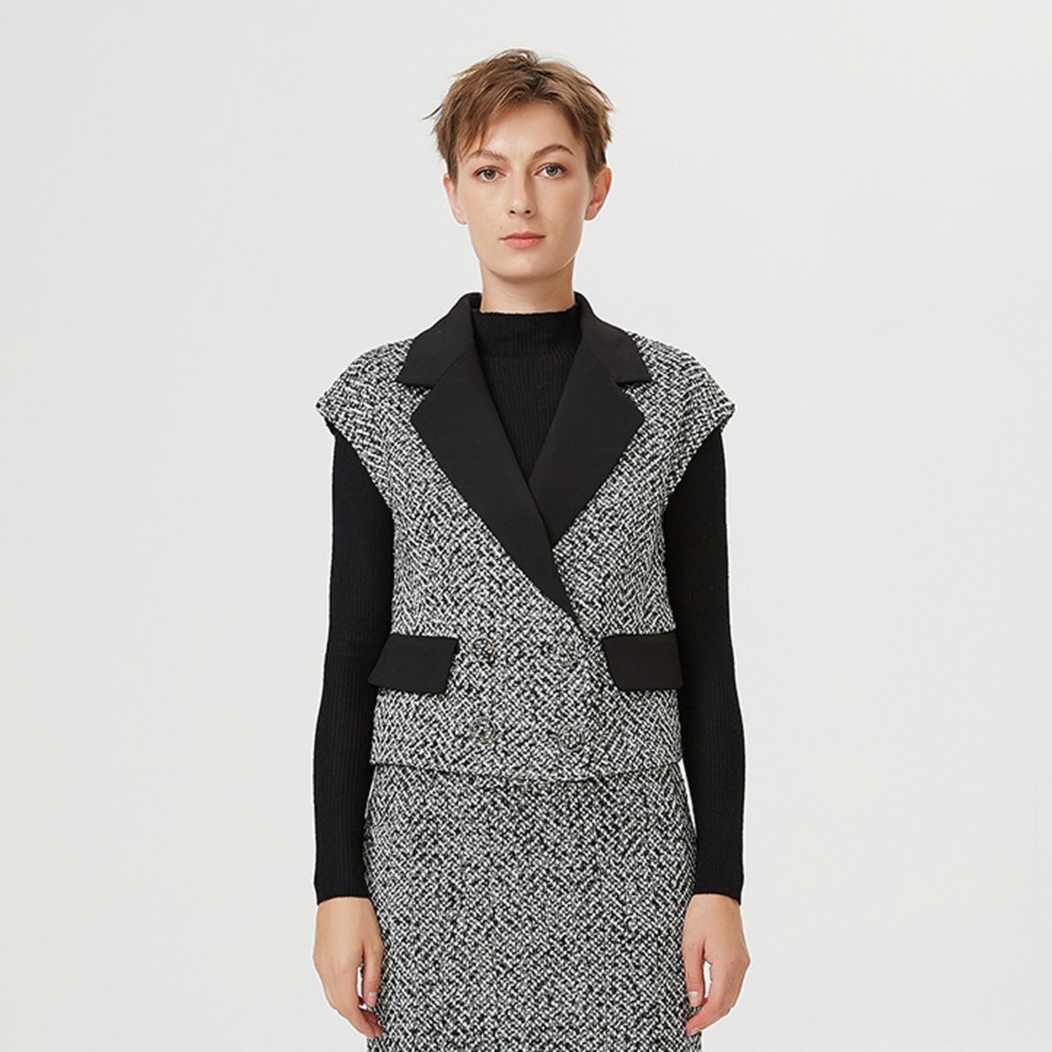 Ce gilet à double boutonnage présente un tweed bouclé chiné noir / blanc contrasté d’un tissu uni noir sur la pièce de col et les rabats de poches. Les épaules sont légèrement recouvertes et les boutons incrustés du même tissu en tweed. Une pièce de caractère qui permet de structurer une silhouette, par-dessus une blouse ou un sous pull à col roulé. Se porte également avec notre Jupe droite tweed chevron.