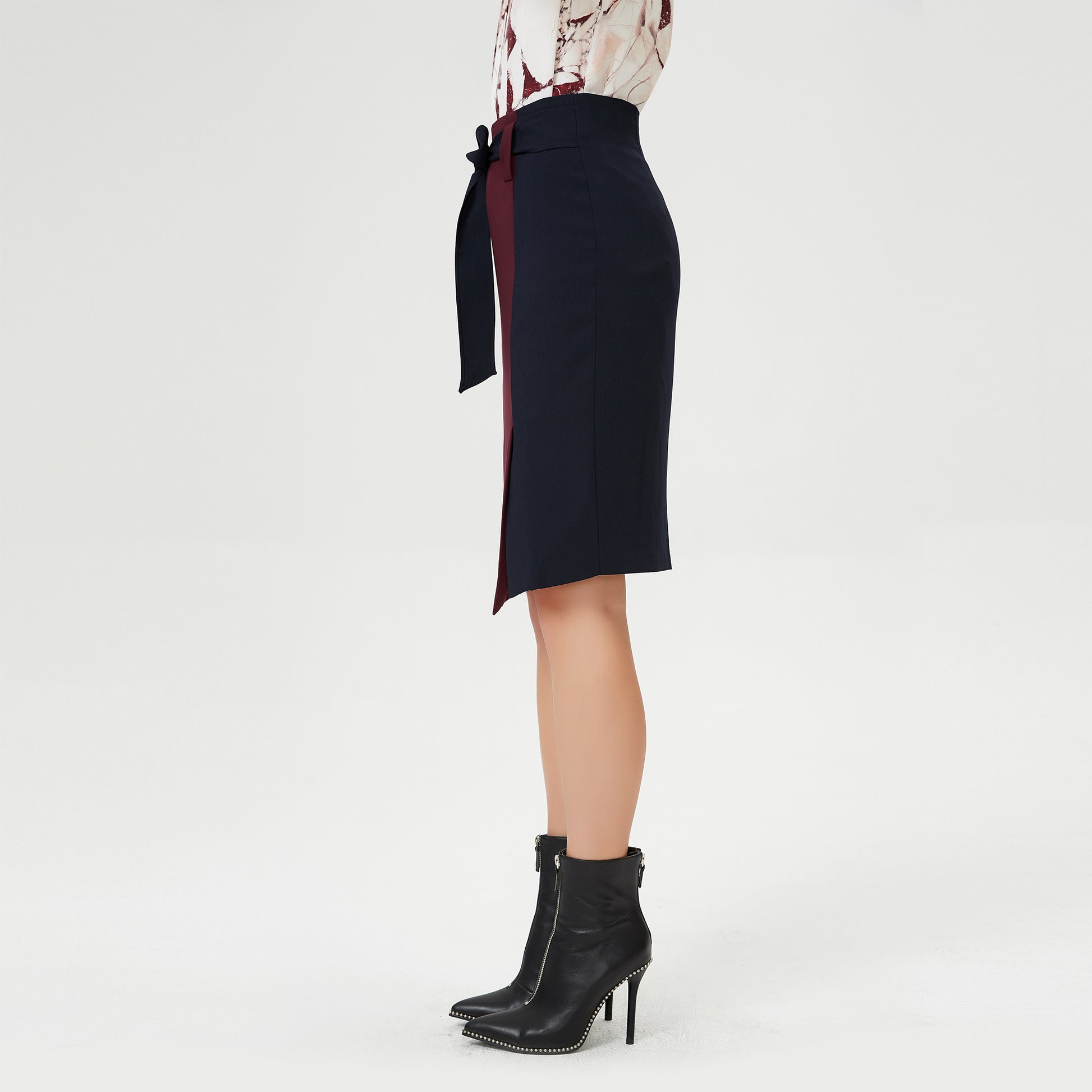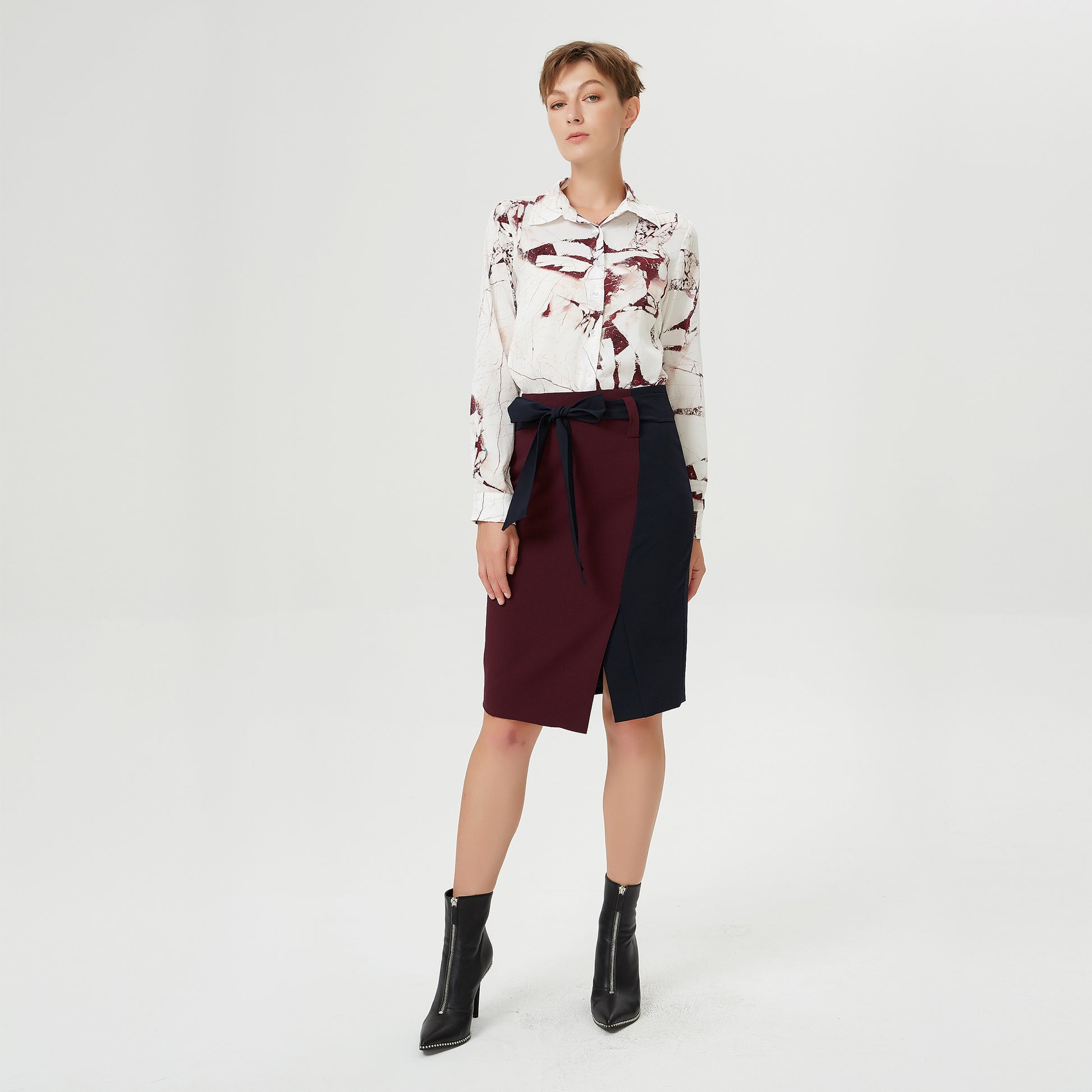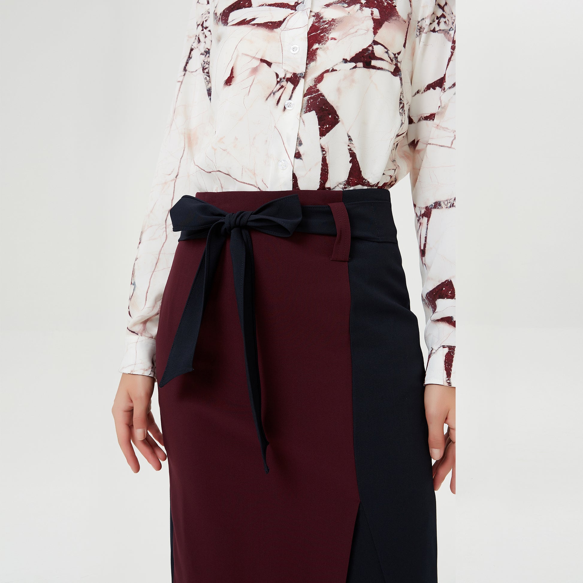 Cette jupe présente deux panneaux de couleurs différentes type portefeuille s’ouvrant sur une fente. Agrémentée d’une ceinture à nouer, elle est pièce qui attire l’attention et peut ainsi se porter avec un top très simple. Peut également s’associer à notre « Chemise droite à imprimé effet marbre » pour un look plus sophistiqué.