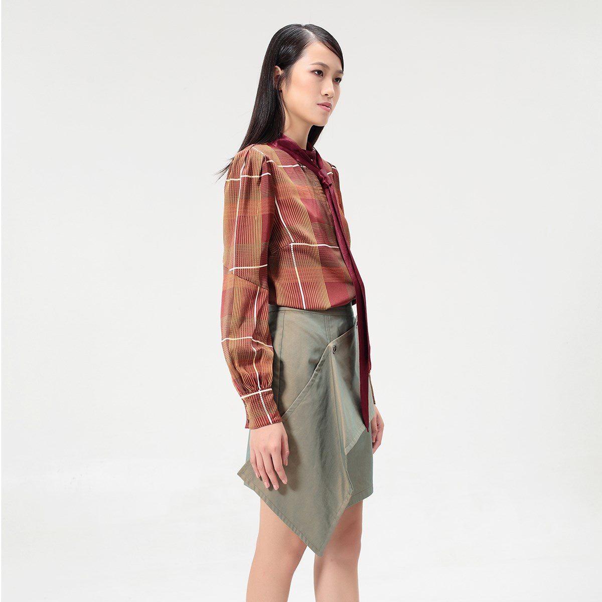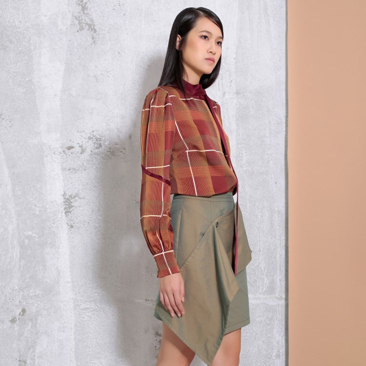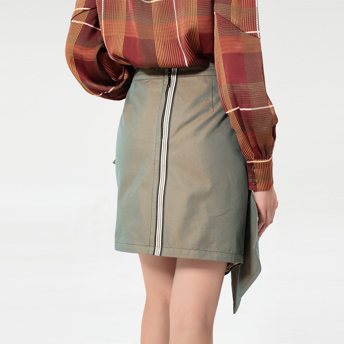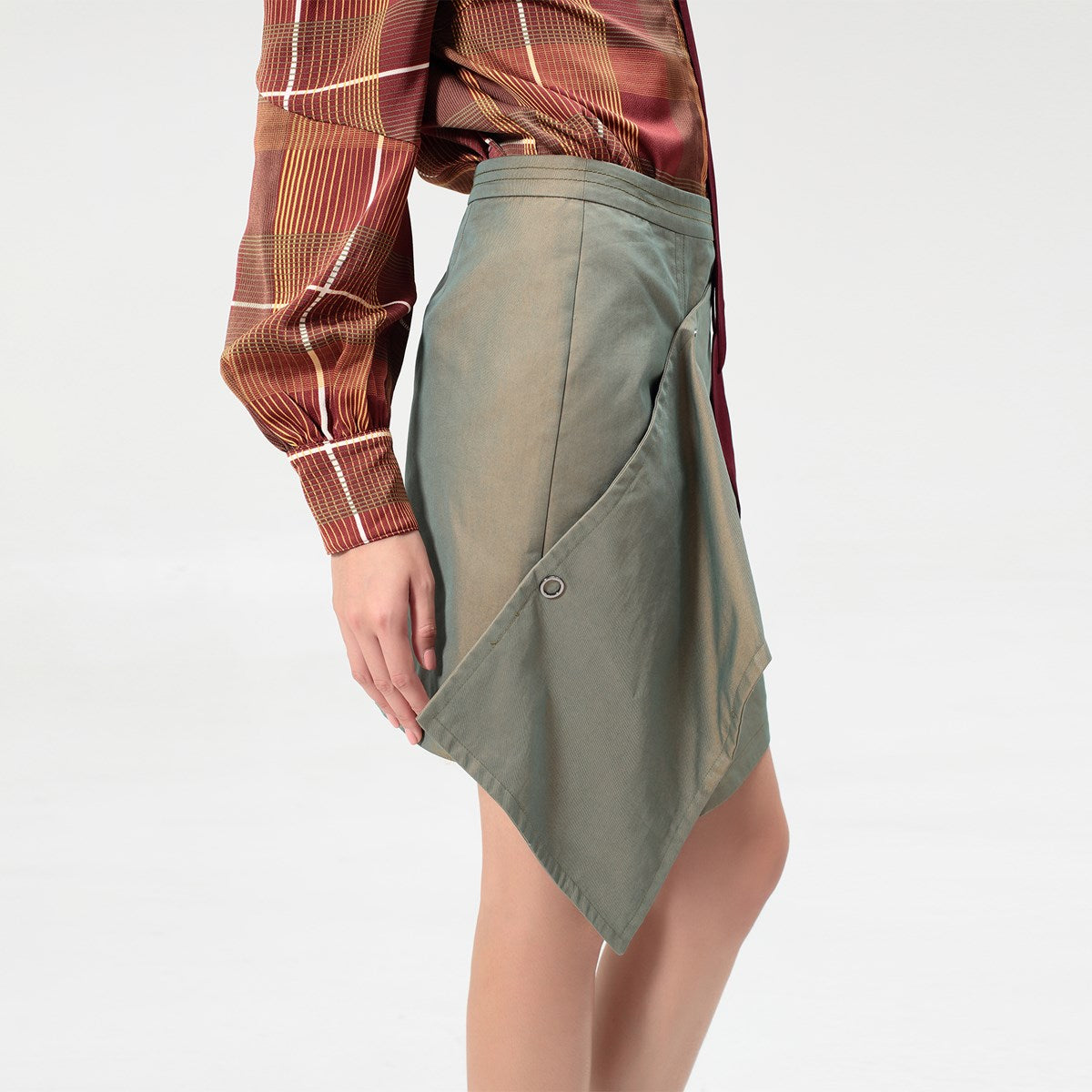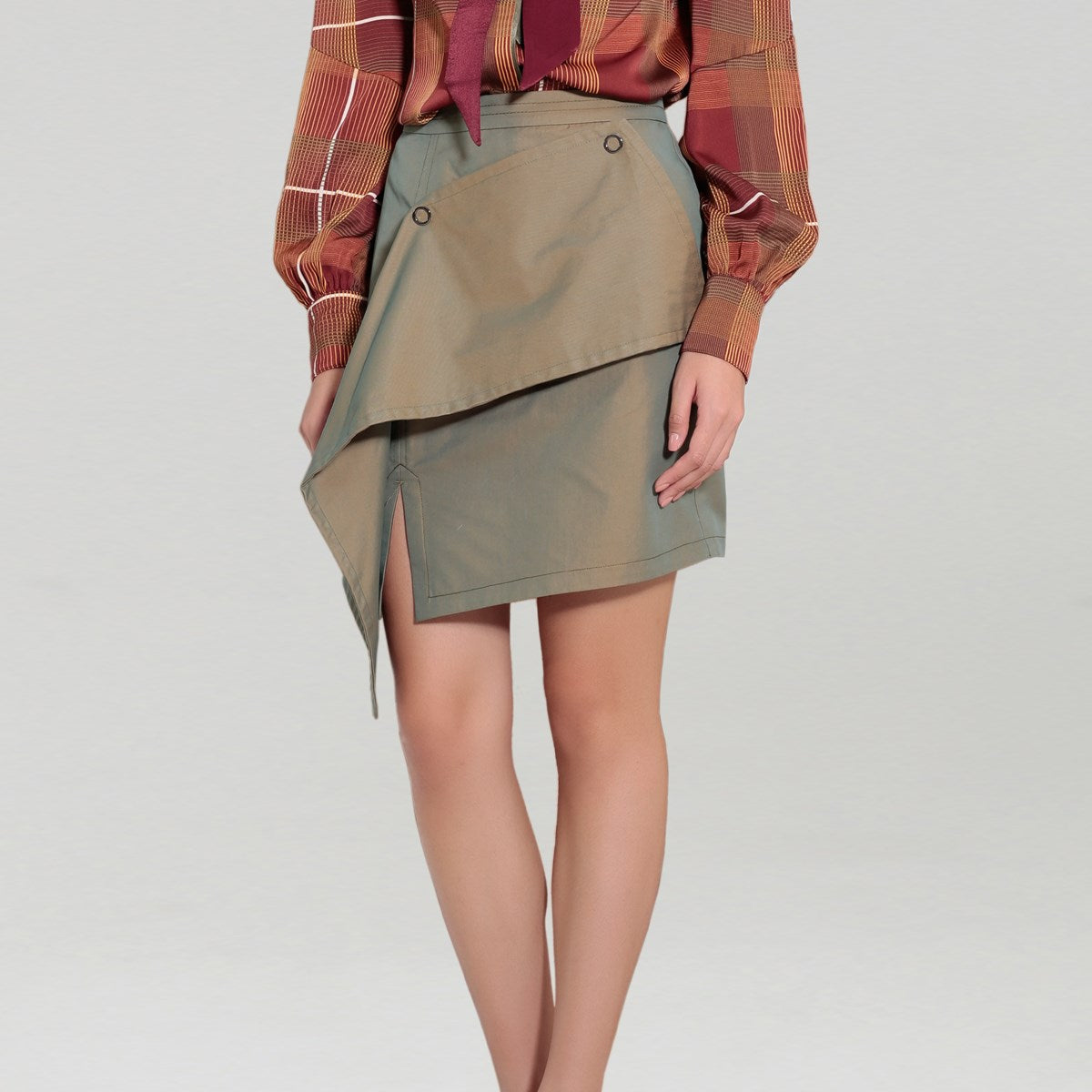 Une pièce originale , structurée et asymétrique qui se compose d’un panneau amovible grâce à des pression sur le devant. La jupe de dessous offre une coupe classique et droite, agrémentée d’un ruban sur le milieu dos. Facile à associer avec chemise, blouse et t-shirts….