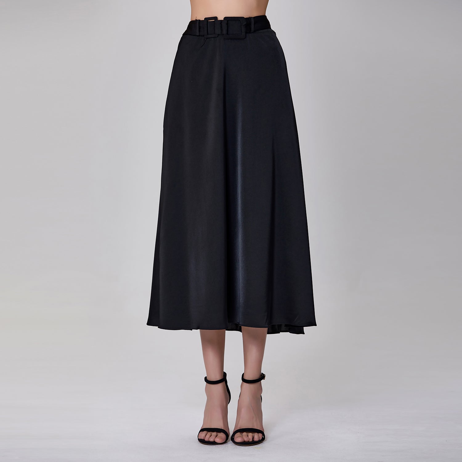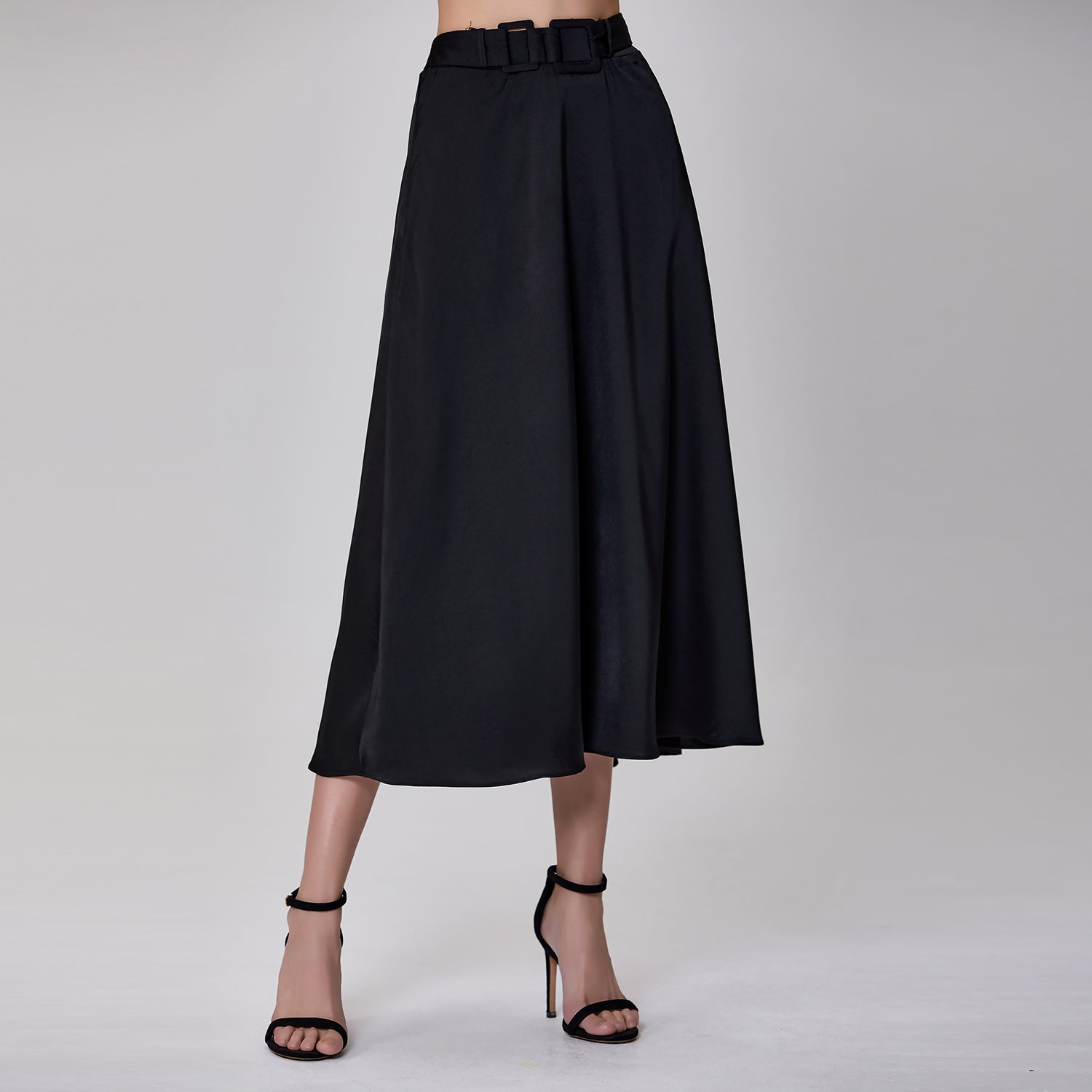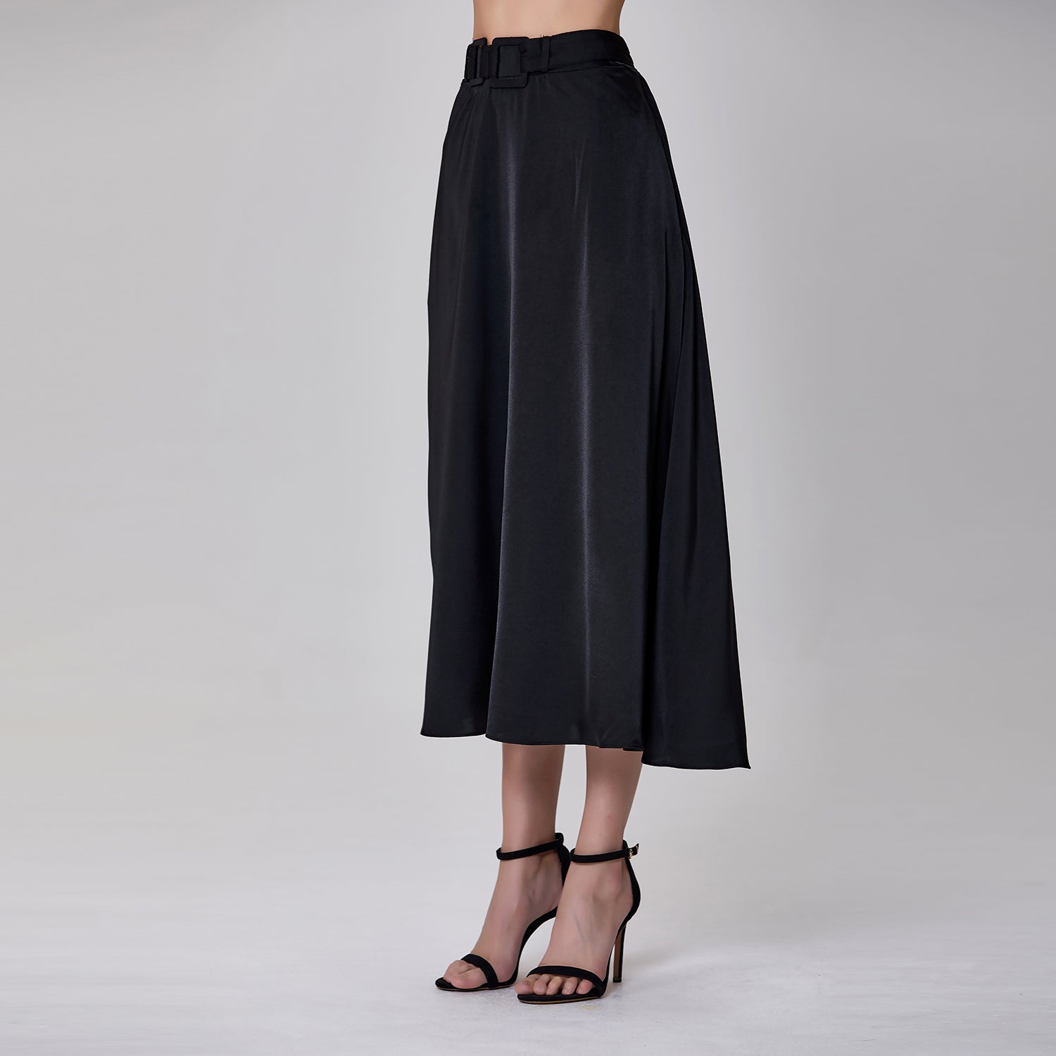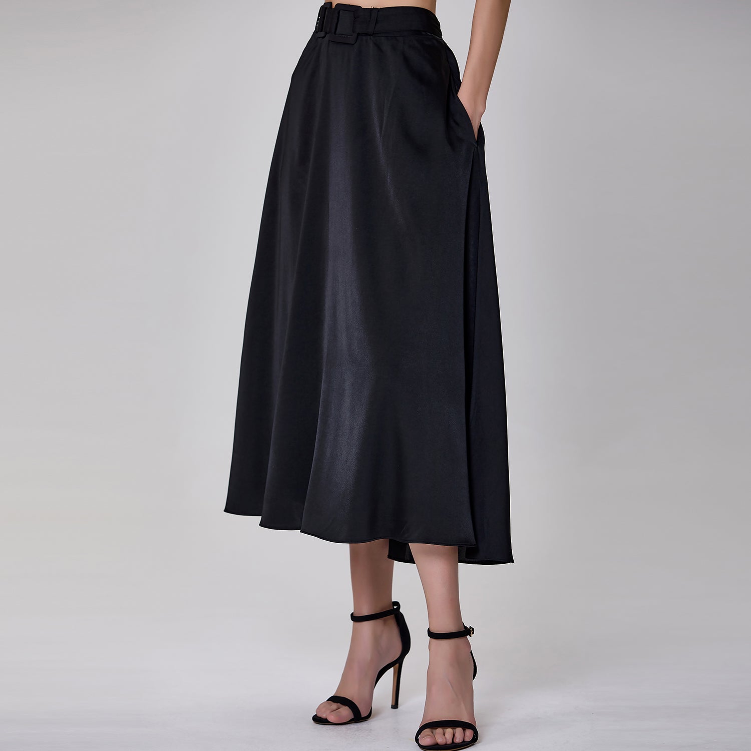 Cette jupe incarne une élégance moderne grâce à sa coupe fluide et légèrement évasée. Le tissu satiné ajoute une touche de raffinement, et la taille est rehaussée d'une ceinture ton sur ton avec une boucle carrée. Les poches latérales apportent une note pratique sans compromettre l'esthétique. Idéale pour des occasions professionnelles ou semi-formelles, cette pièce se marie parfaitement avec des chemisiers ou des pulls ajustés, et des bottines ou escarpins.
