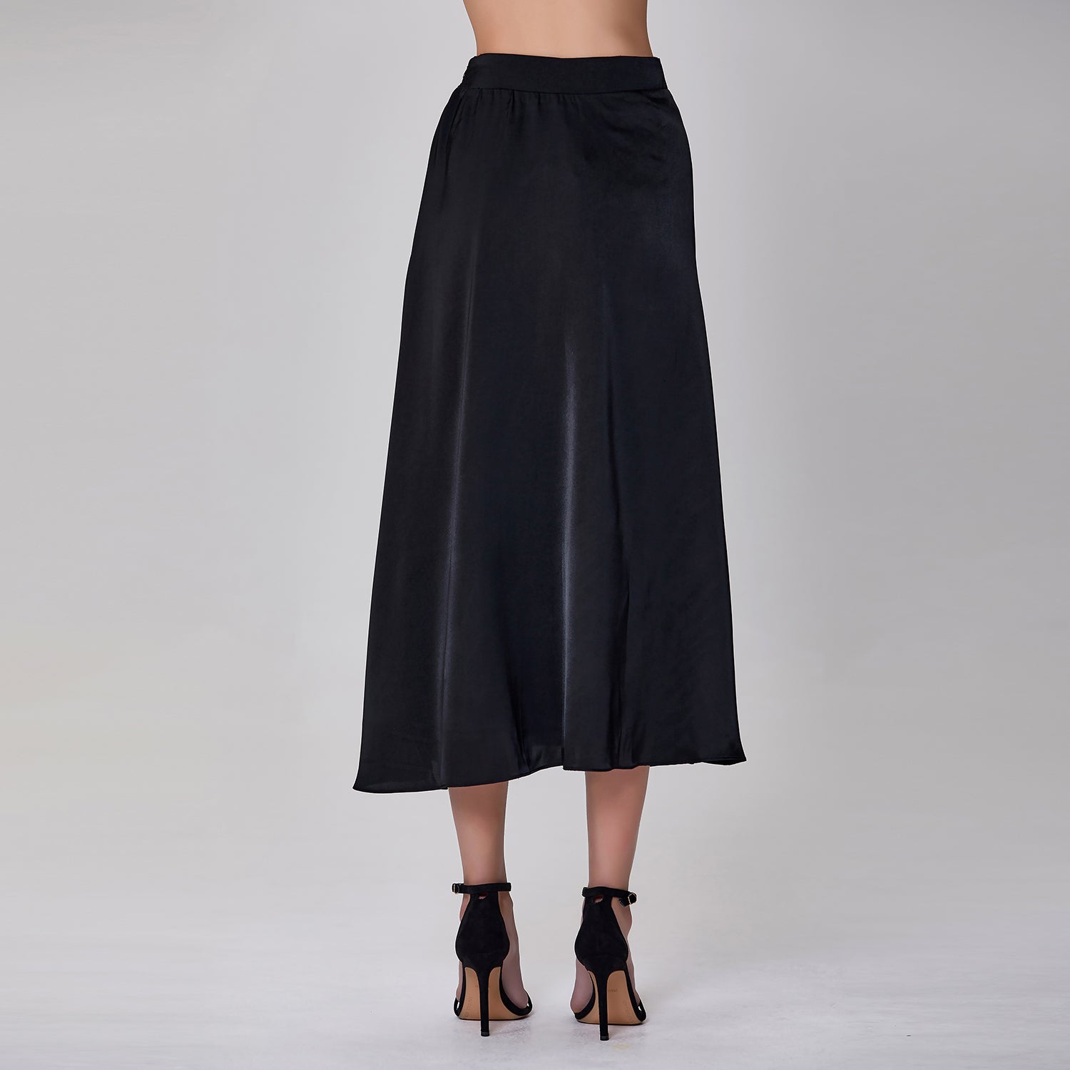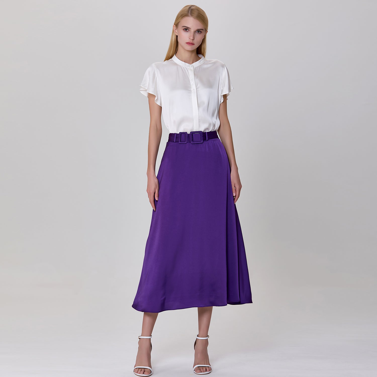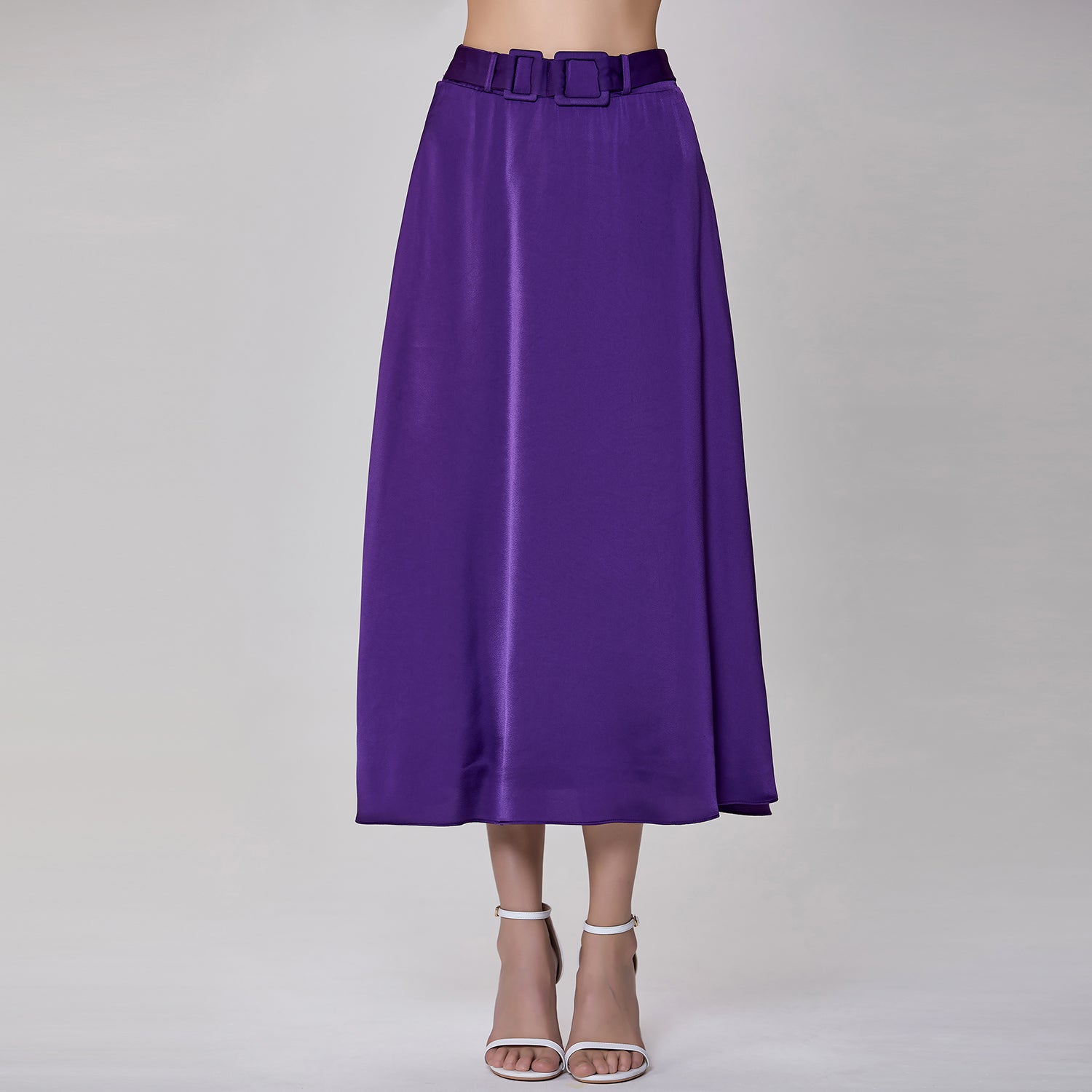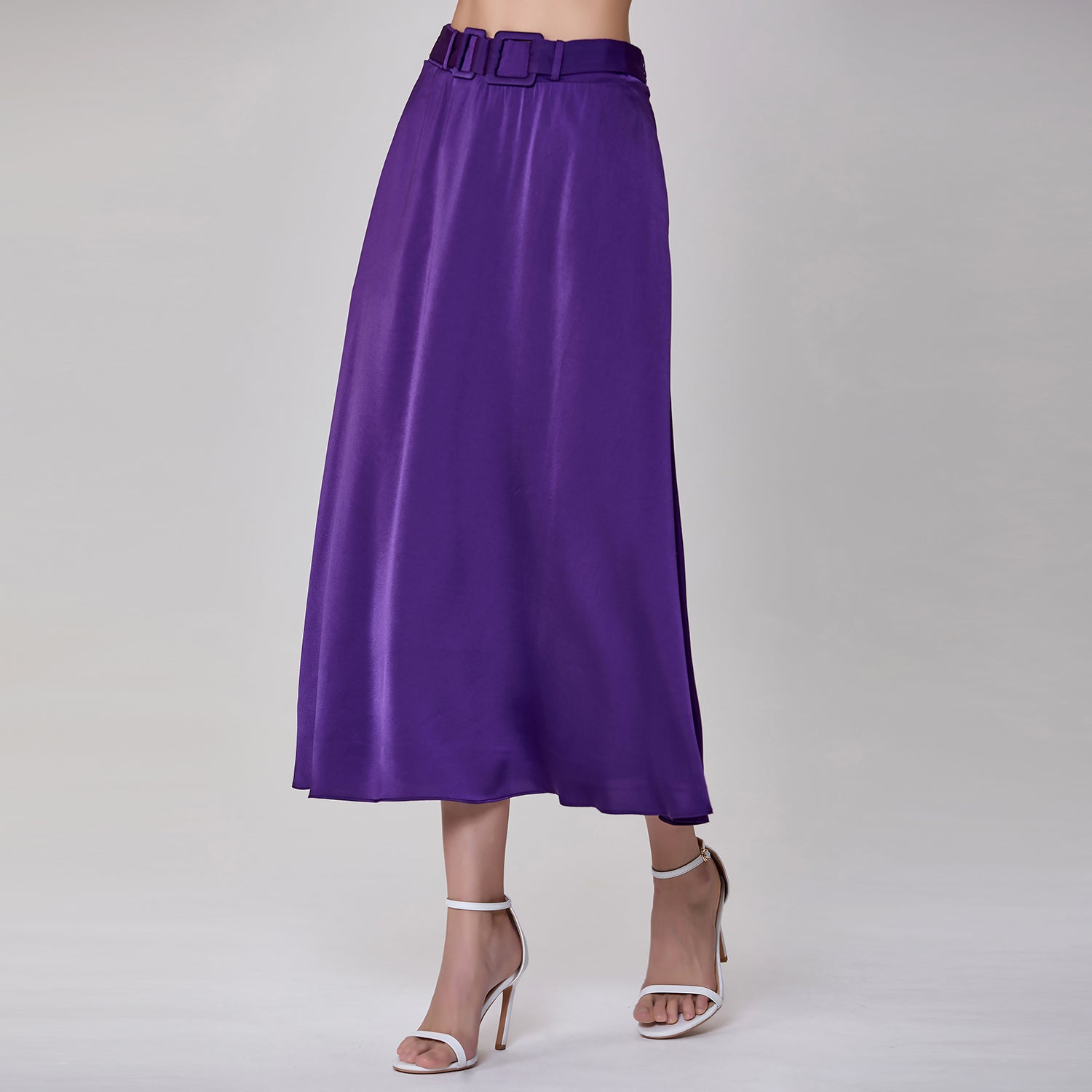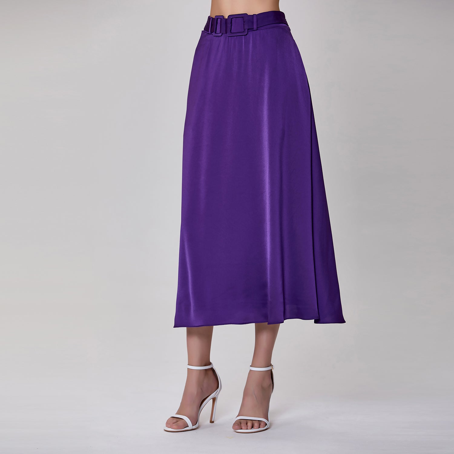 Cette jupe incarne une élégance moderne grâce à sa coupe fluide et légèrement évasée. Le tissu satiné ajoute une touche de raffinement, et la taille est rehaussée d'une ceinture ton sur ton avec une boucle carrée. Les poches latérales apportent une note pratique sans compromettre l'esthétique. Idéale pour des occasions professionnelles ou semi-formelles, cette pièce se marie parfaitement avec des chemisiers ou des pulls ajustés, et des bottines ou escarpins.