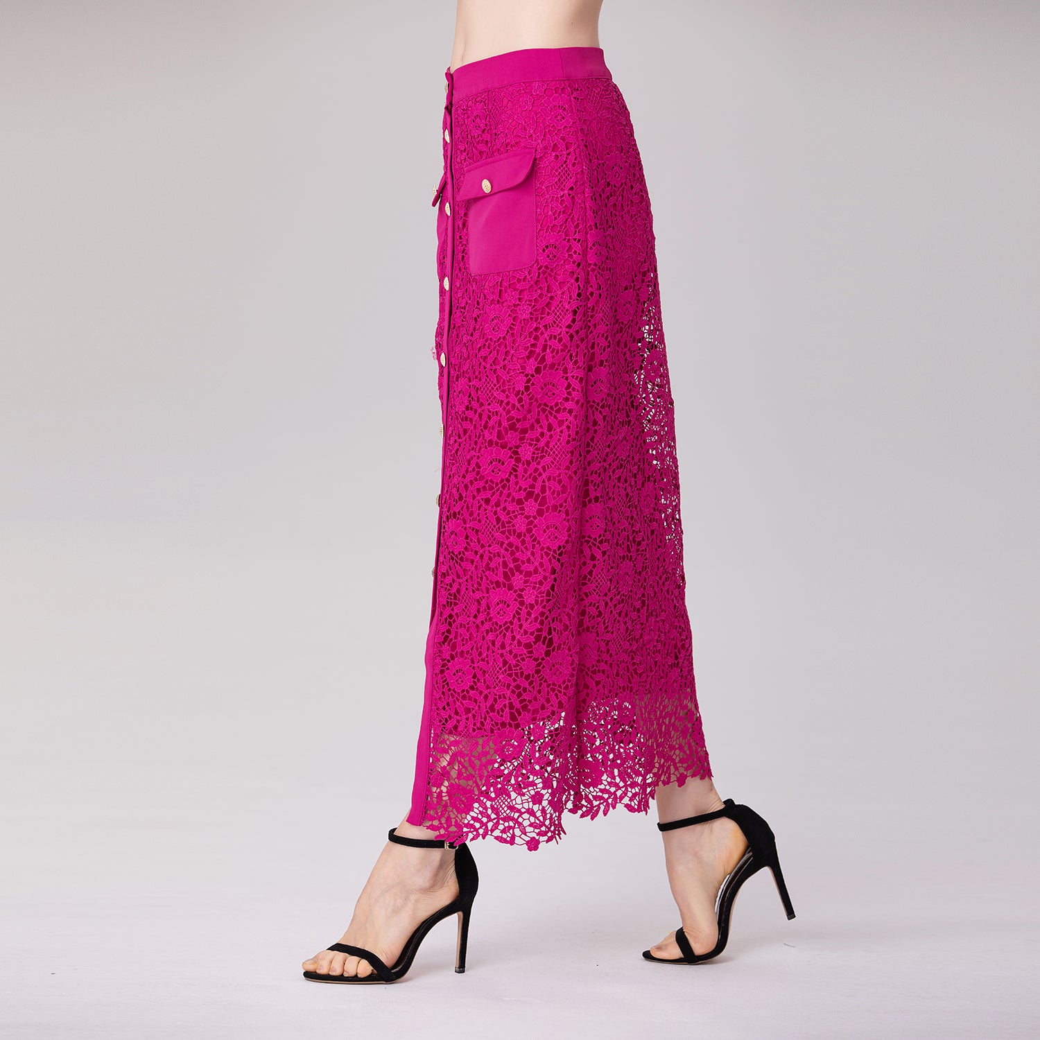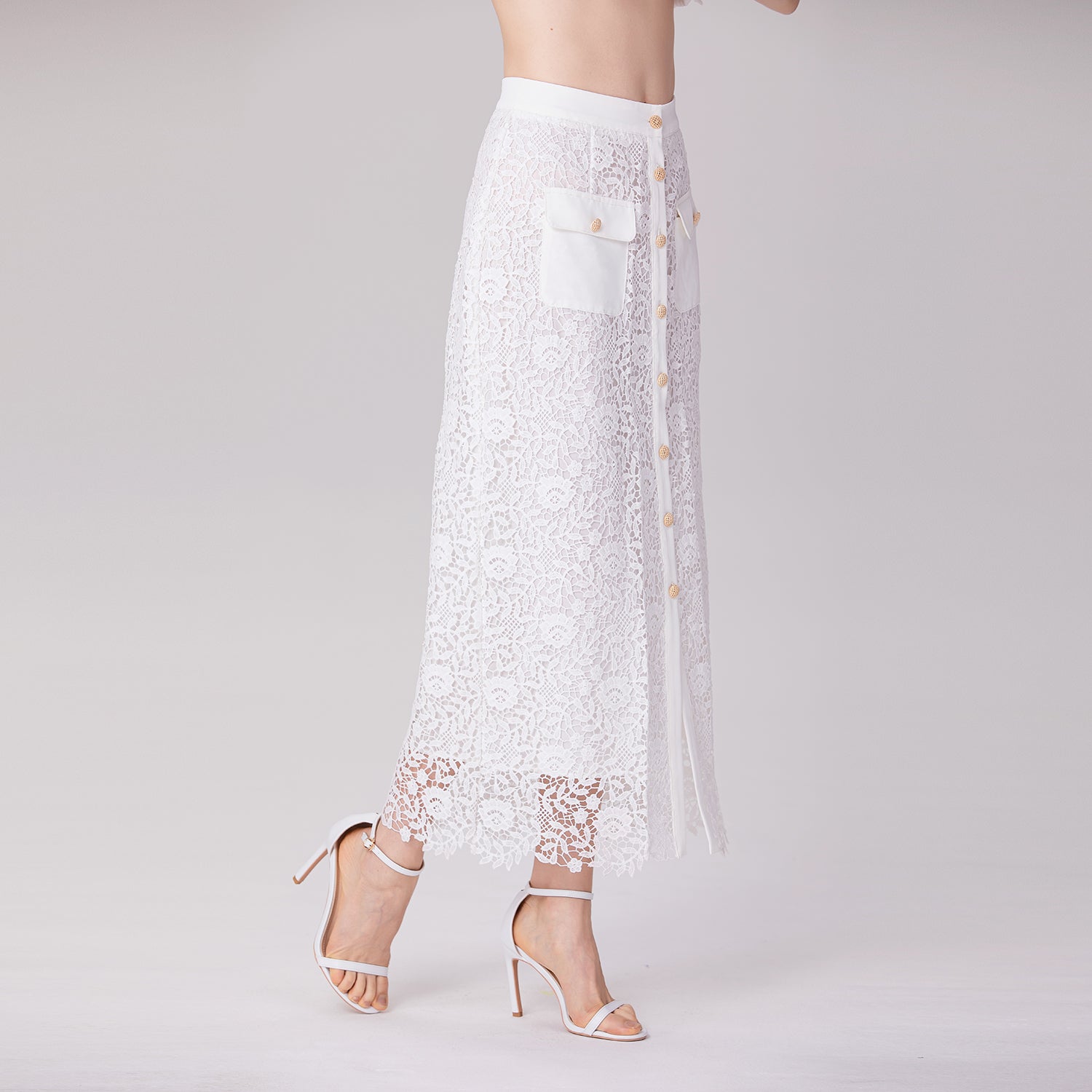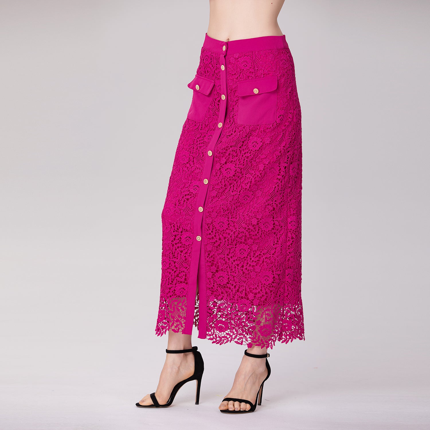 Une pièce qui sublime la féminité grâce à sa dentelle ajourée et sa silhouette longiligne. Cette jupe midi arbore des boutons dorés élégants en fermeture frontale. Les poches plaquées à rabat, ornées de boutons assortis, apportent une touche utilitaire tout en restant raffinées. La transparence subtile en bas de jupe, laissant apparaître délicatement les jambes, confère une allure à la fois chic et audacieuse. Idéale pour des occasions semi-formelles comme des garden-parties, des dîners ou des sorties en soirée.