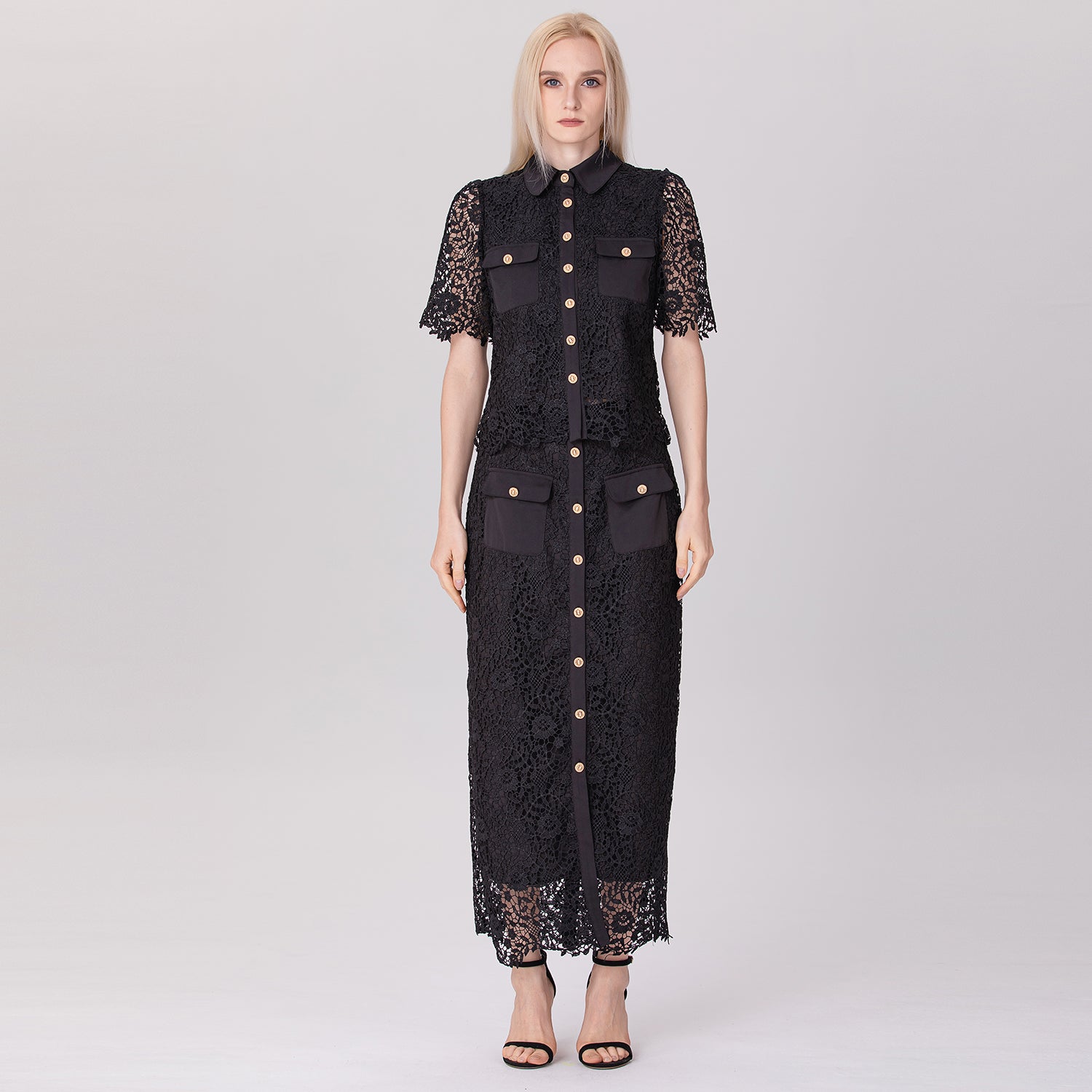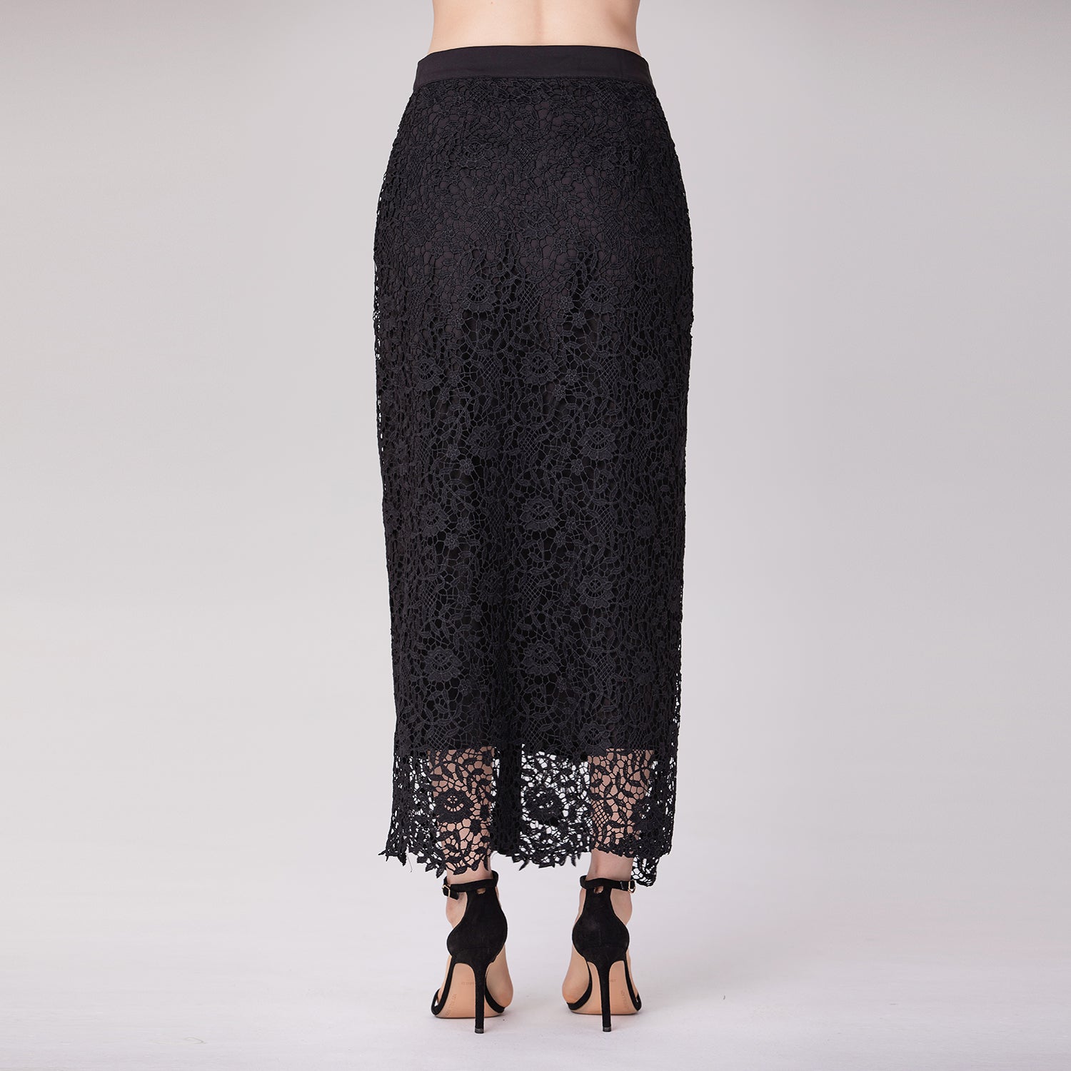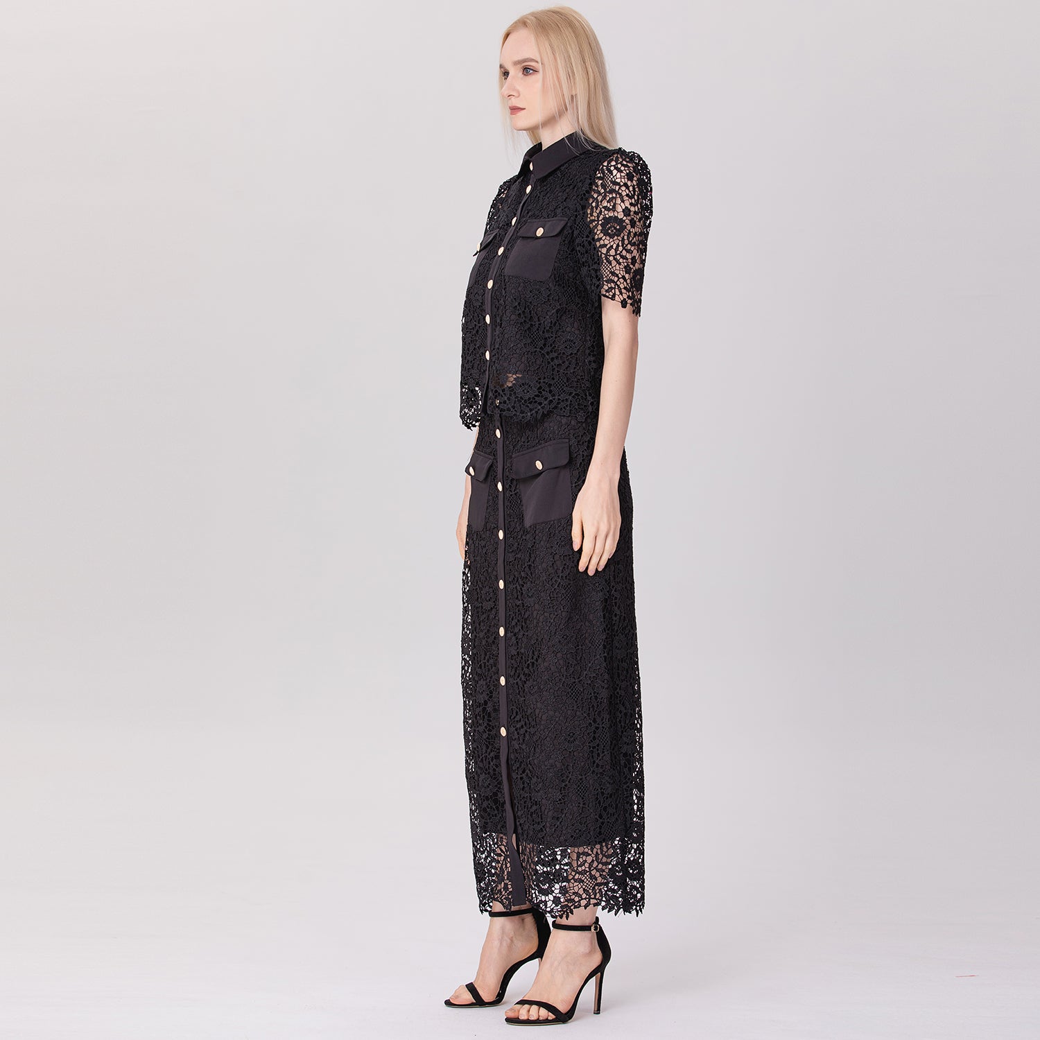 Une pièce qui sublime la féminité grâce à sa dentelle ajourée et sa silhouette longiligne. Cette jupe midi arbore des boutons dorés élégants en fermeture frontale. Les poches plaquées à rabat, ornées de boutons assortis, apportent une touche utilitaire tout en restant raffinées. La transparence subtile en bas de jupe, laissant apparaître délicatement les jambes, confère une allure à la fois chic et audacieuse. Idéale pour des occasions semi-formelles comme des garden-parties, des dîners ou des sorties en soirée.
