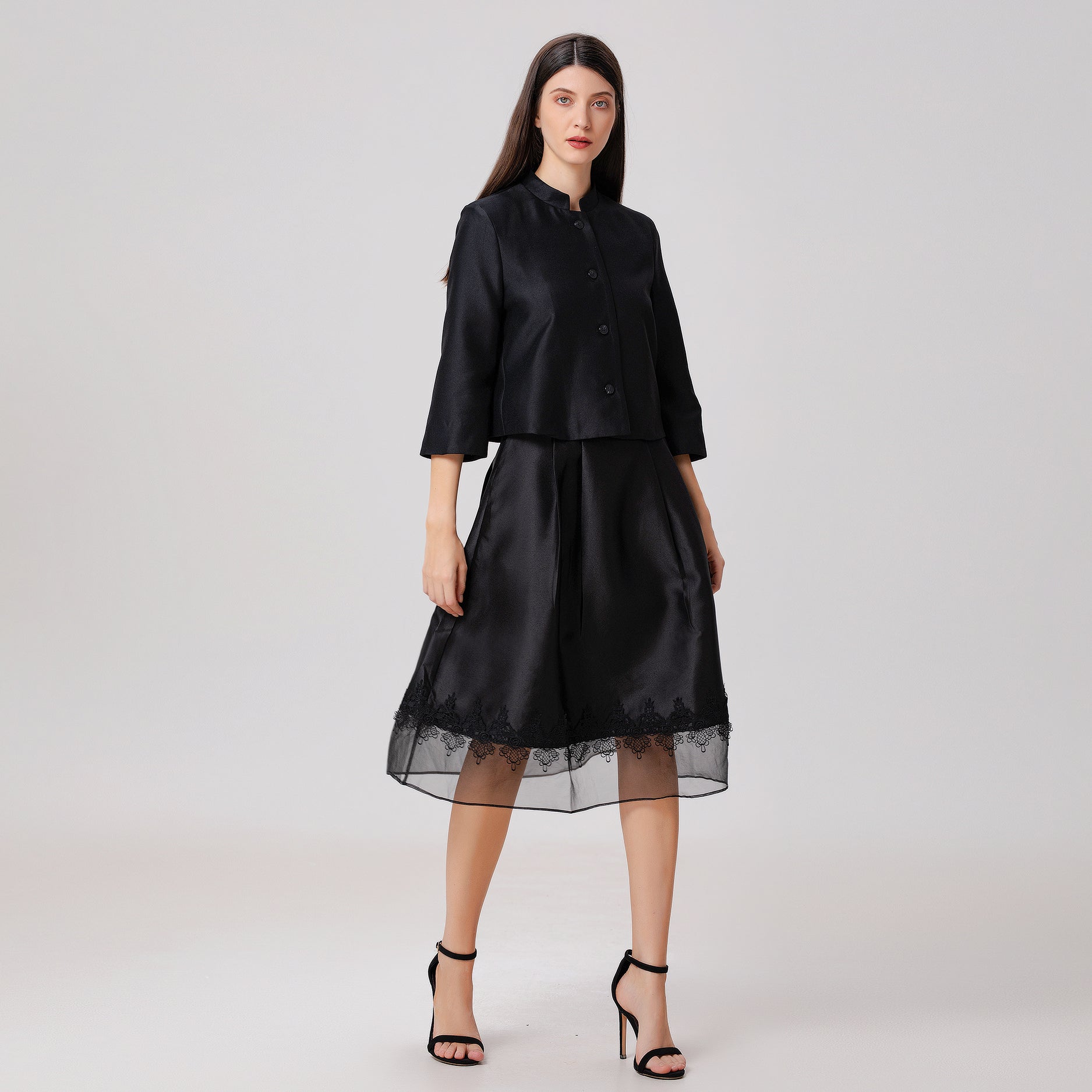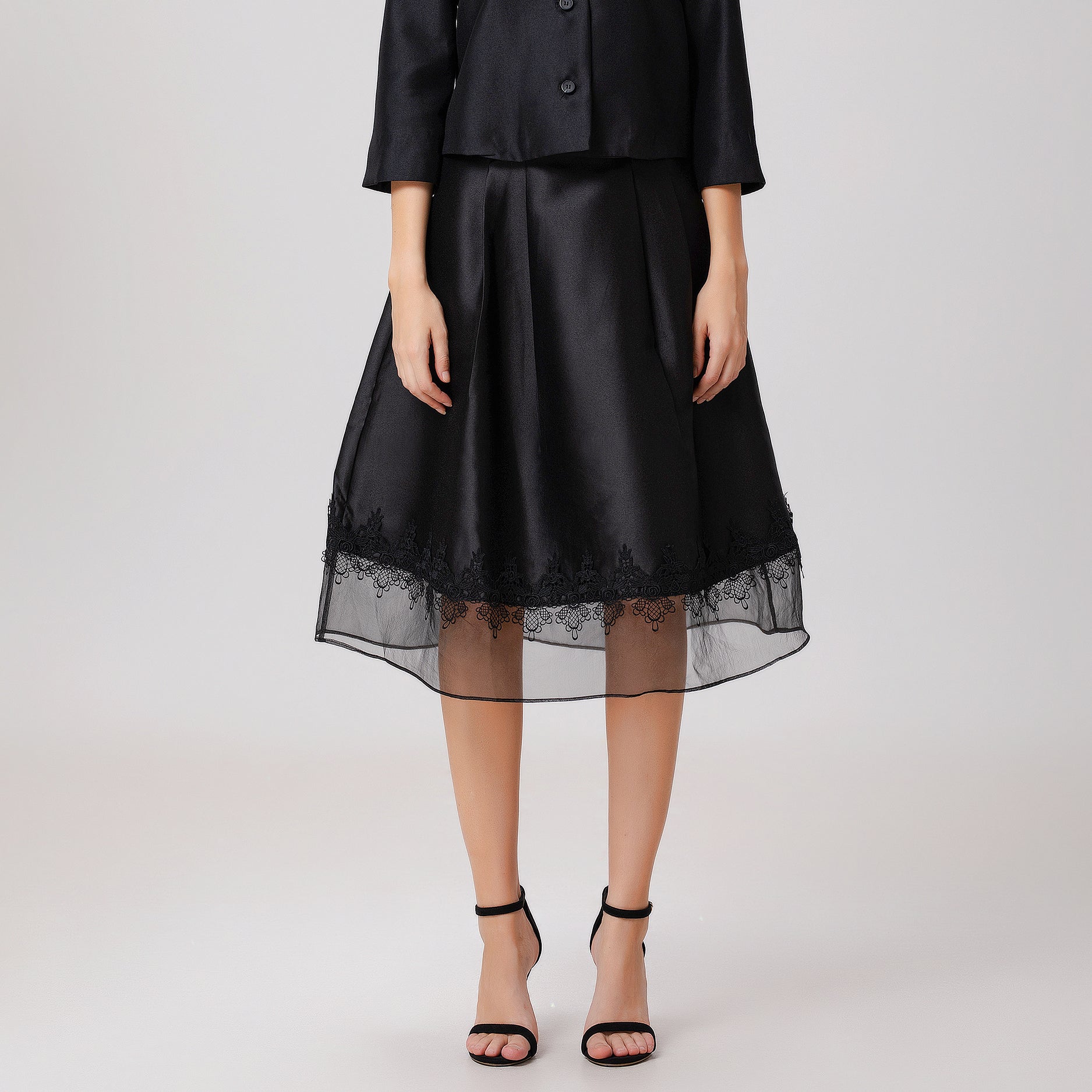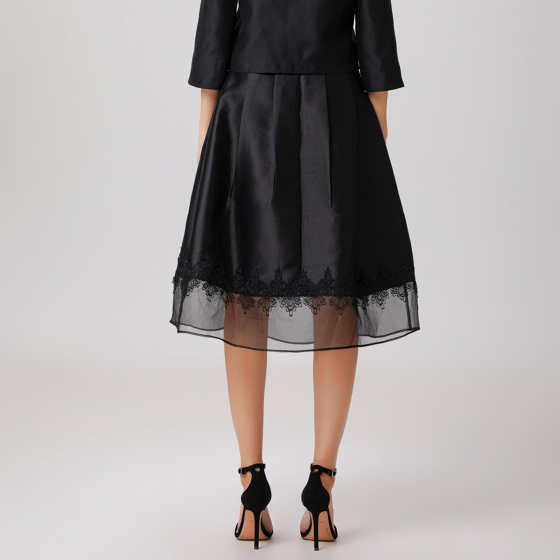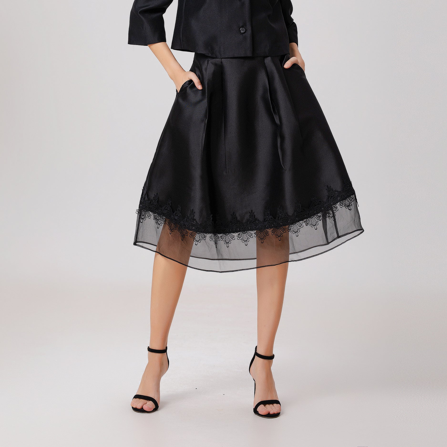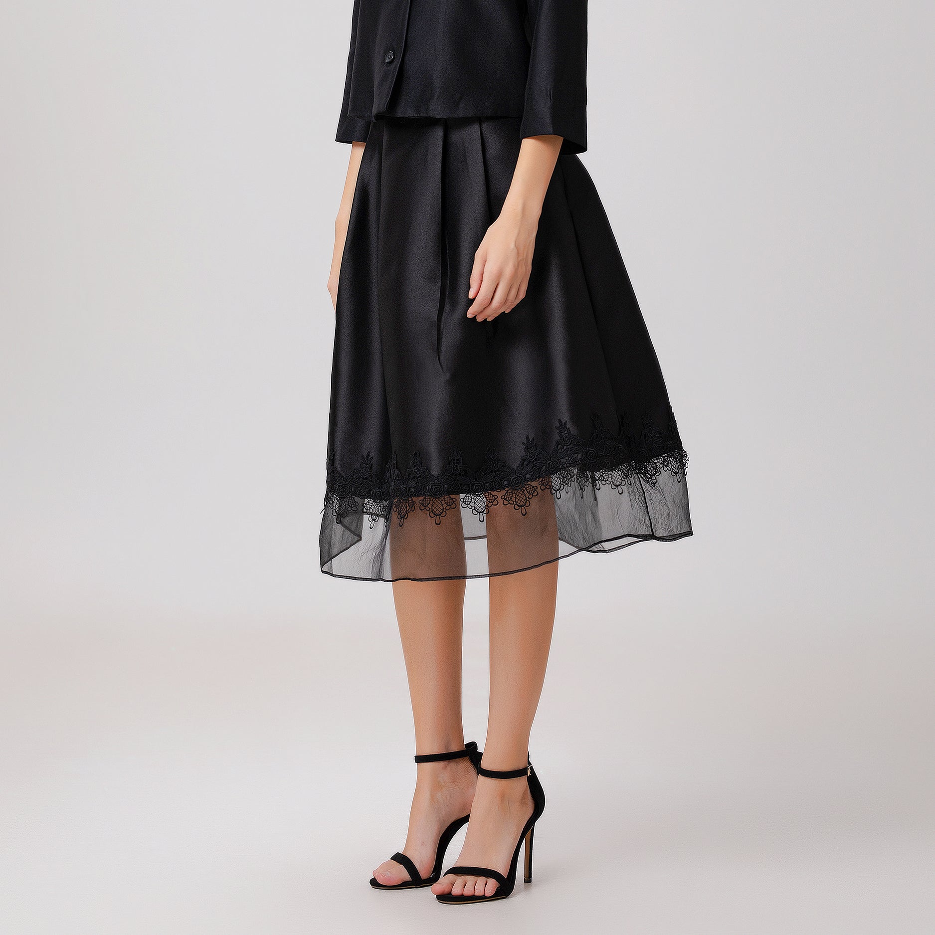 Une pièce sophistiquée au volume évasée, cette jupe présente un mélange de matières subtil : taffetas sur la partie haute, voile d’organza en guise de large ourlet et galon de dentelle entre les deux. Elle conviendra à des occasions semi-formelles telles que des mariages, réceptions ou sorties. Se porte aussi bien au printemps avec des escarpins qu’à l’automne avec collants et bottines.