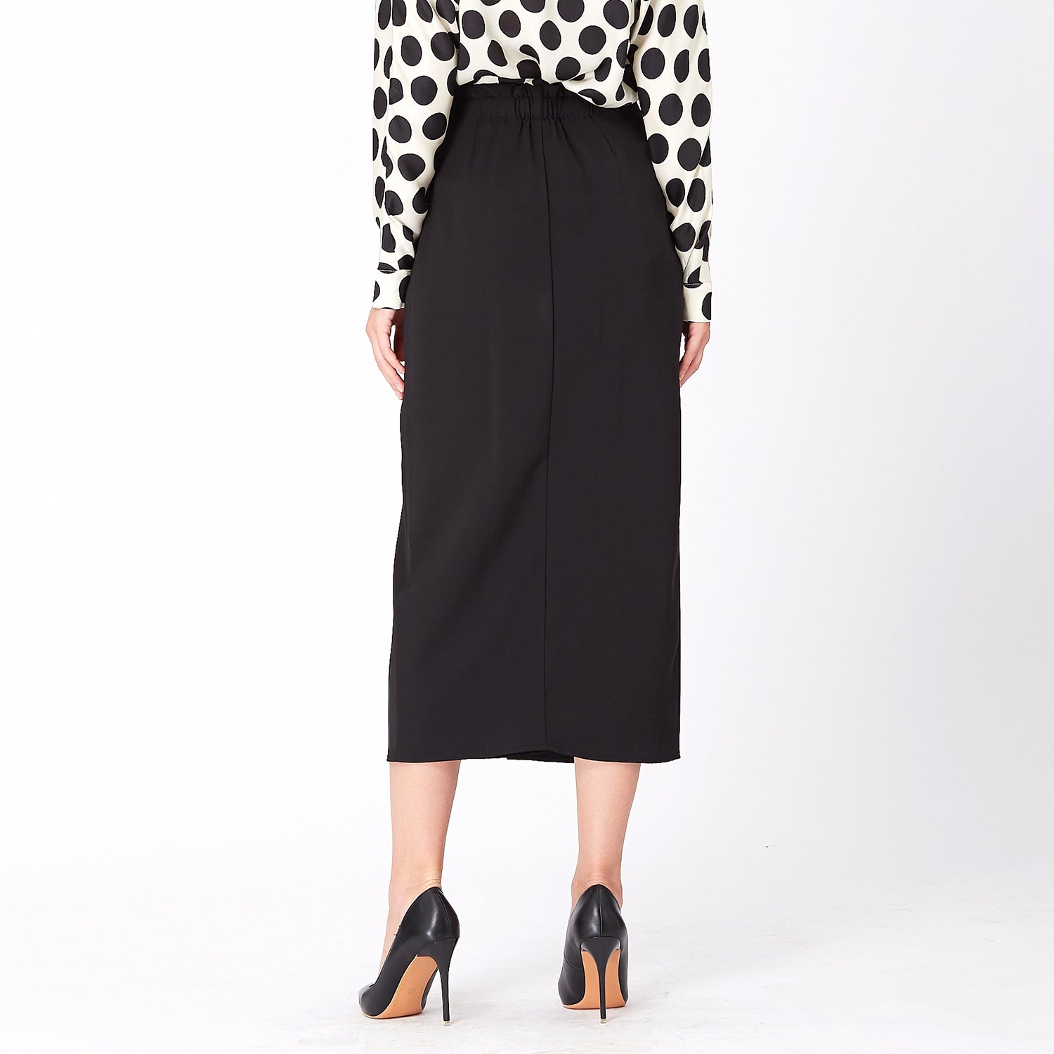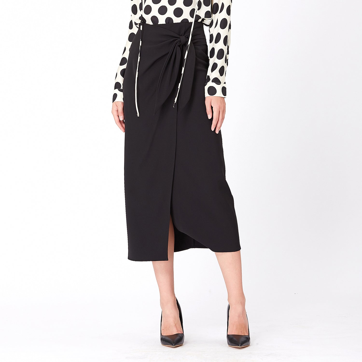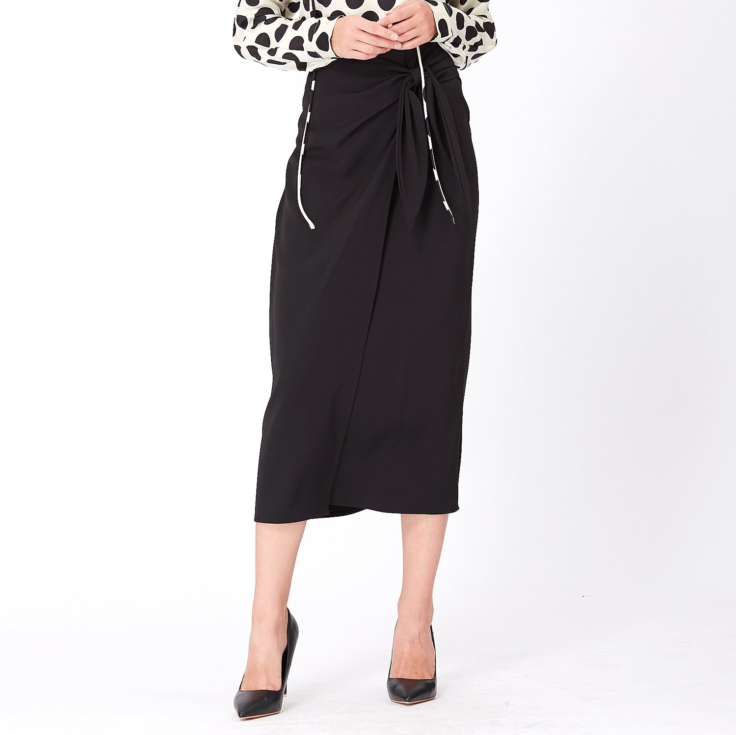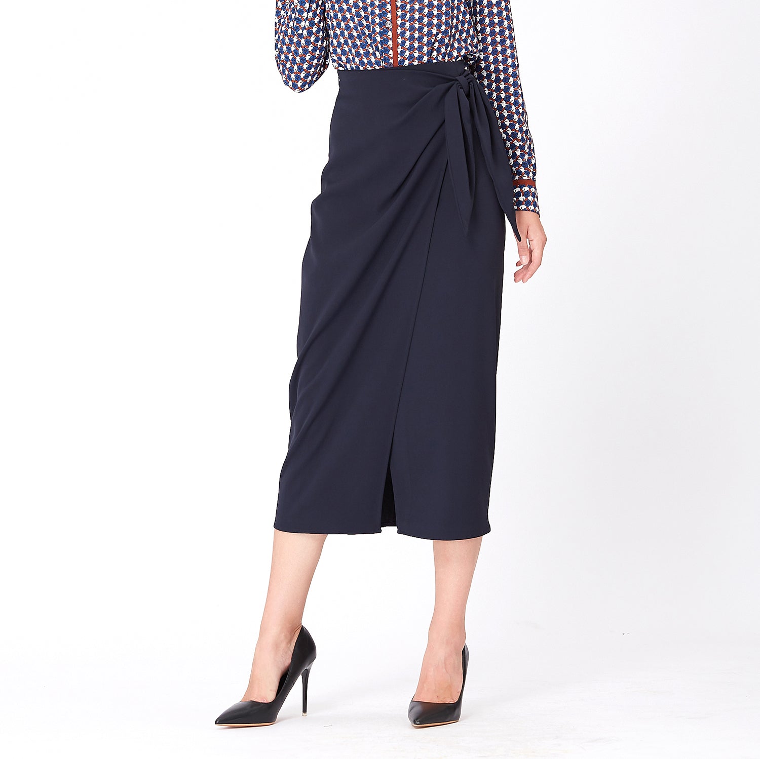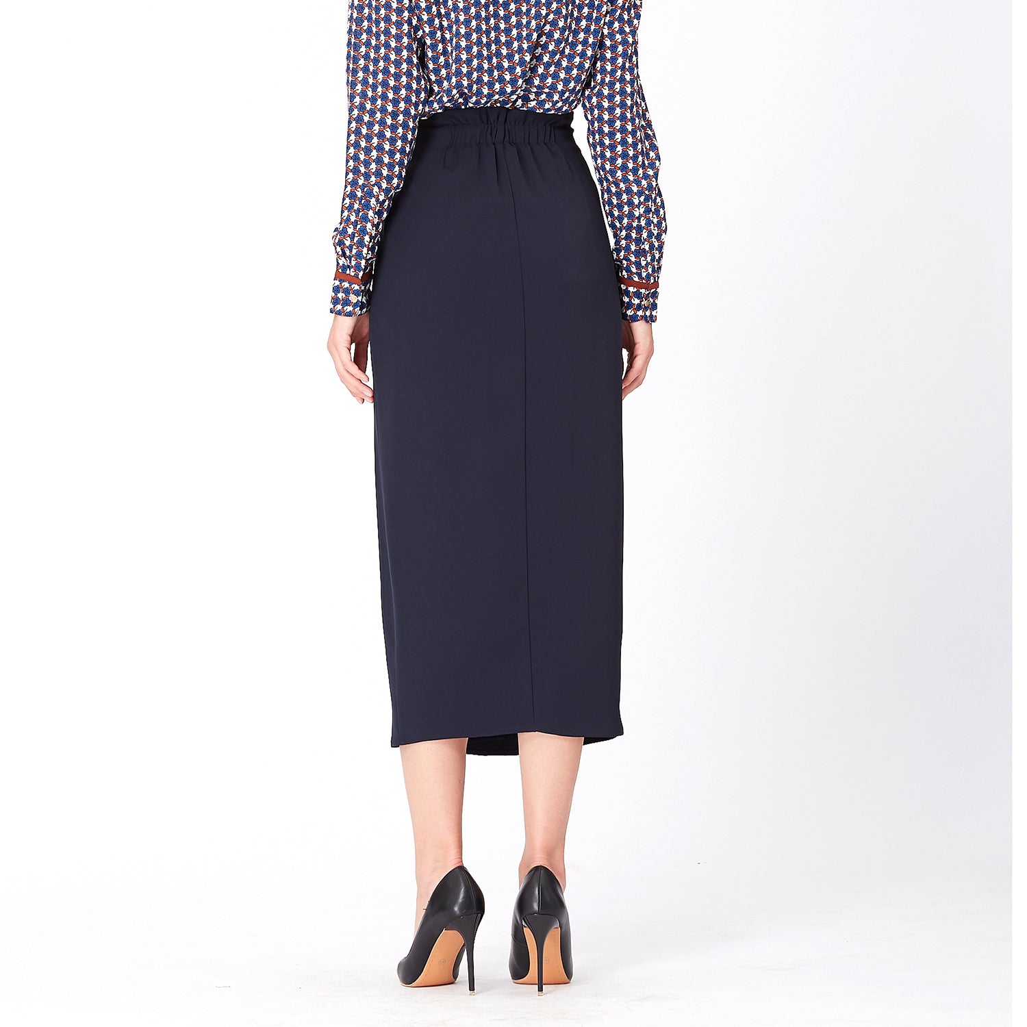 Une pièce à la fois originale par son panneau drapé au coté finissant par un nœud au côté et élégante par sa taille haute ajustée et sa coupe droite. Un élastique au dos assure une tenue de la jupe. A porter avec blouse ou chemise simple, idéale pour le bureau ou une sortie chic.