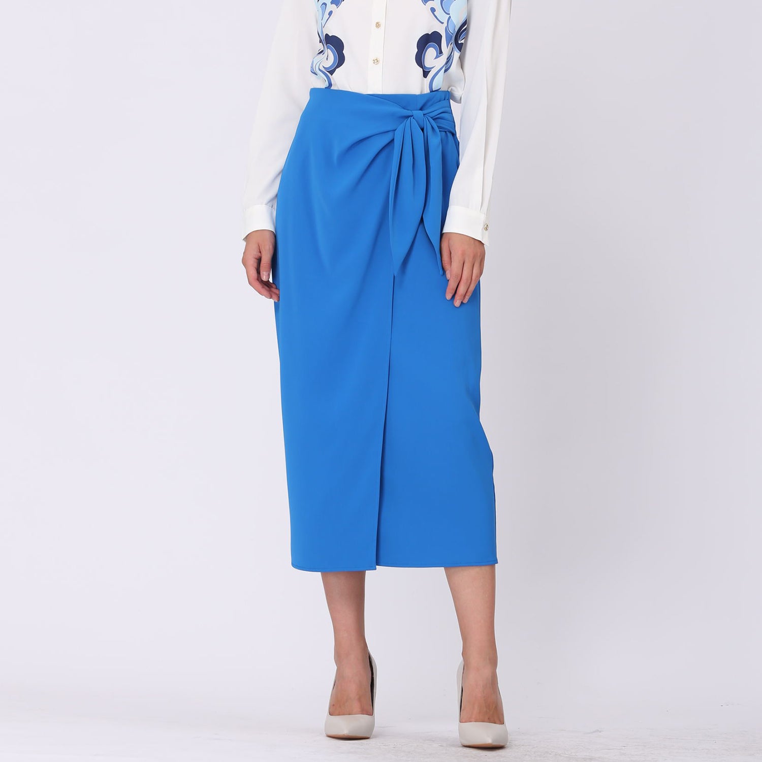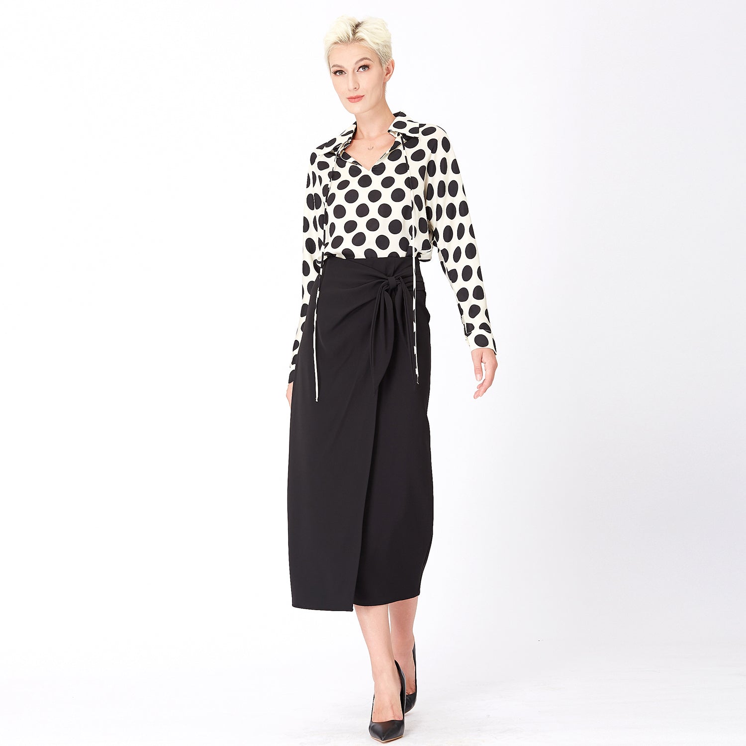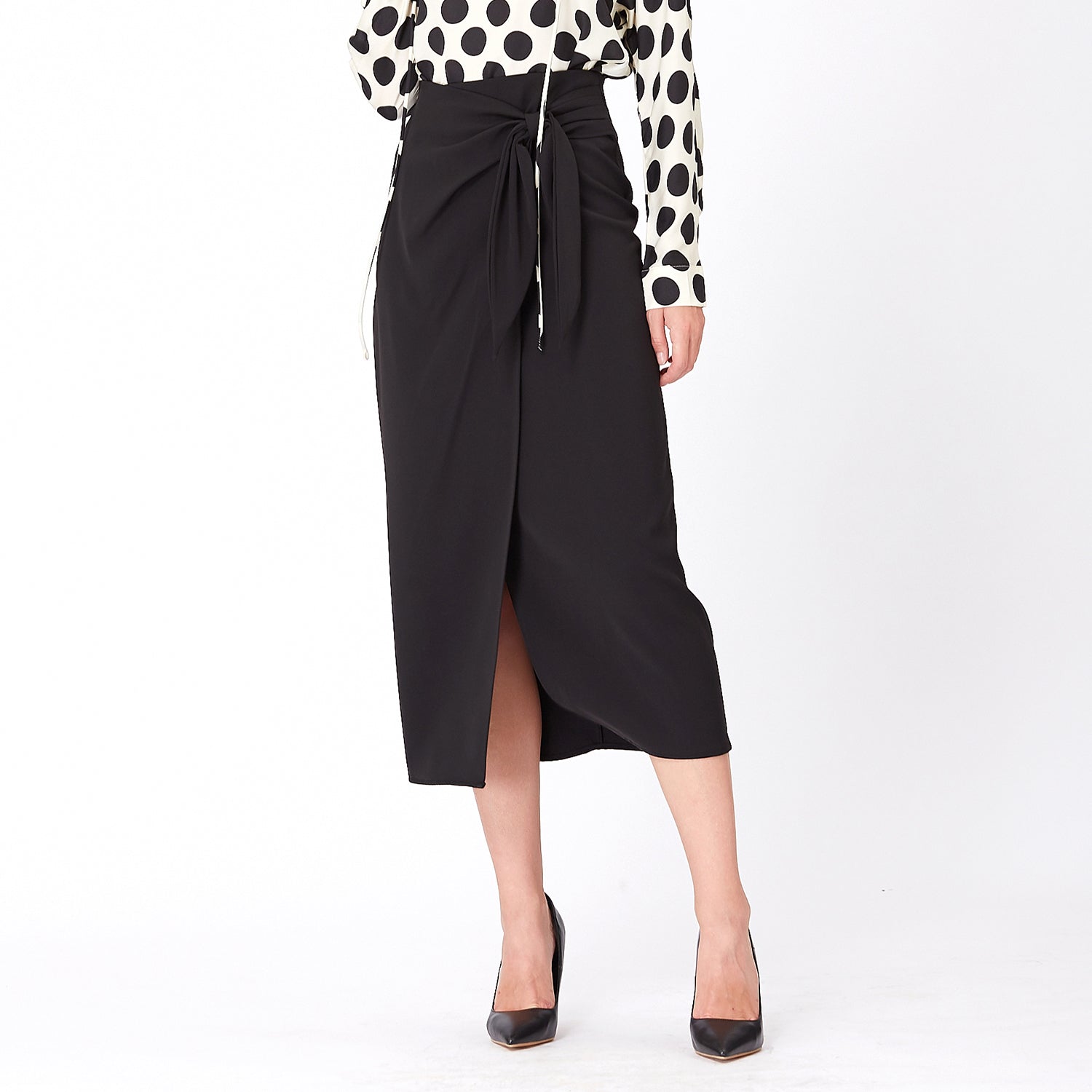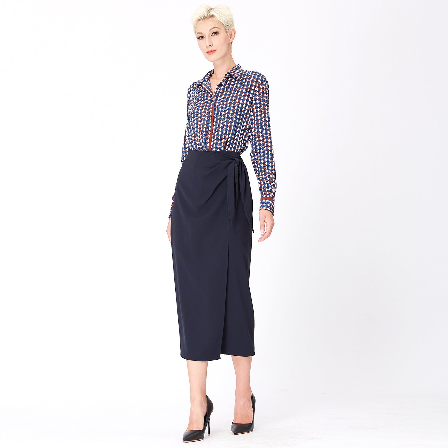 Une pièce à la fois originale par son panneau drapé au coté finissant par un nœud au côté et élégante par sa taille haute ajustée et sa coupe droite. Un élastique au dos assure une tenue de la jupe. A porter avec blouse ou chemise simple, idéale pour le bureau ou une sortie chic.