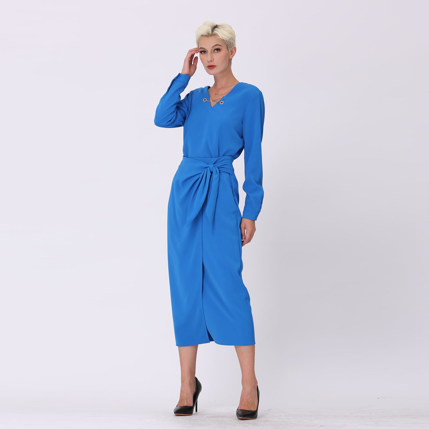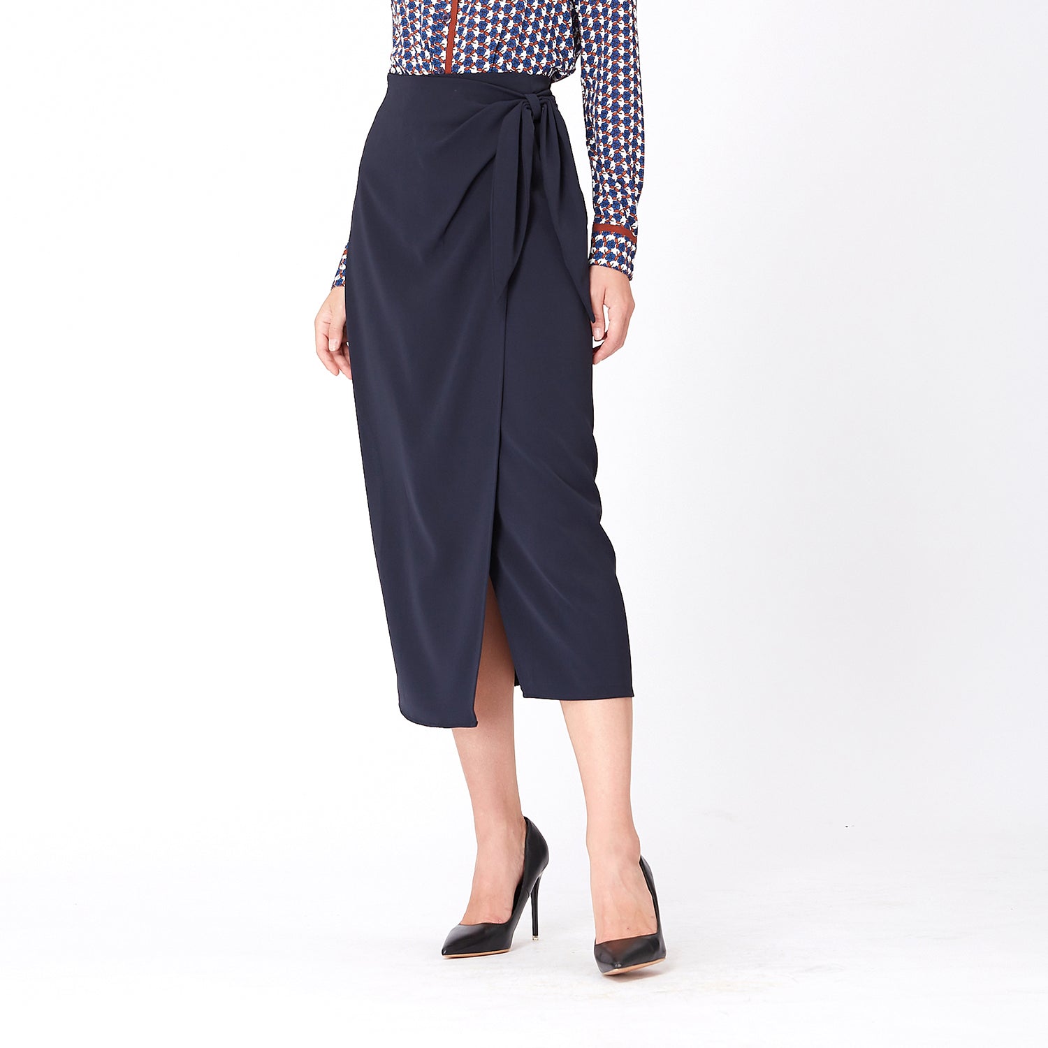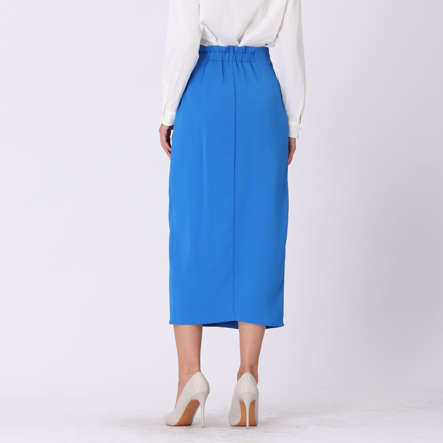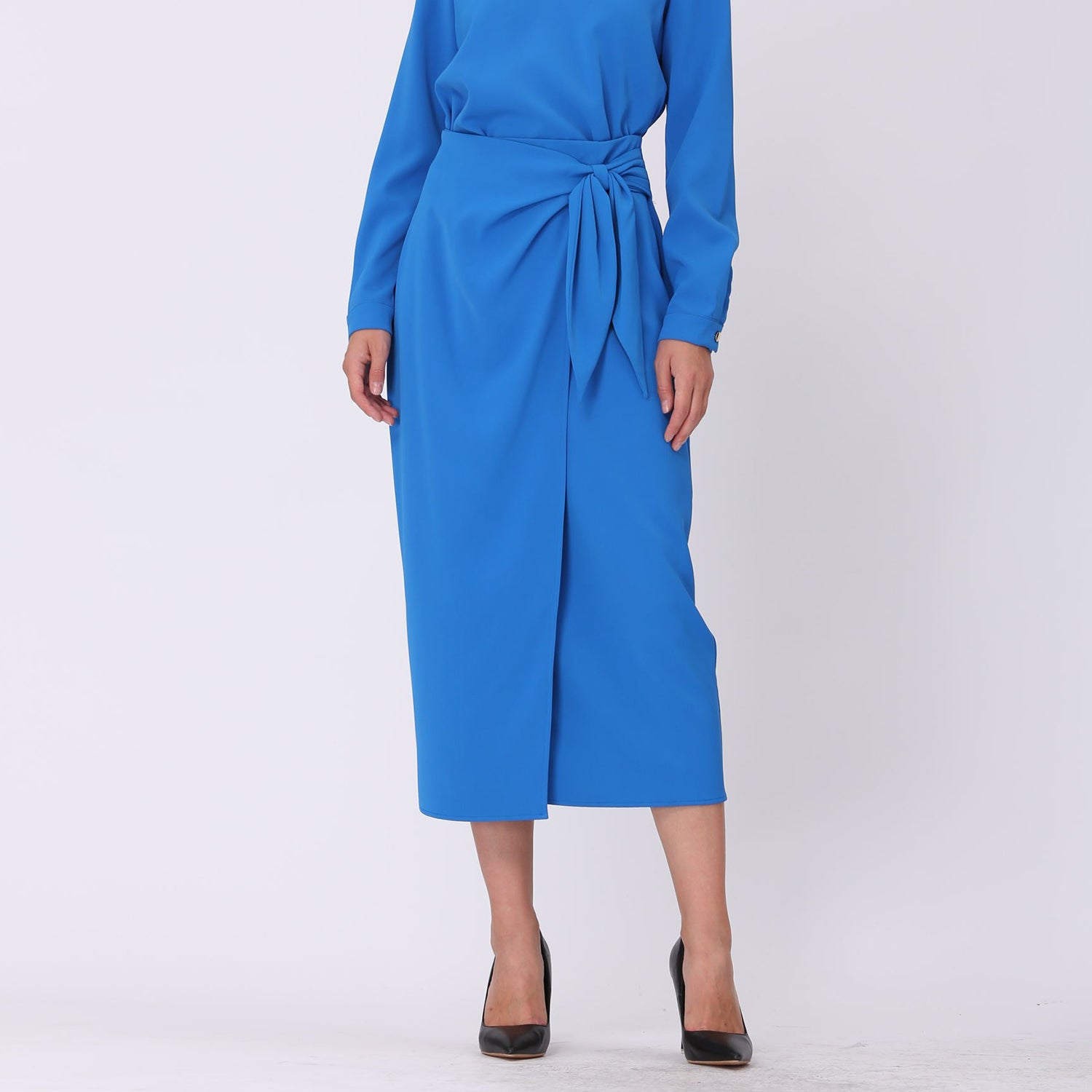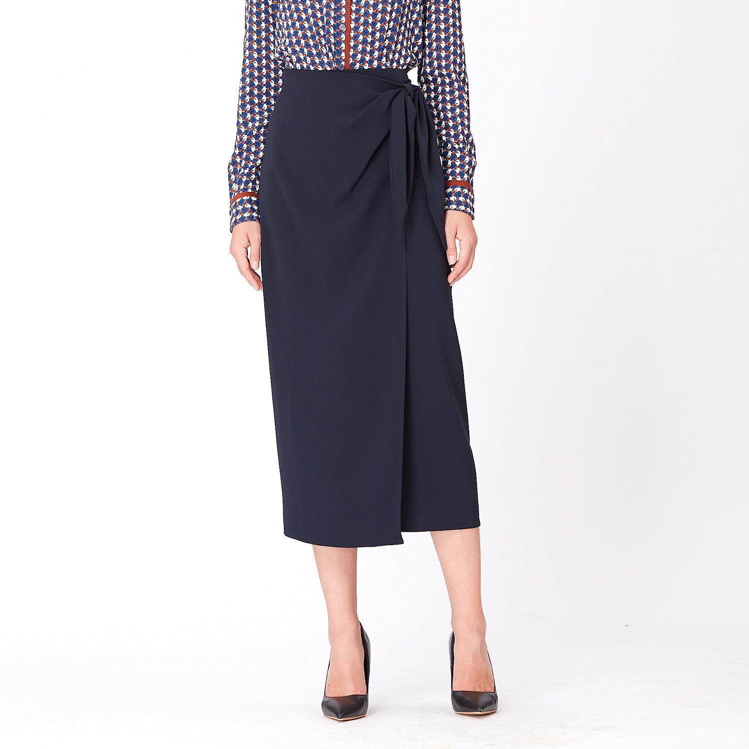 Une pièce à la fois originale par son panneau drapé au coté finissant par un nœud au côté et élégante par sa taille haute ajustée et sa coupe droite. Un élastique au dos assure une tenue de la jupe. A porter avec blouse ou chemise simple, idéale pour le bureau ou une sortie chic.