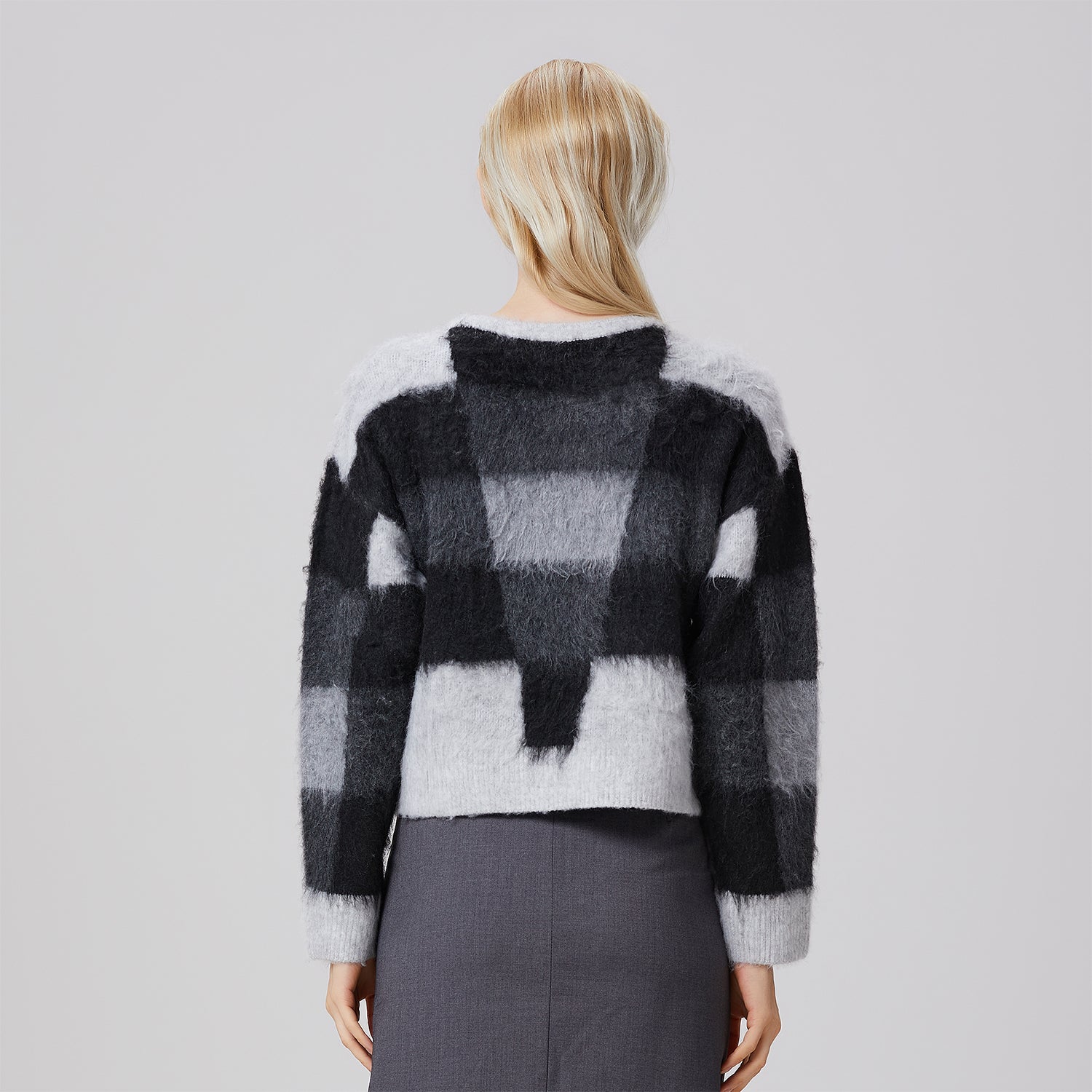 Un pull ample arborant un motif distinctif composé de grands blocs géométriques dans des tons camaïeu. Maille duveteuse douce. Coupe décontractée à emmanchures tombantes et allure androgyne. Une pièce moderne pour des ballades urbaines ou des escapades décontractées.