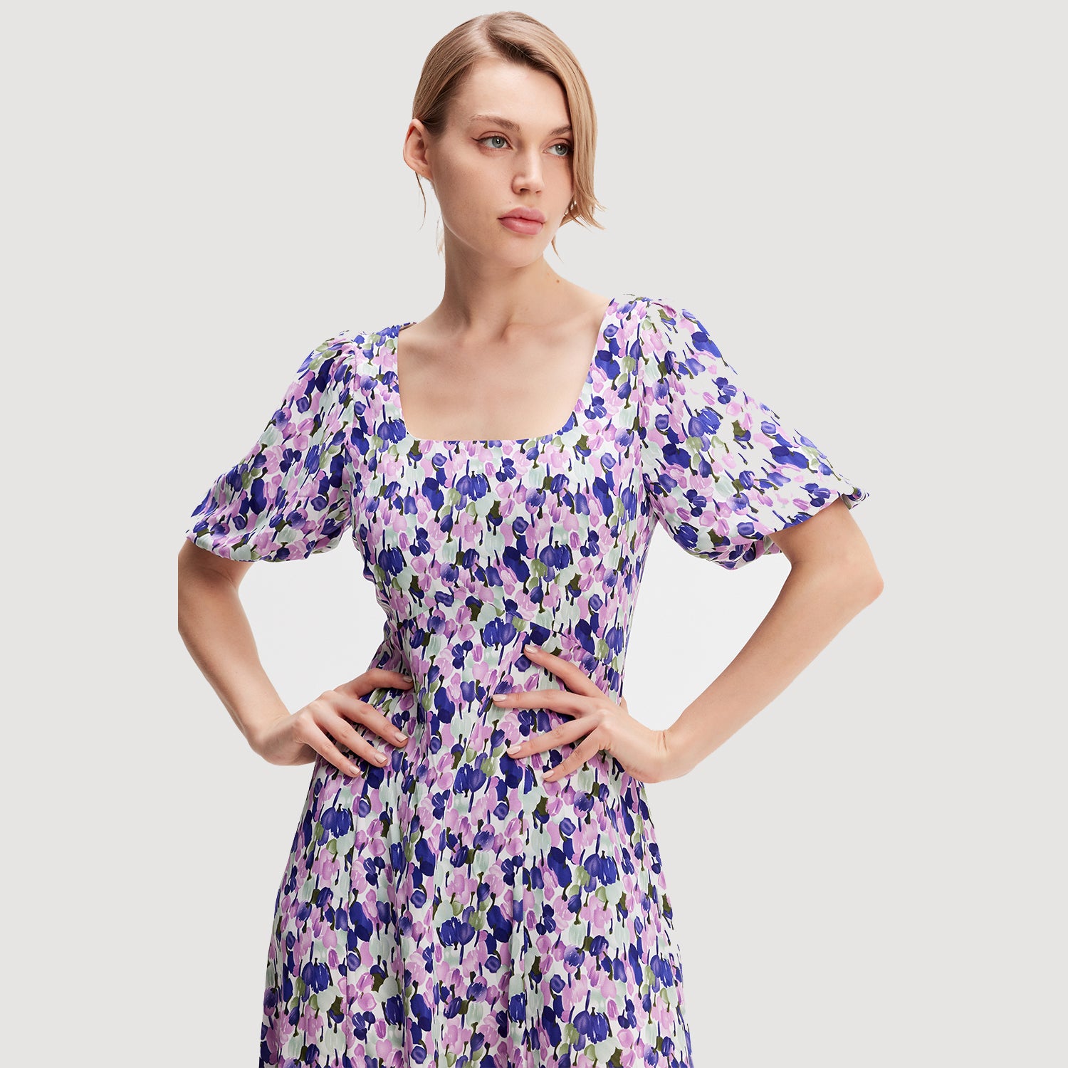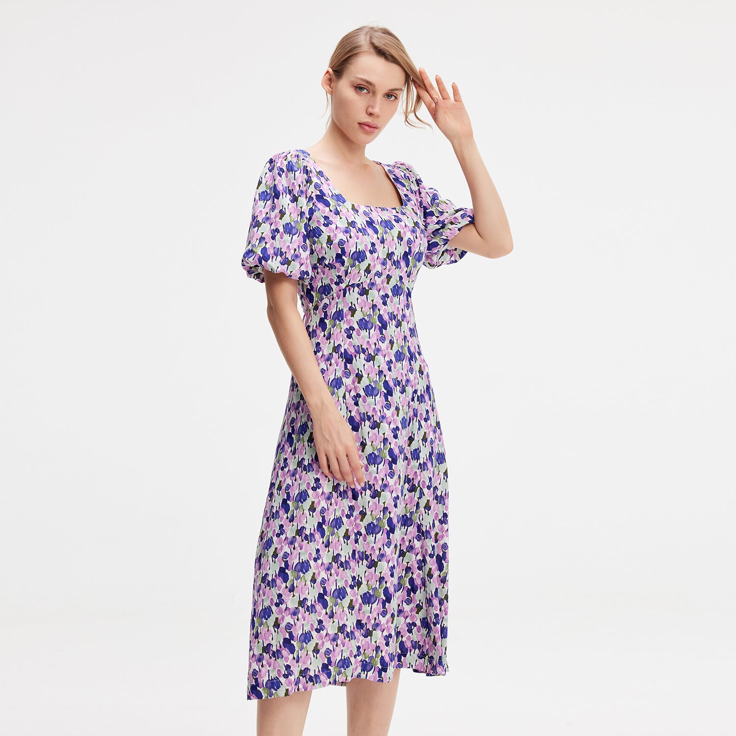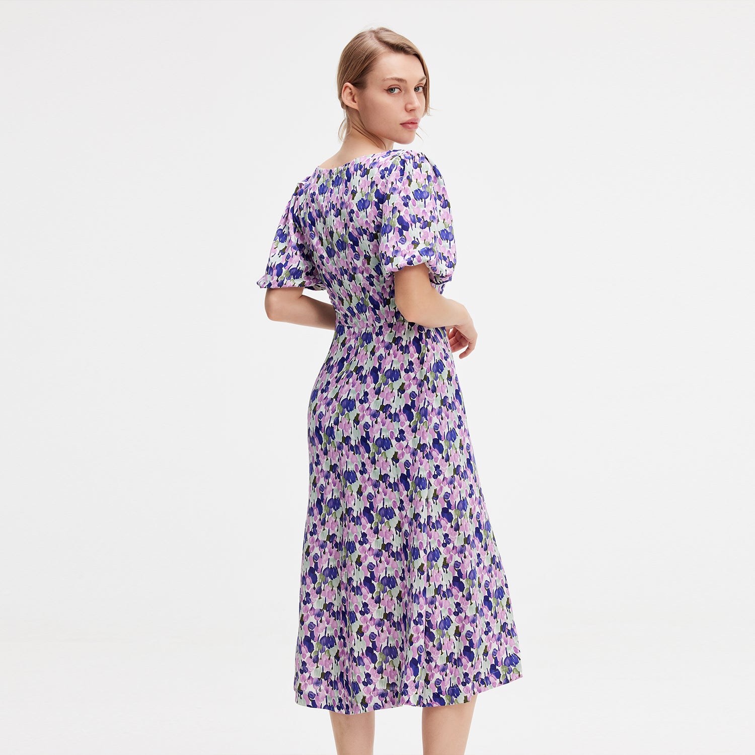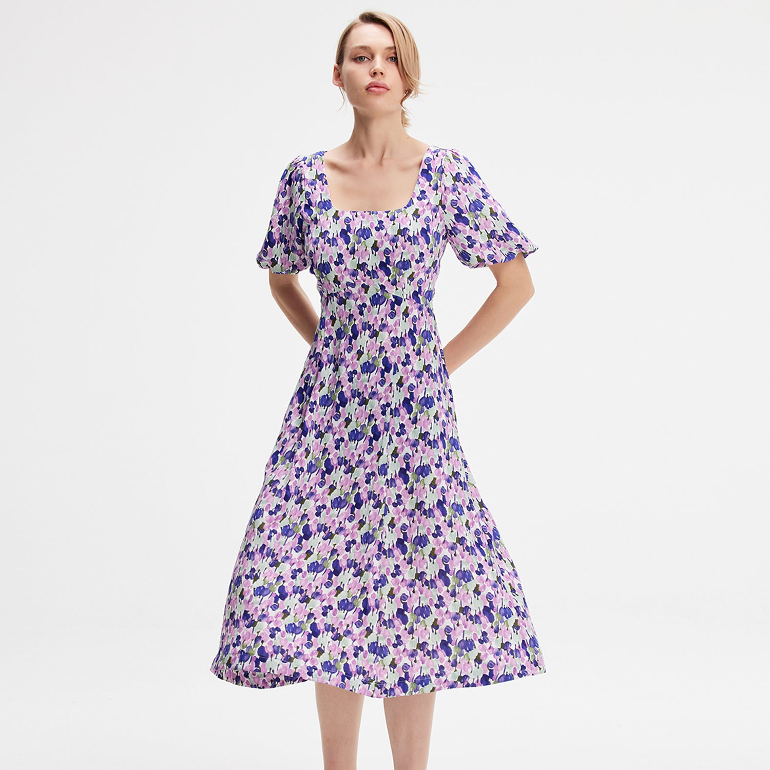 Ravissante robe légère à coloré : manches légèrement bouffantes, taille ajustée, décolleté un peu retro et volume évasé. Une allure fraiche et féminine pour vos escapades d’été : à porter avec des sandales ou des escarpins.