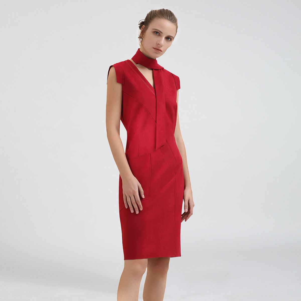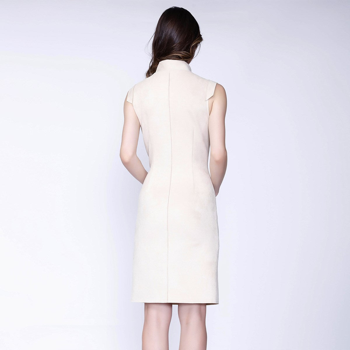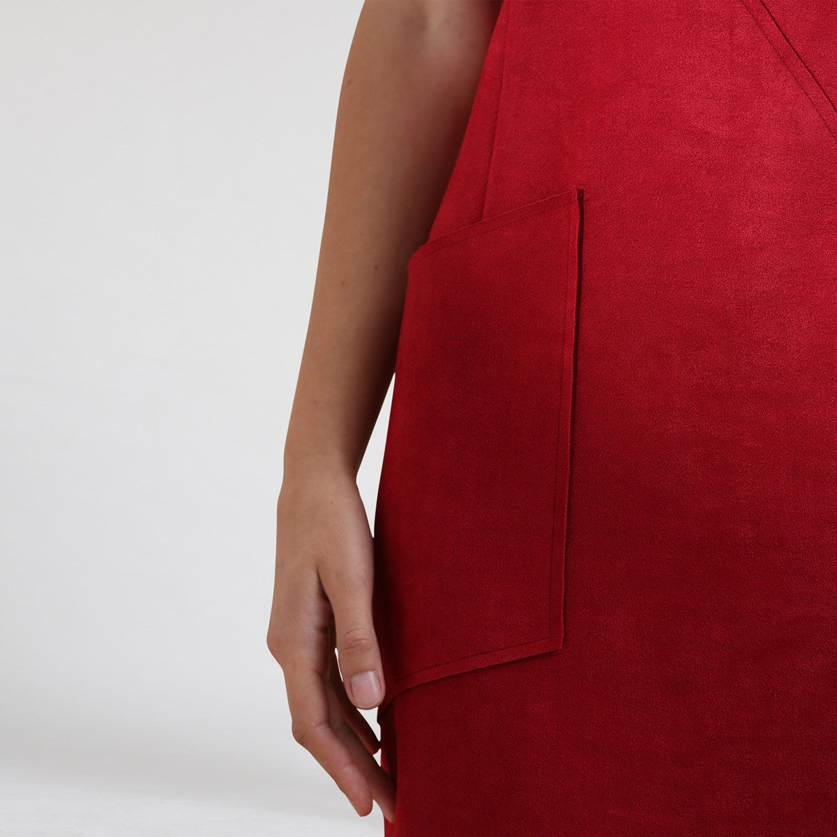 Une robe à la silhouette classique et à la structure originale ; aux finitions bord-franc très actuelles et coupé dans et une suédine double souple à la fois. Col-bandeau amovible rehaussé d’une boucle, décolleté-V agrémenté d’un bord-cote, large poche plaque sur un côté.