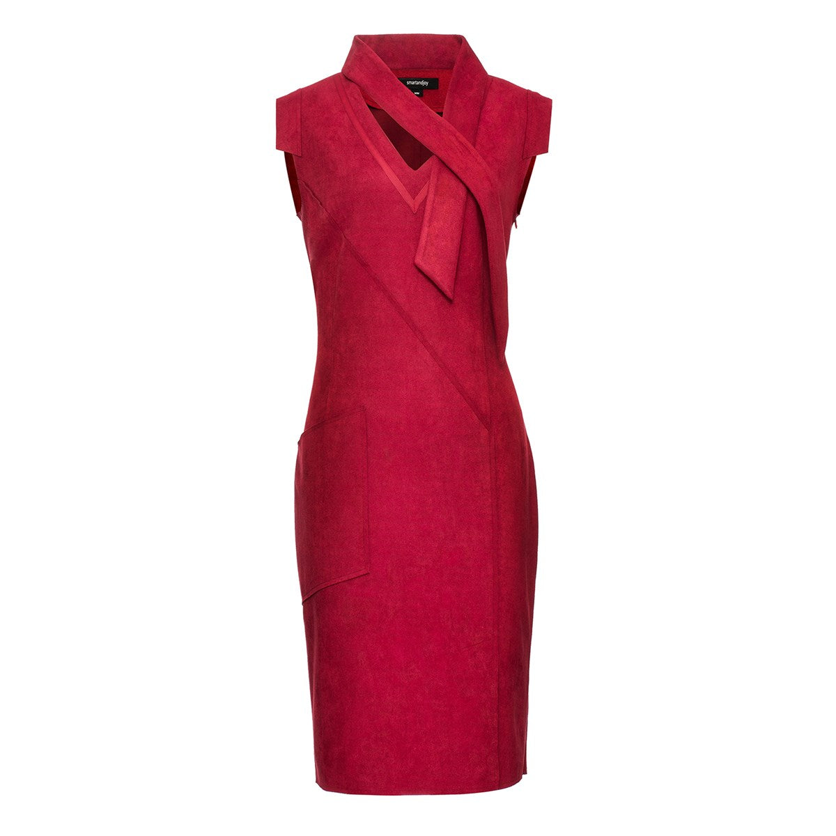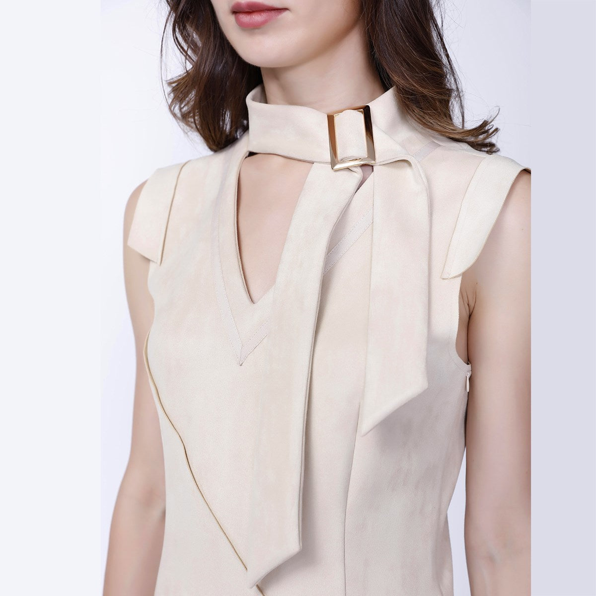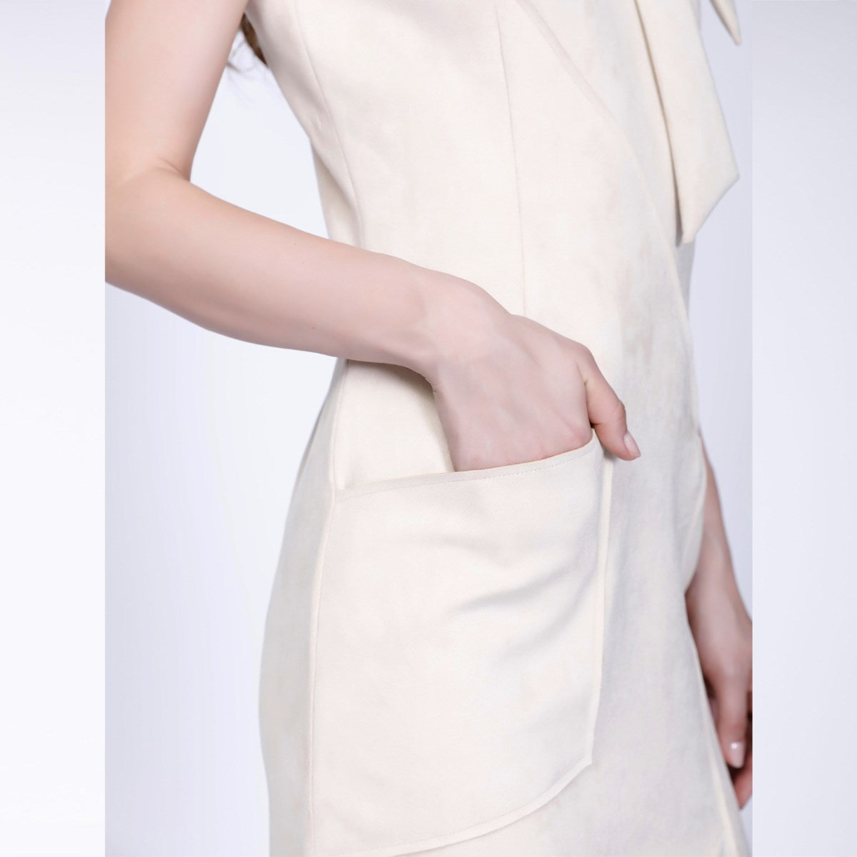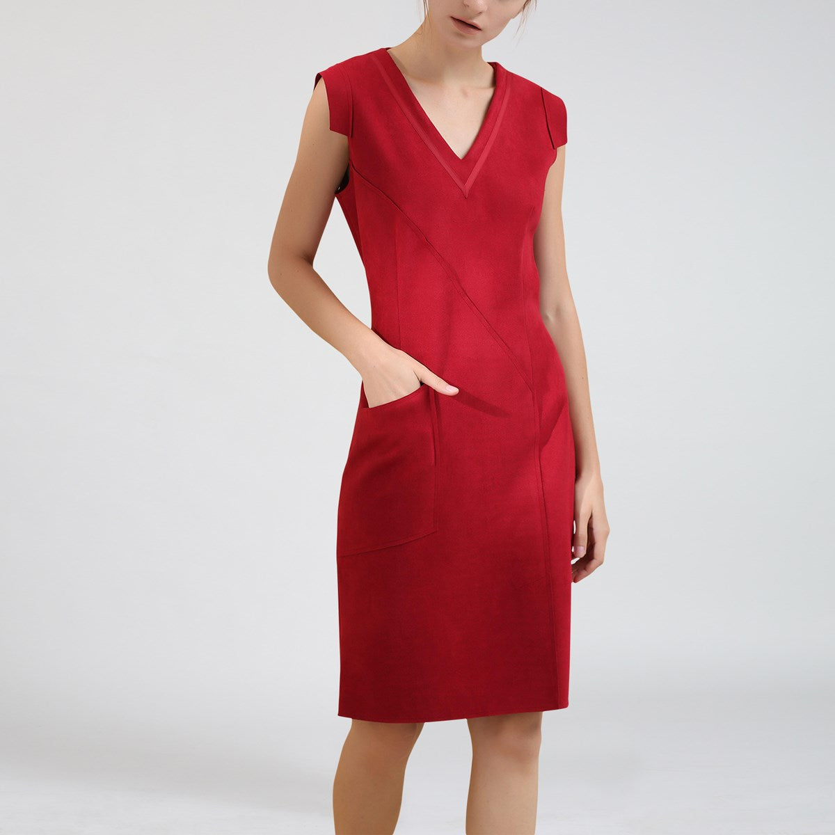 Une robe à la silhouette classique et à la structure originale ; aux finitions bord-franc très actuelles et coupé dans et une suédine double souple à la fois. Col-bandeau amovible rehaussé d’une boucle, décolleté-V agrémenté d’un bord-cote, large poche plaque sur un côté.