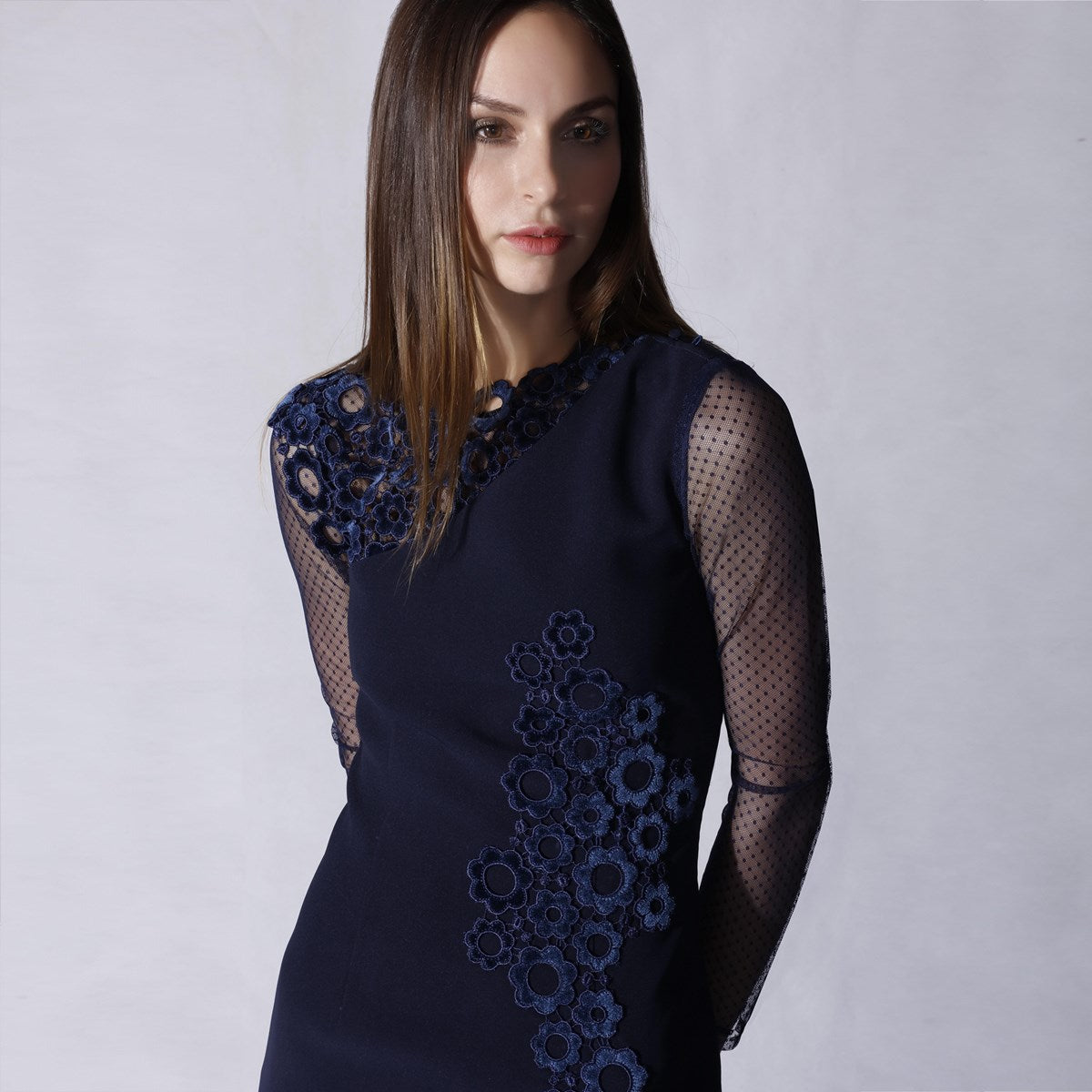 Une pièce sophistiquée ornée à l’épaule droite et au-devant gauche d’un appliqué de dentelle de velours très raffiné. Une coupe ajustée et élégante qui se porte aussi bien en journée comme en soirée.