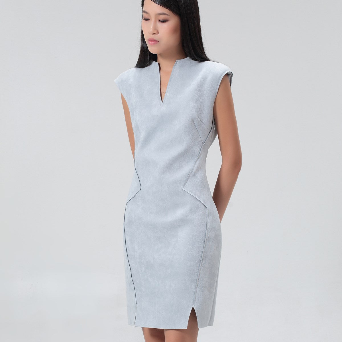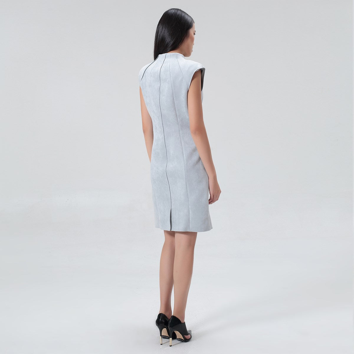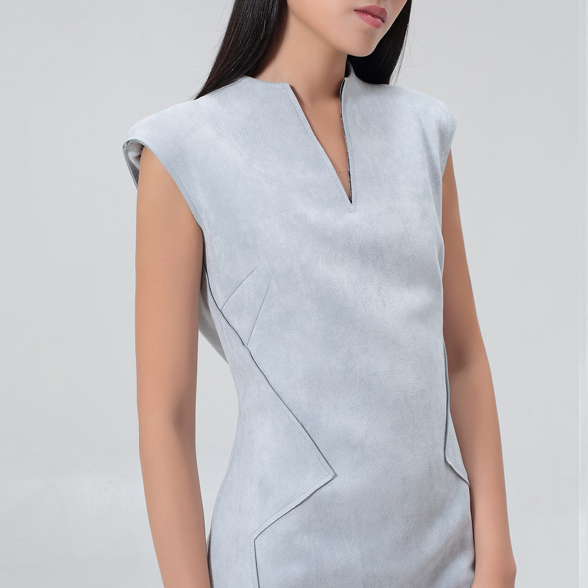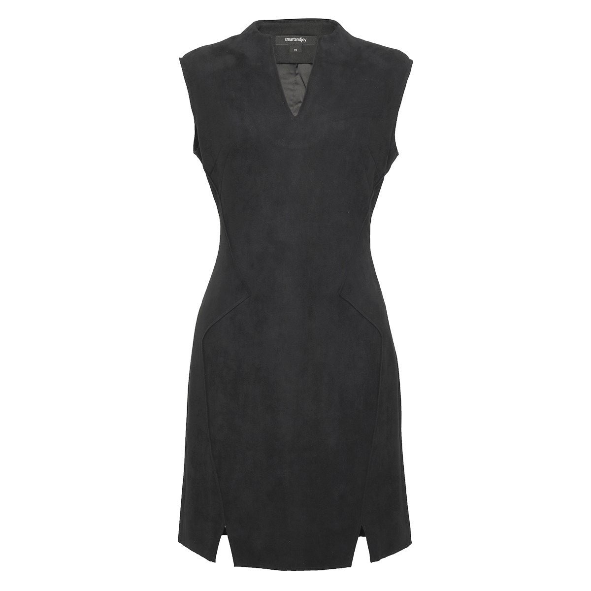 Une pièce de style dont la coupe ajustée met en valeur la ligne féminine : Epaulettes, col V, lignes géométriques cintrant la taille, mini fentes devant dévoilant la jambe. Très confortable grâce à la matière suédine double et stretch qui structure la silhouette. Une robe dont le minimalisme traversera les saisons. A porter en journée comme en soirée.