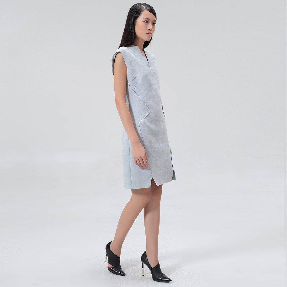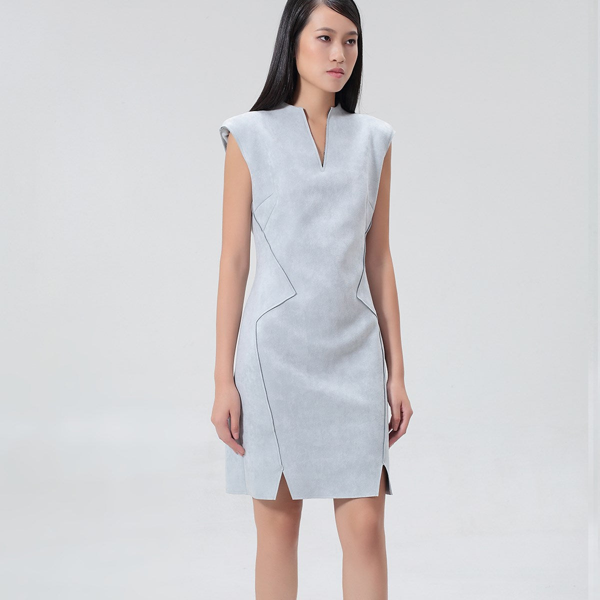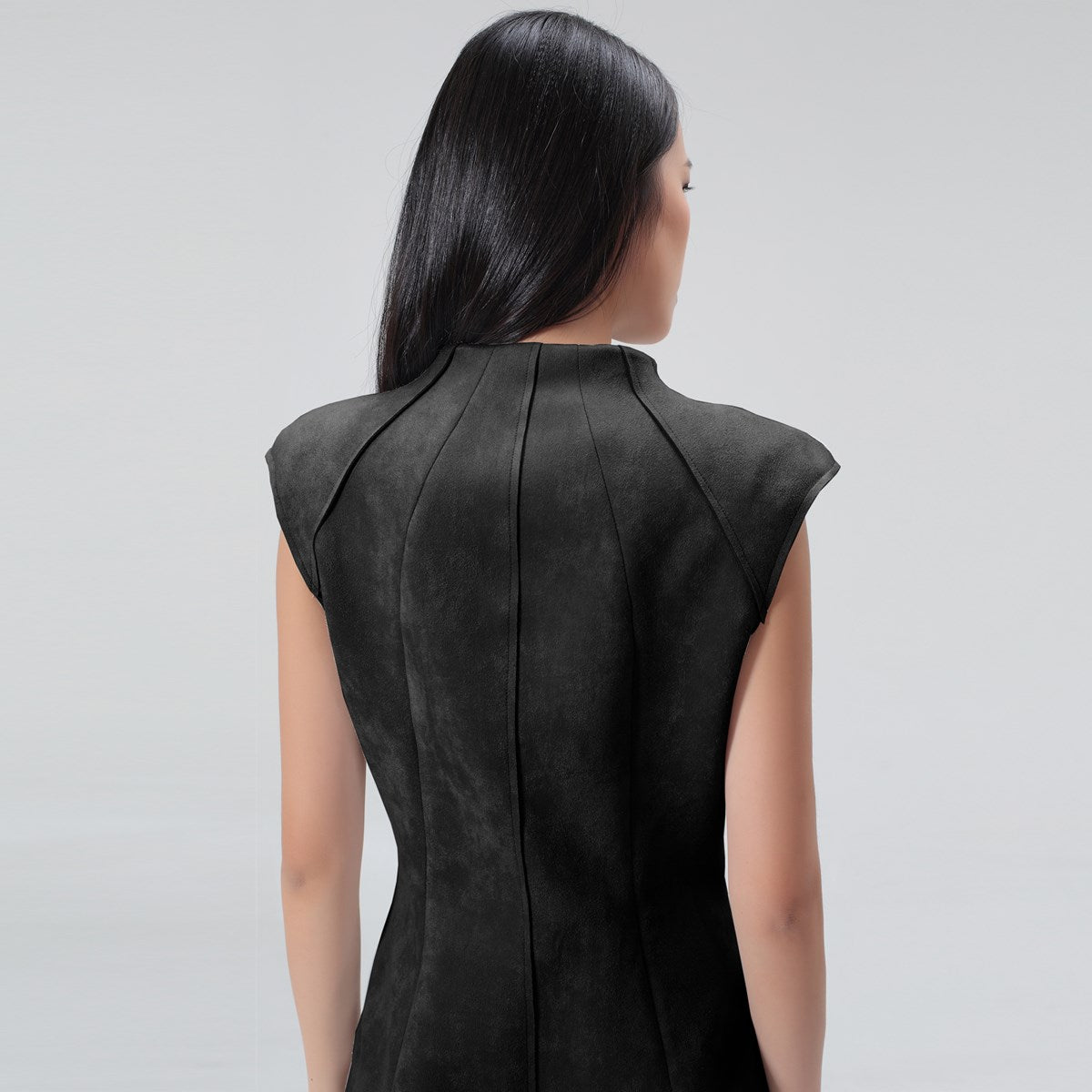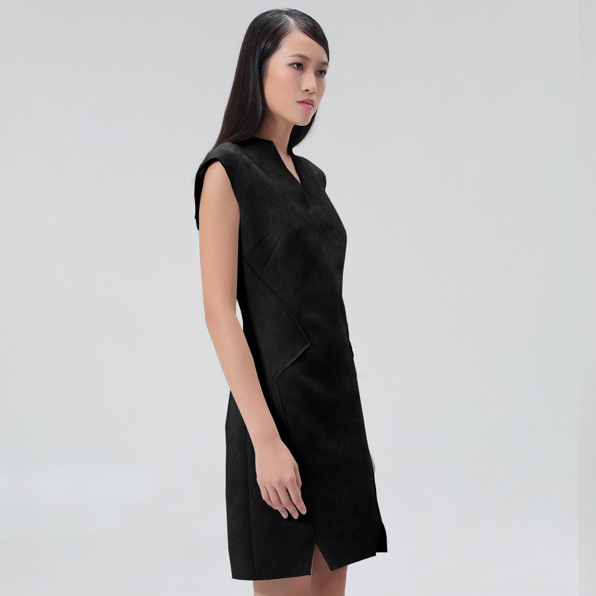 Une pièce de style dont la coupe ajustée met en valeur la ligne féminine : Epaulettes, col V, lignes géométriques cintrant la taille, mini fentes devant dévoilant la jambe. Très confortable grâce à la matière suédine double et stretch qui structure la silhouette. Une robe dont le minimalisme traversera les saisons. A porter en journée comme en soirée.