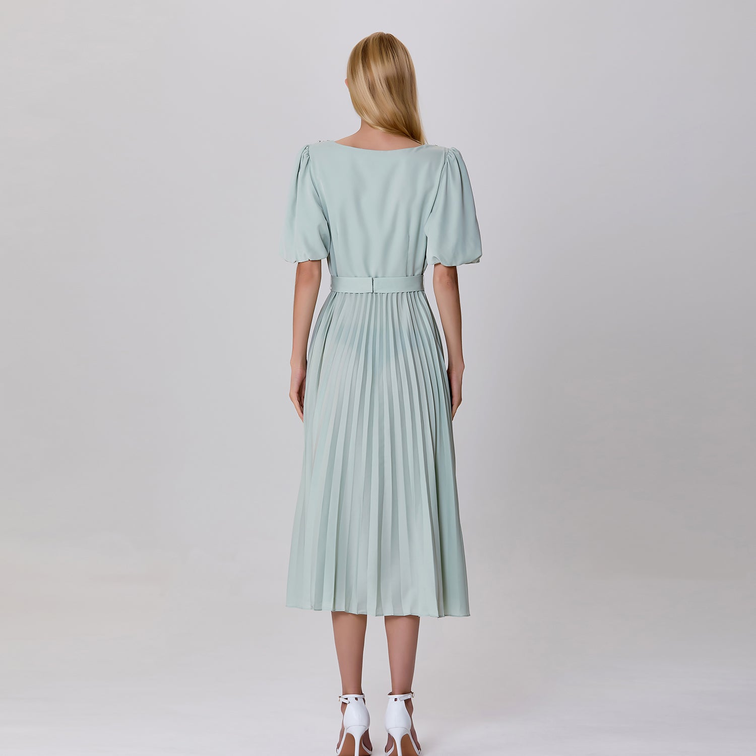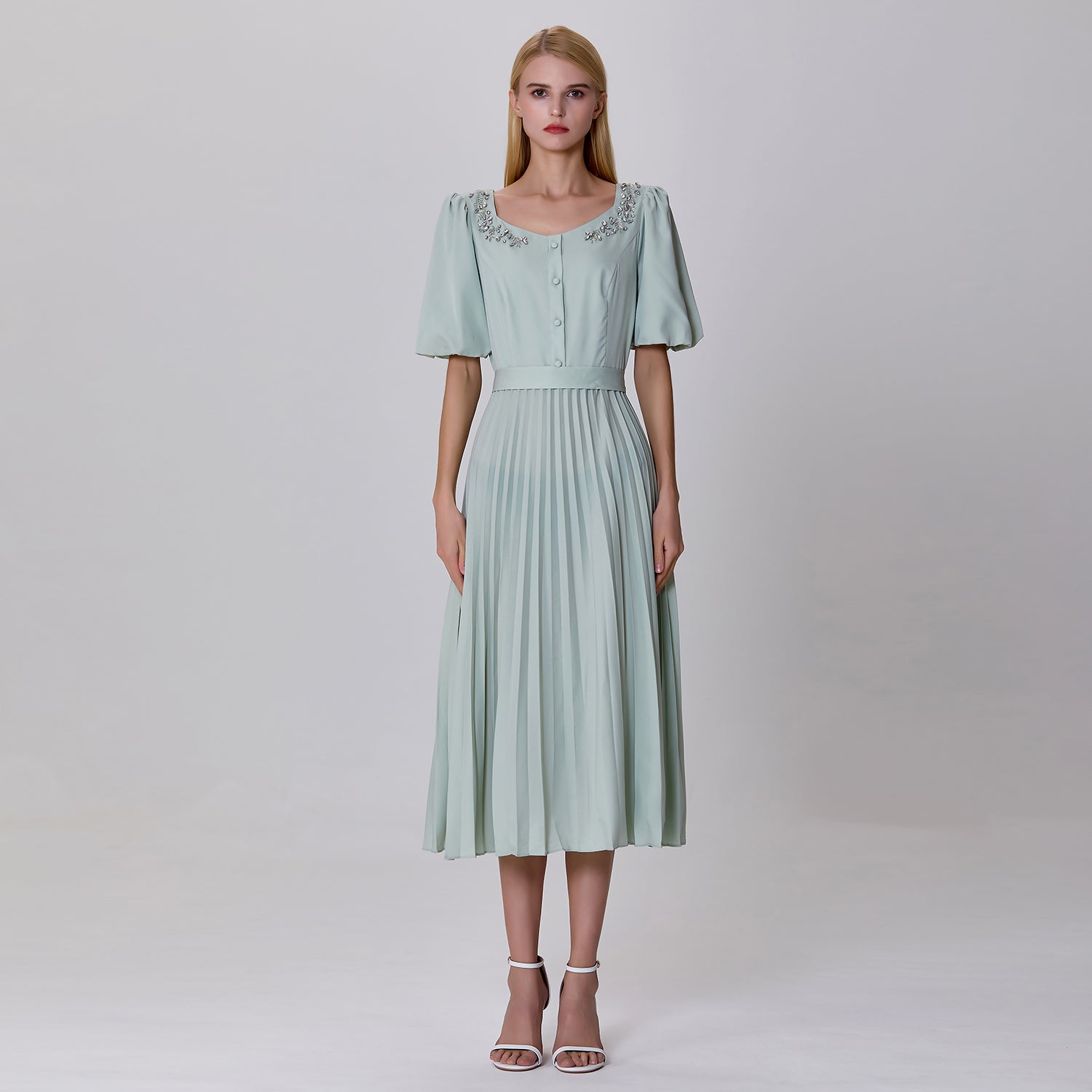 Une robe élégante qui se structure de manches bouffantes, d’un bas plissé qui offre un mouvement fluide et gracieux, rehaussé d’une ceinture à pressions. Le haut de la robe est agrémenté d’une encolure légèrement carrée ornée de perles délicates, et d’une patte de boutonnage discrète qui accentue son allure raffinée. Une pièce délicate et sophistiquée idéale pour des occasions semi-formelles ou des sorties élégantes.