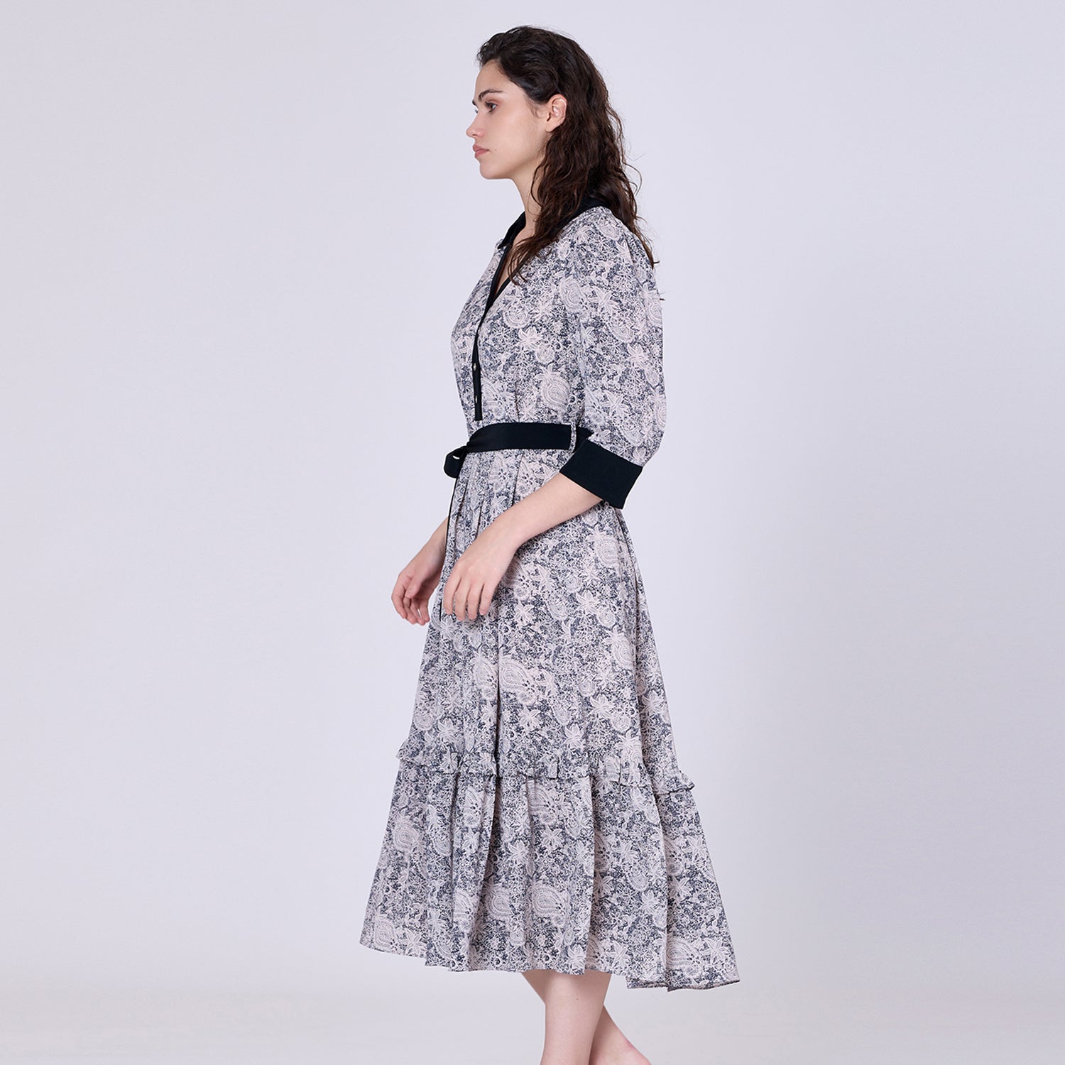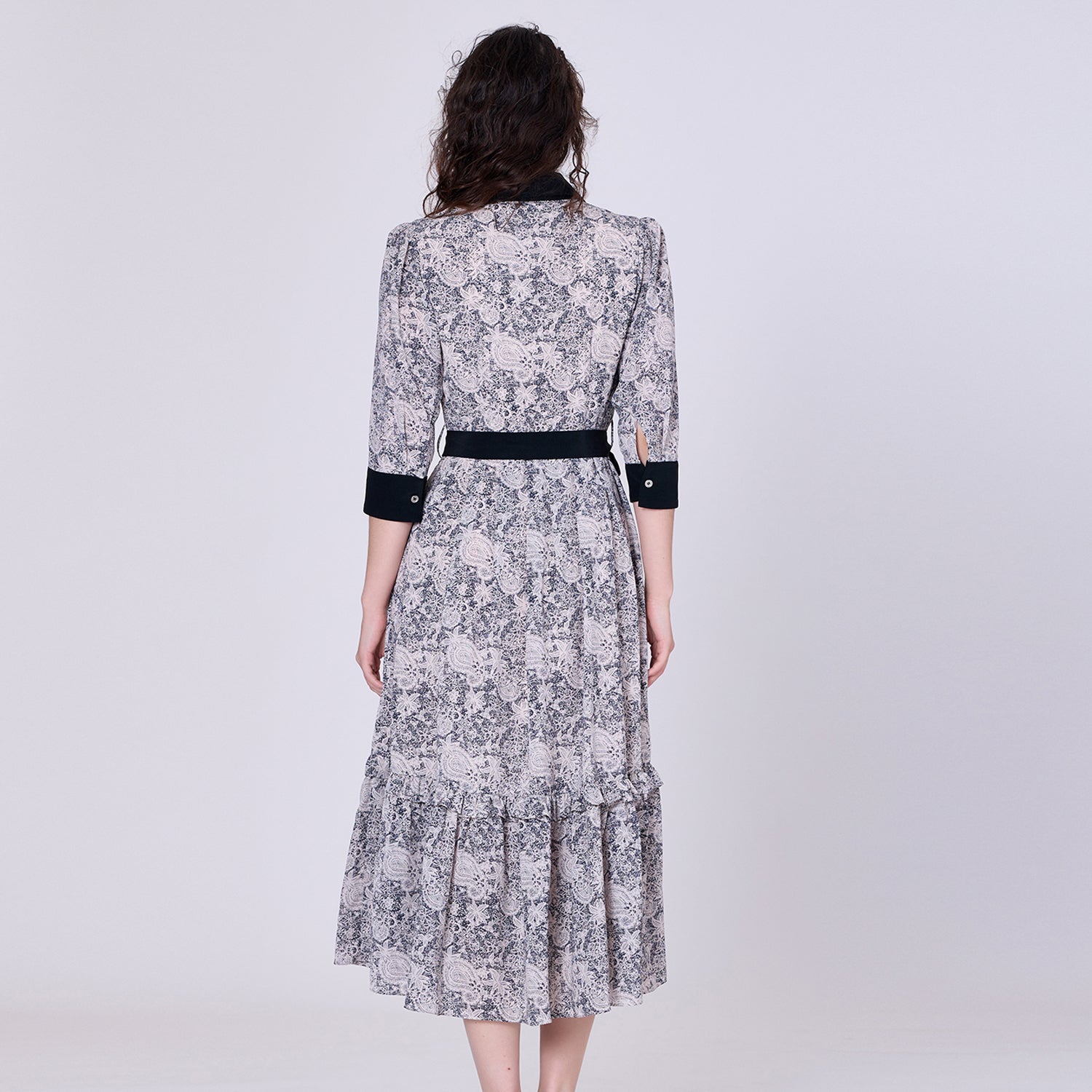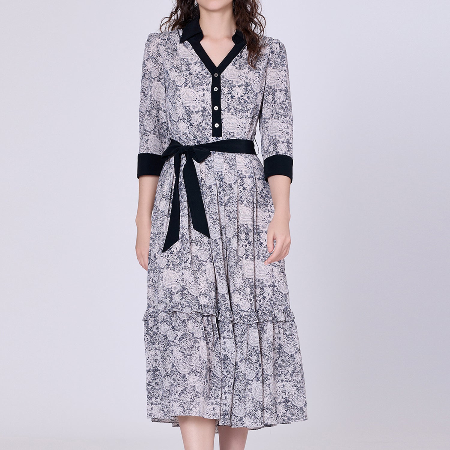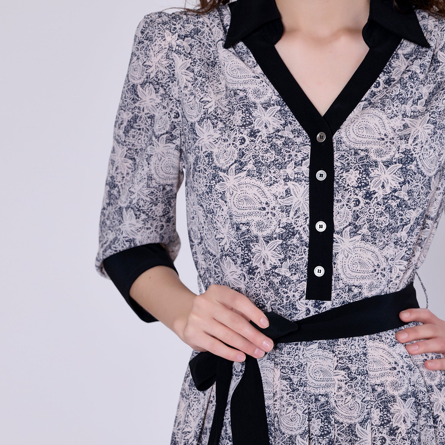Une pièce structurée par des élément contrastés : poignets, ceinture, pate de boutonnage devant et col. A la fois dynamique et de coupe classique, cette robe souligne élégamment la taille et arbore un volume généreusement évasé par son l’ourlet volanté. Une silhouette gracieuse qui convient à des occasions semi-formelles comme un brunch, une « garden party » ou qui peut se porter aussi au bureau.