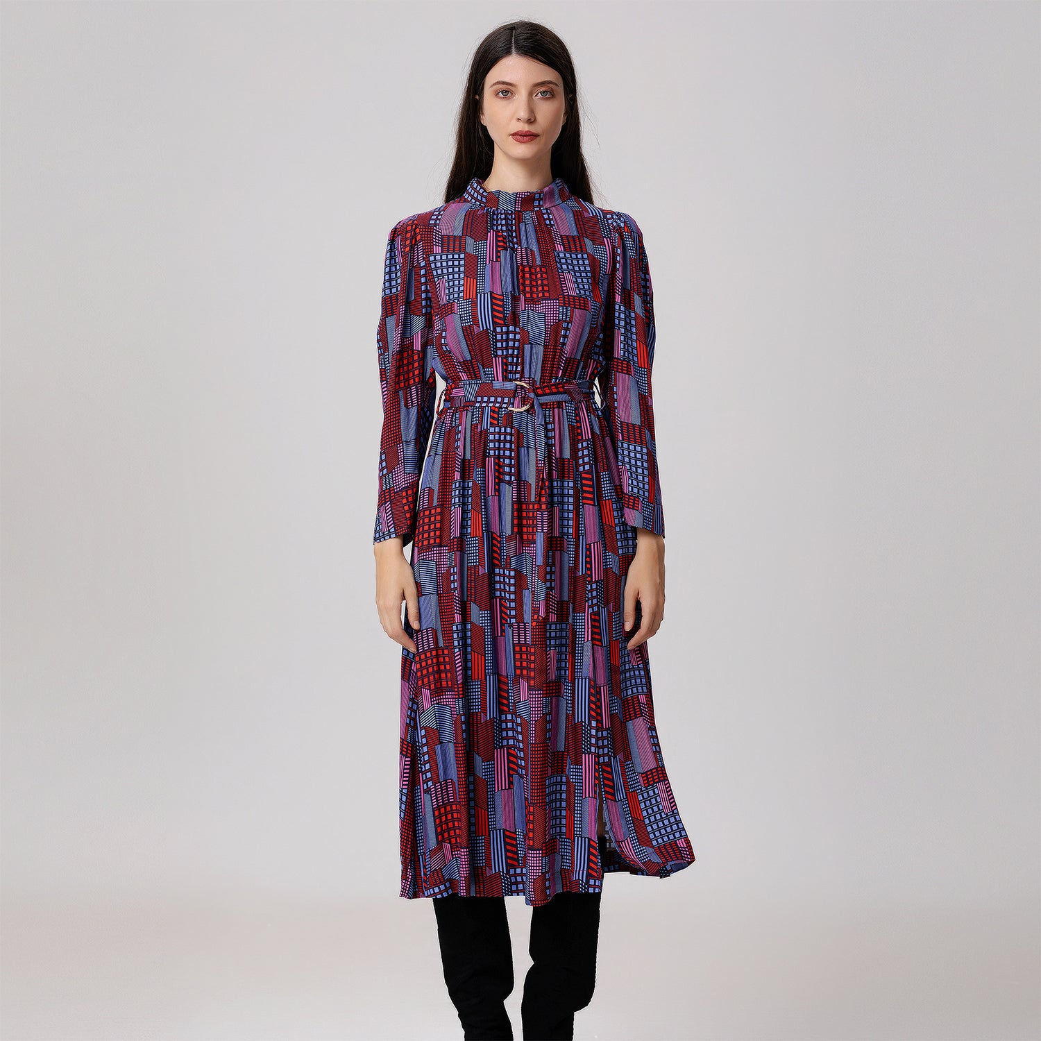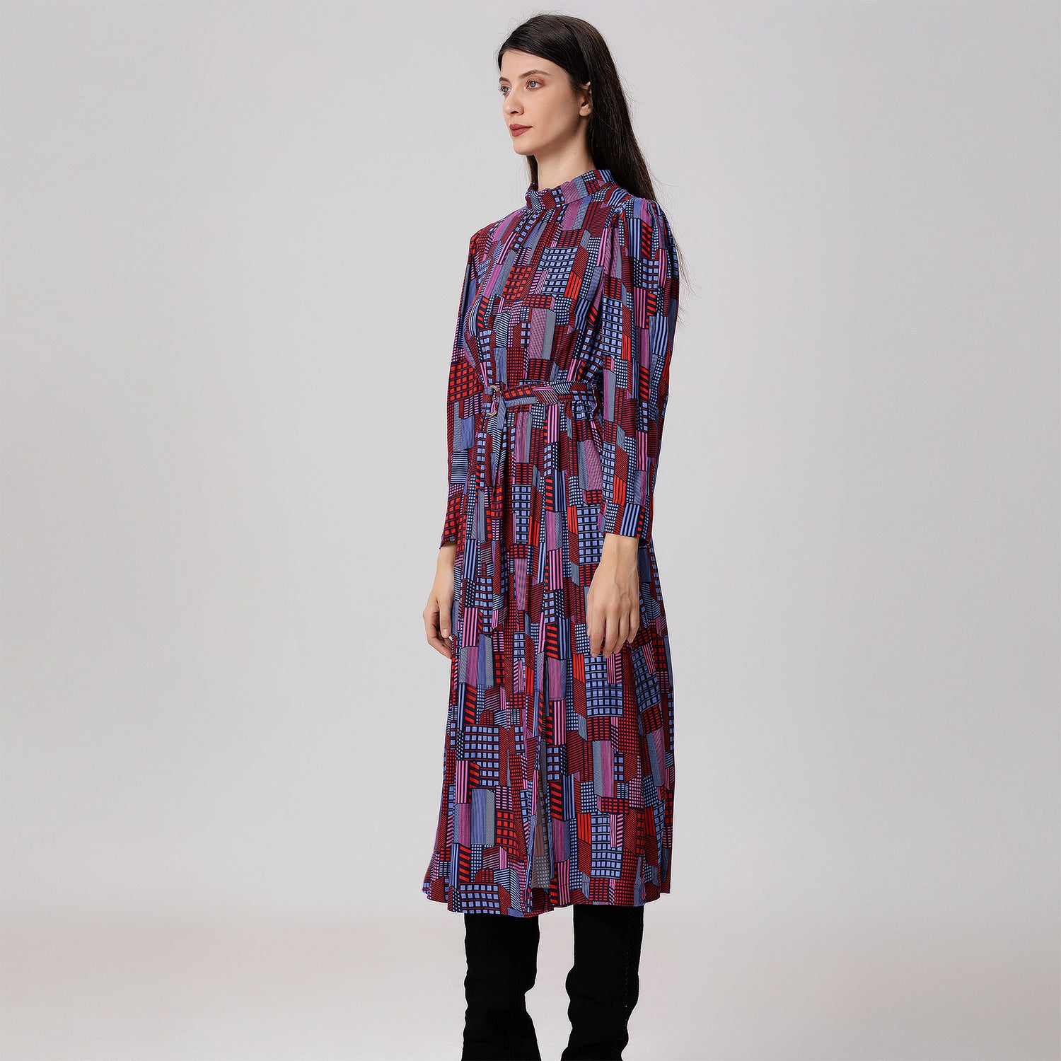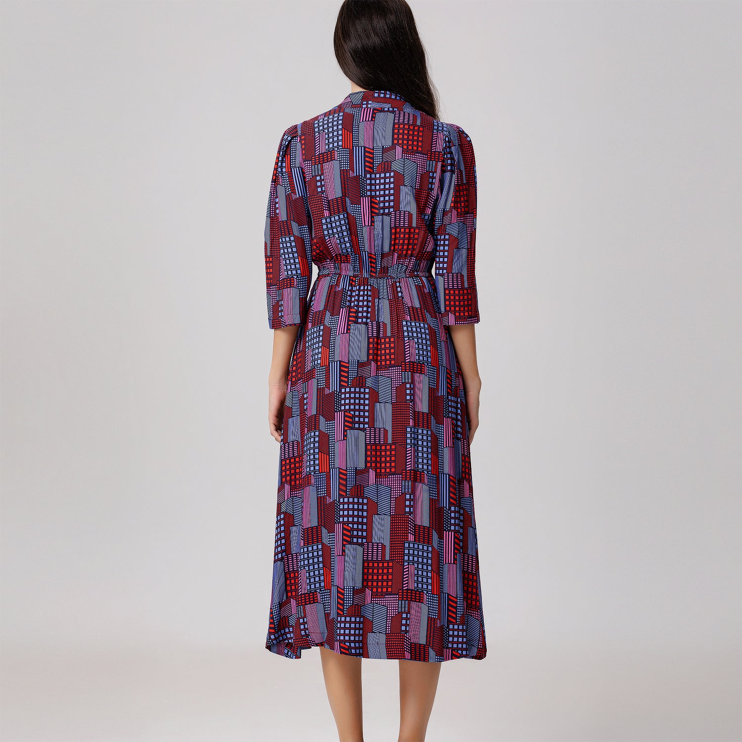 Une ligne sobre et valorisant la silhouette : structurée de détails subtils: col montant rabattu, ceinture ajoutée, taille cintrée, volume évasé qui descend au mollet. Une pièce graphique et féminine dans un imprimé à motif géométrique, qui convient à des occasions semi-formelles citadines, le bureau ou des escapades plus décontractées.