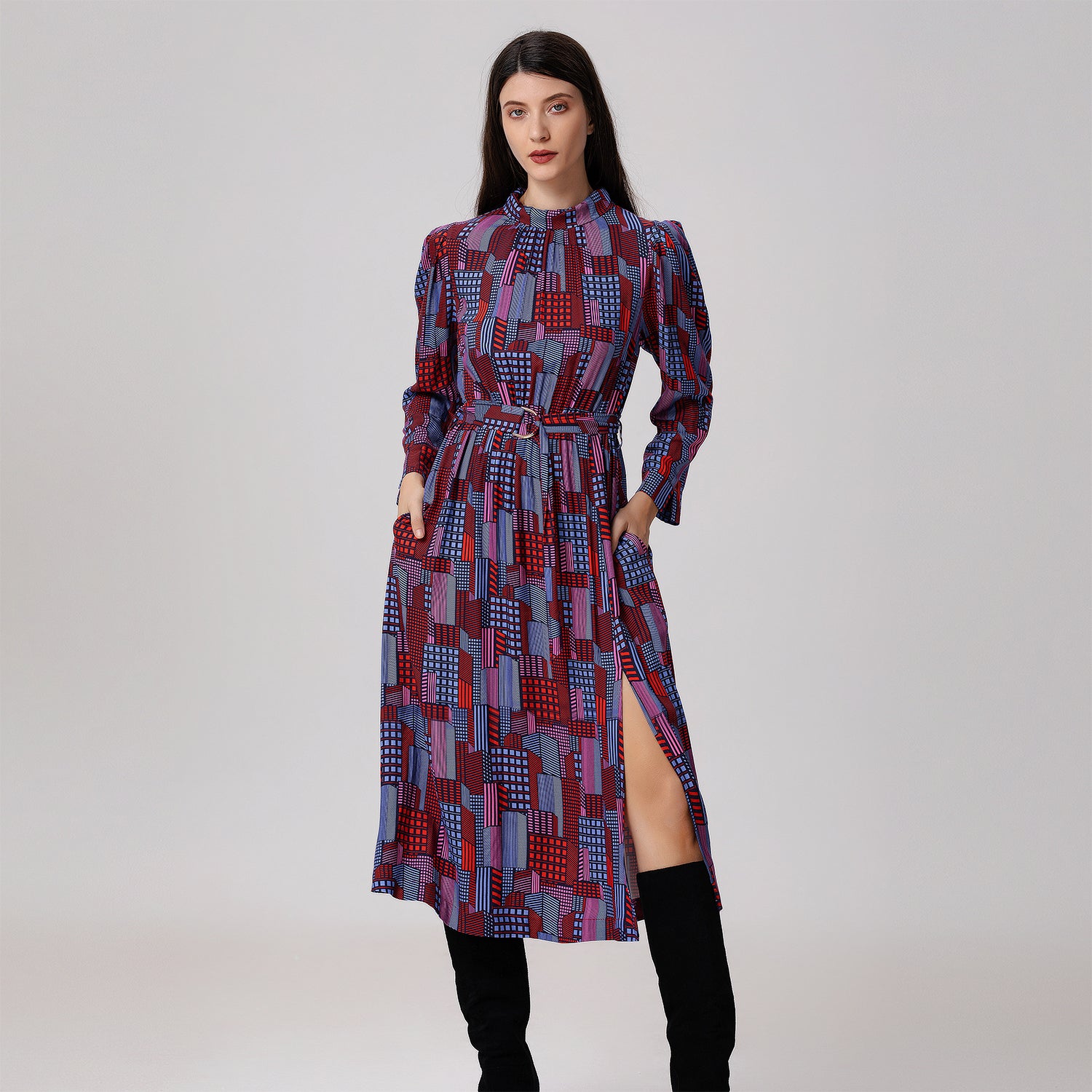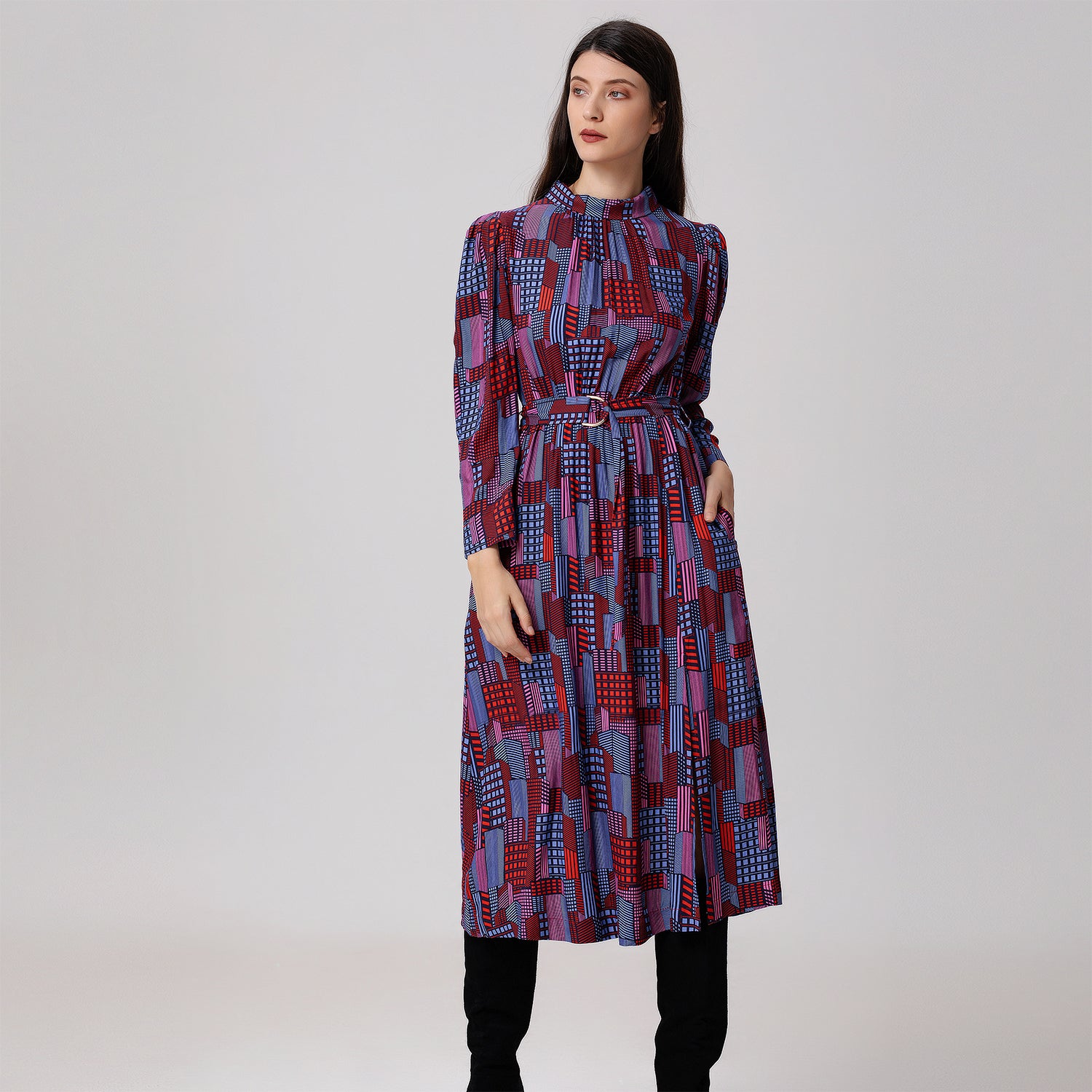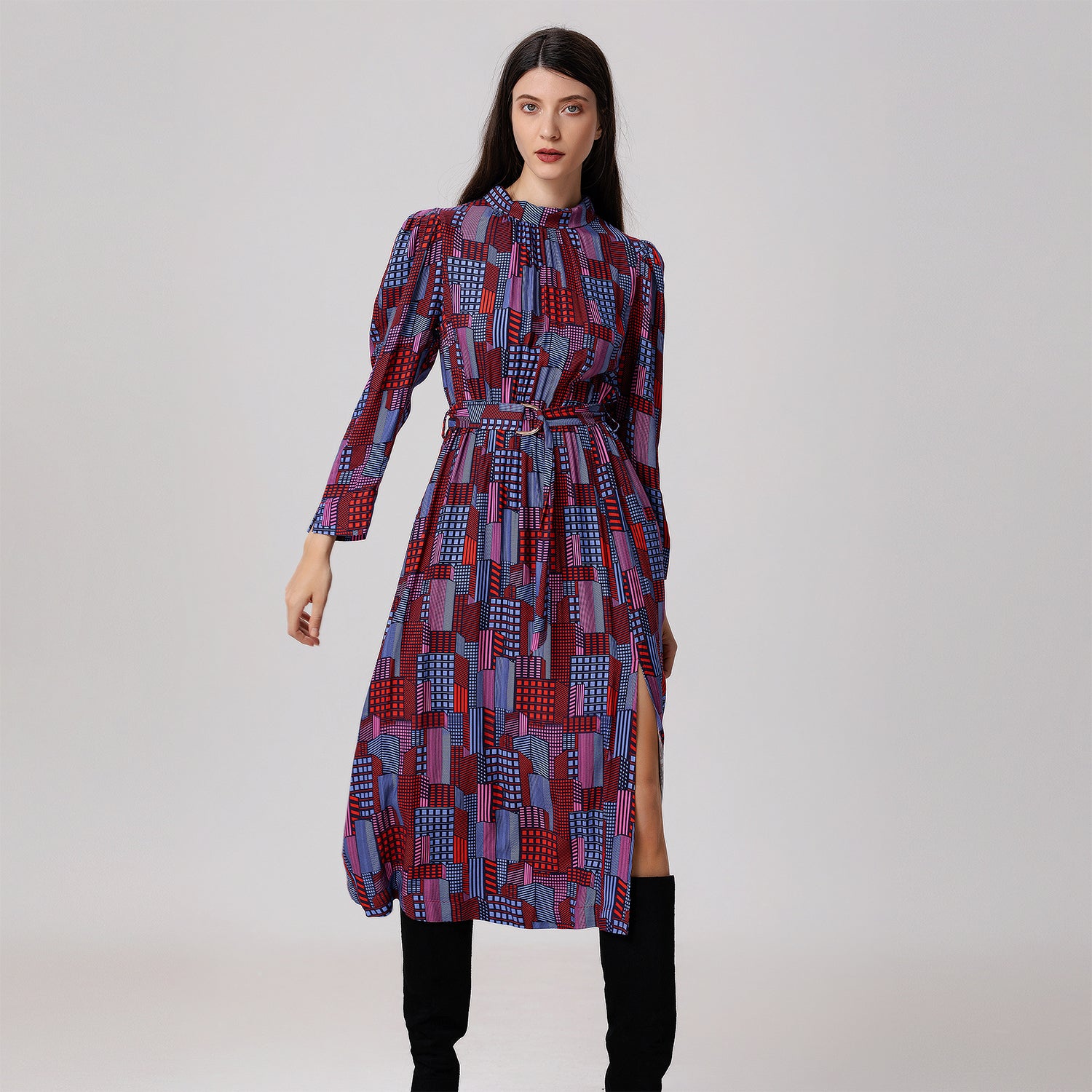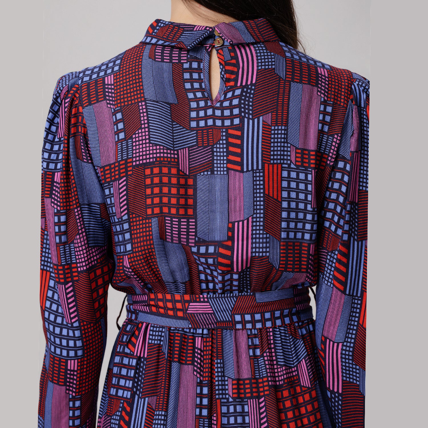 Une ligne sobre et valorisant la silhouette : structurée de détails subtils: col montant rabattu, ceinture ajoutée, taille cintrée, volume évasé qui descend au mollet. Une pièce graphique et féminine dans un imprimé à motif géométrique, qui convient à des occasions semi-formelles citadines, le bureau ou des escapades plus décontractées.