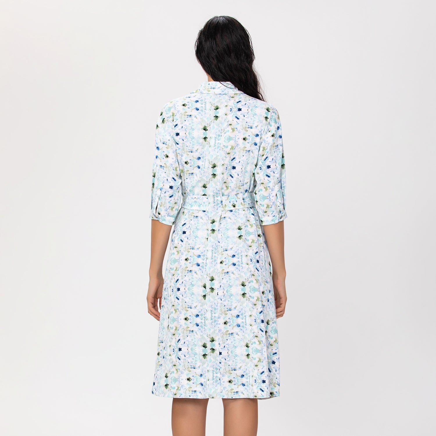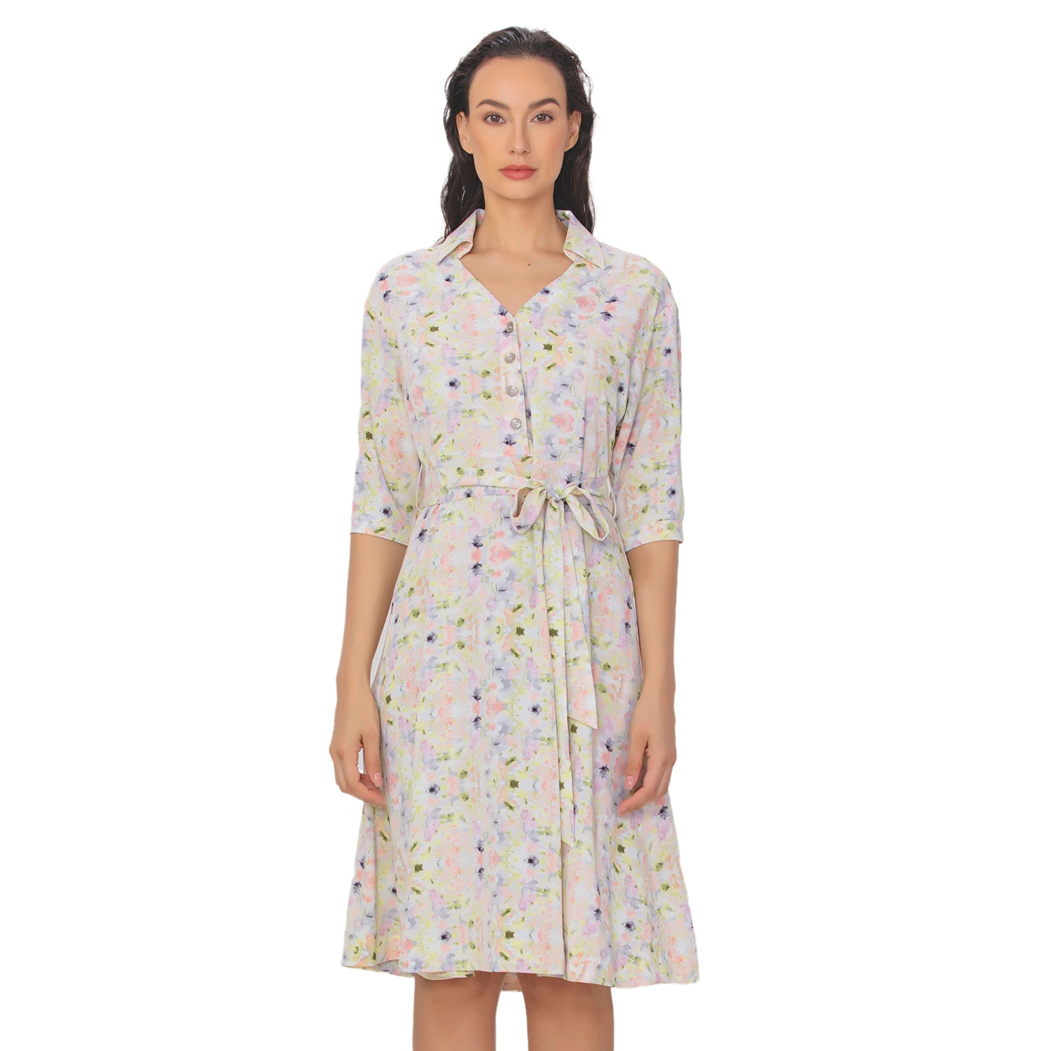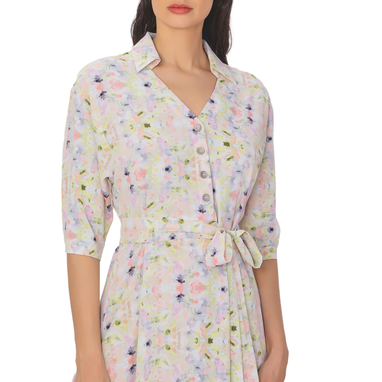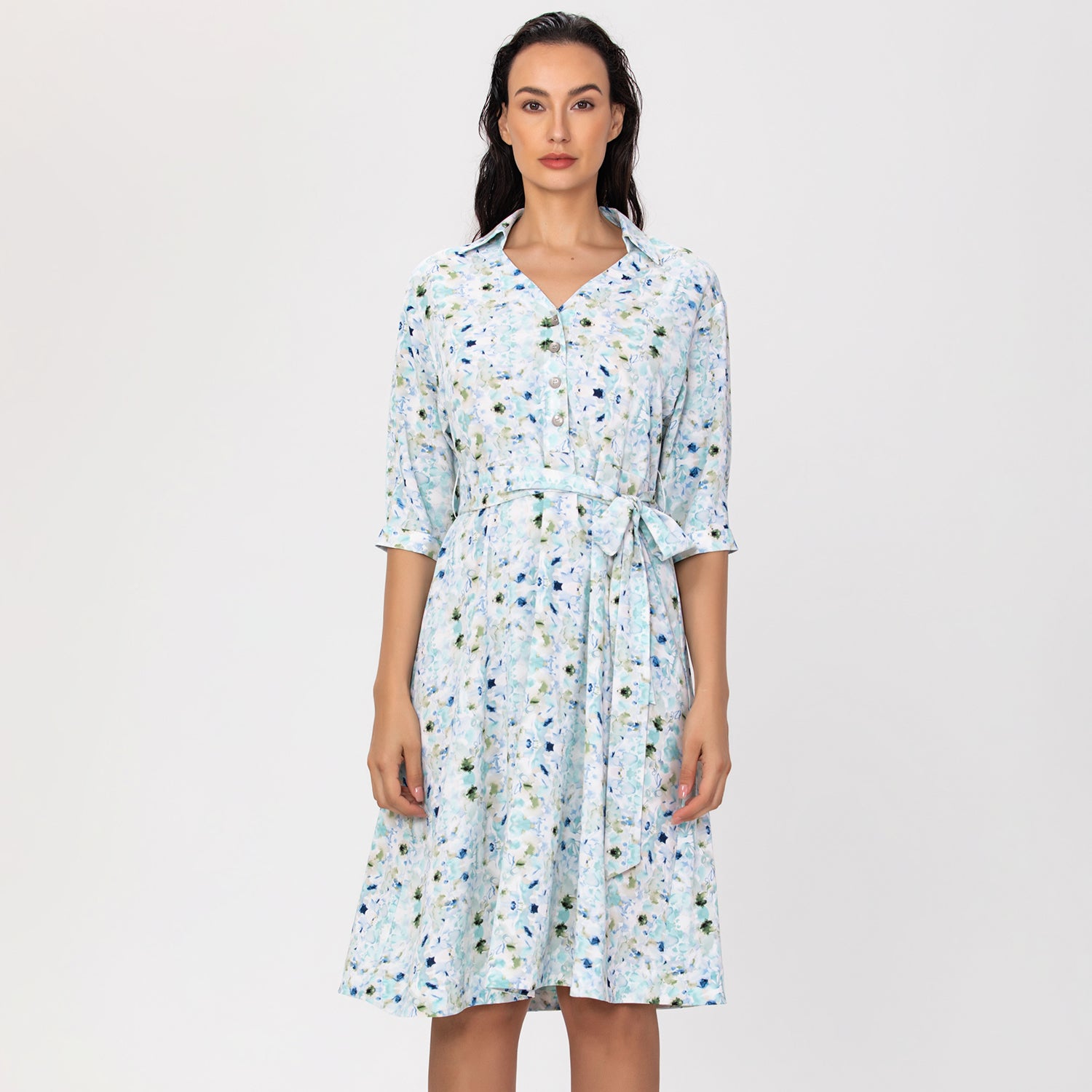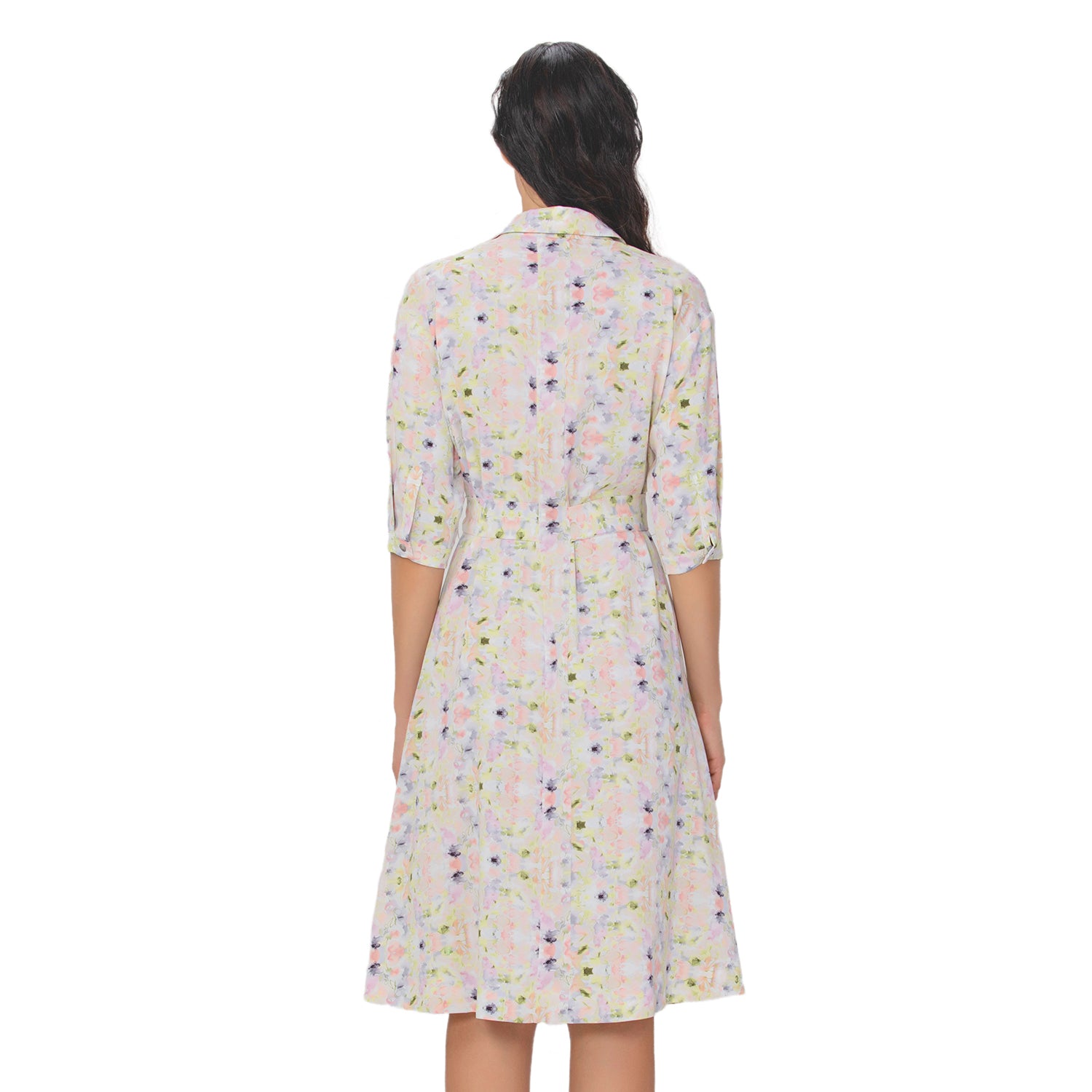 Apportez une touche de fraîcheur et de légèreté à votre garde-robe avec cette robe à imprimé floral. Sa coupe fluide et évasée souligne délicatement la silhouette tandis que sa ceinture à nouer permet de souligner la taille. Dotée de manches trois-quarts et d'un col chemise ouvert sur un décolleté en V, cette pièce se distingue par sa féminité et son élégance décontractée. Idéale pour des occasions semi-formelles ou des journées estivales, elle conjugue confort et style avec brio.