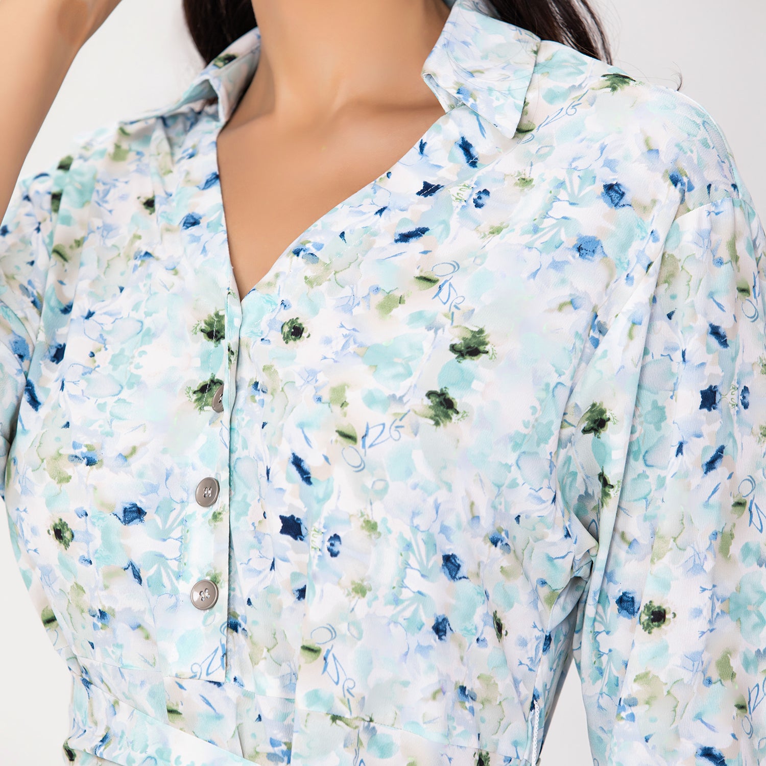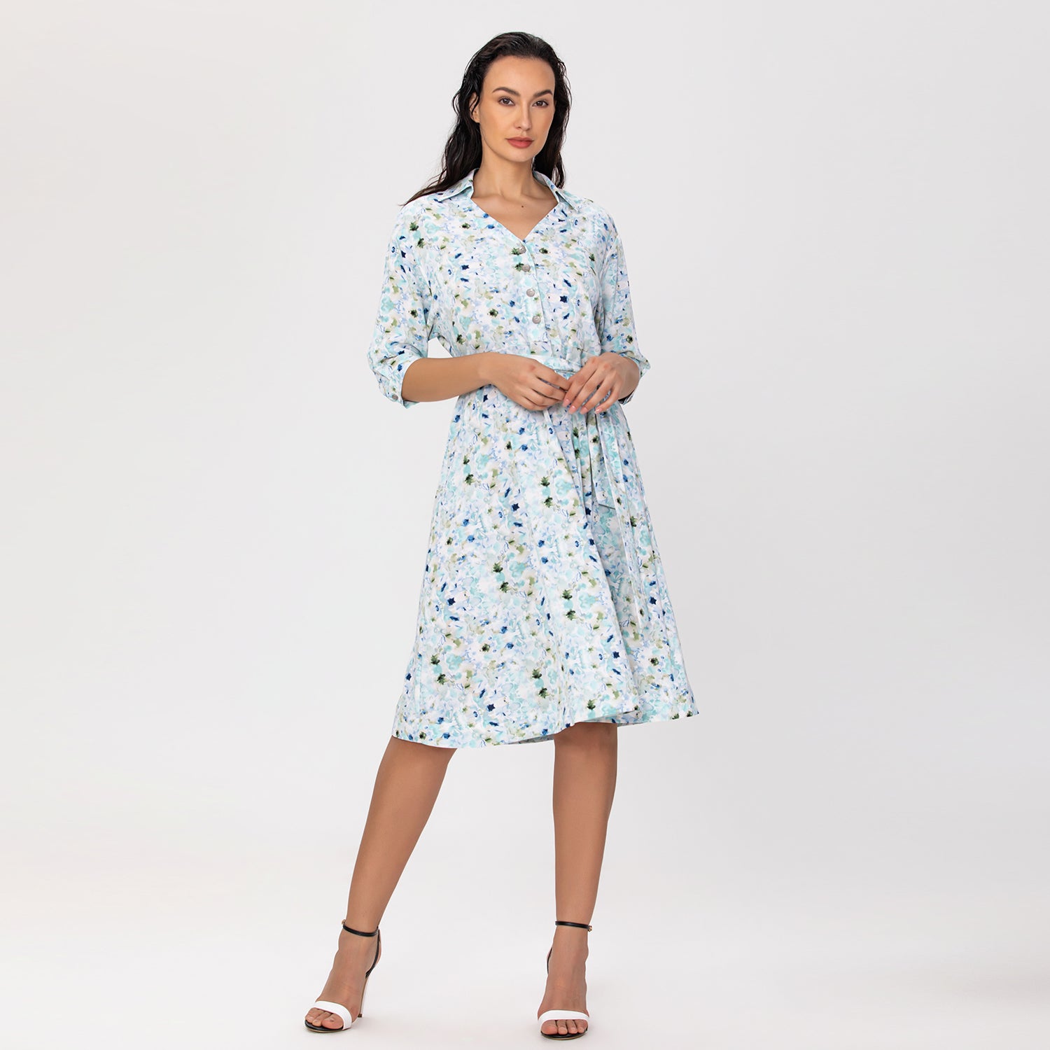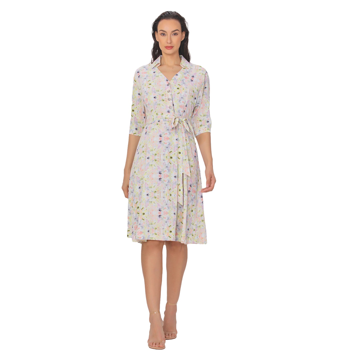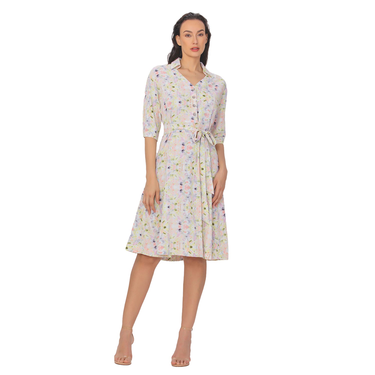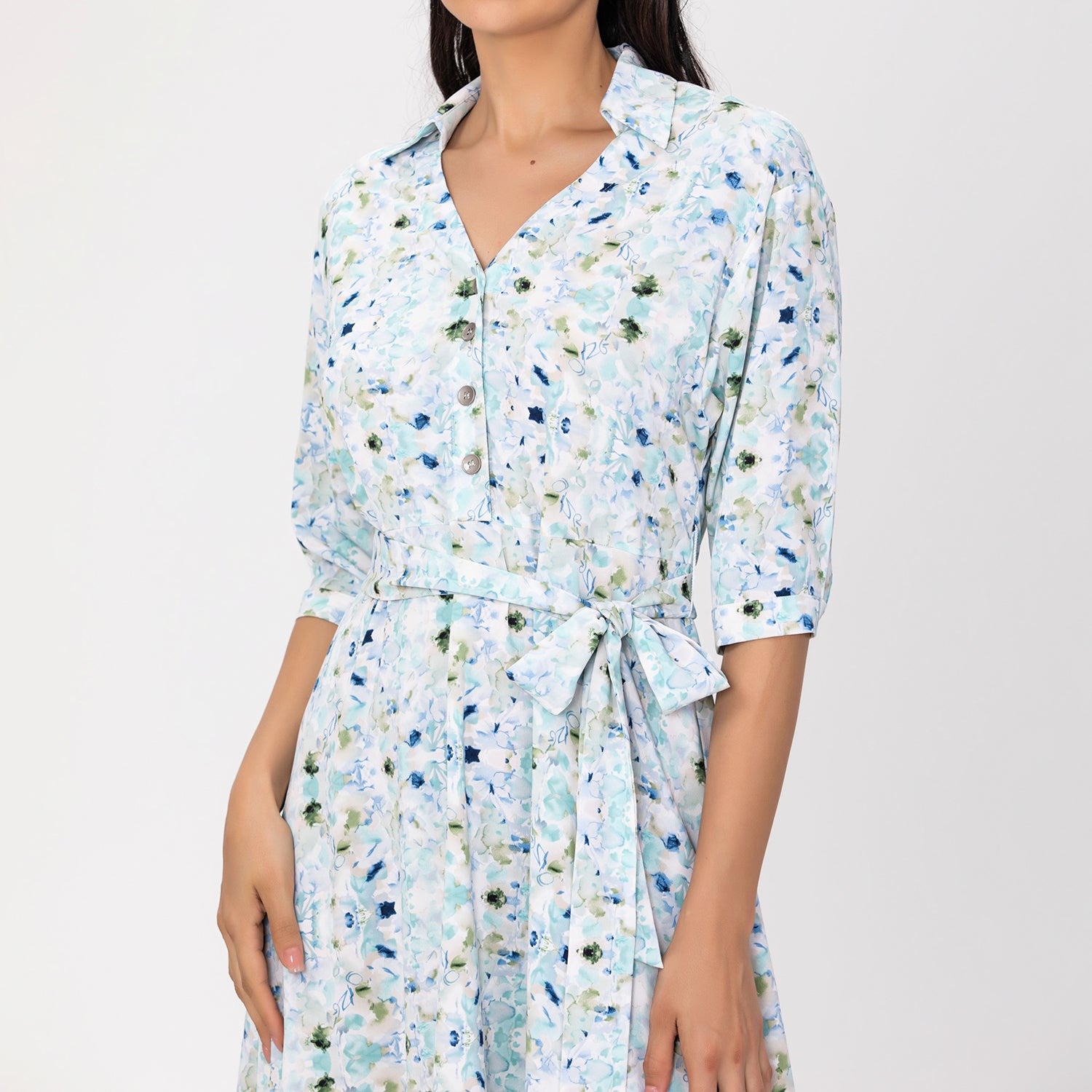 Apportez une touche de fraîcheur et de légèreté à votre garde-robe avec cette robe à imprimé floral. Sa coupe fluide et évasée souligne délicatement la silhouette tandis que sa ceinture à nouer permet de souligner la taille. Dotée de manches trois-quarts et d'un col chemise ouvert sur un décolleté en V, cette pièce se distingue par sa féminité et son élégance décontractée. Idéale pour des occasions semi-formelles ou des journées estivales, elle conjugue confort et style avec brio.
