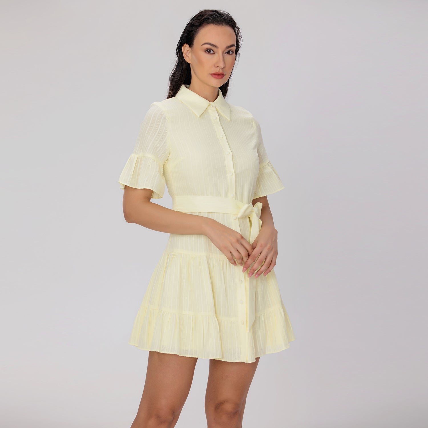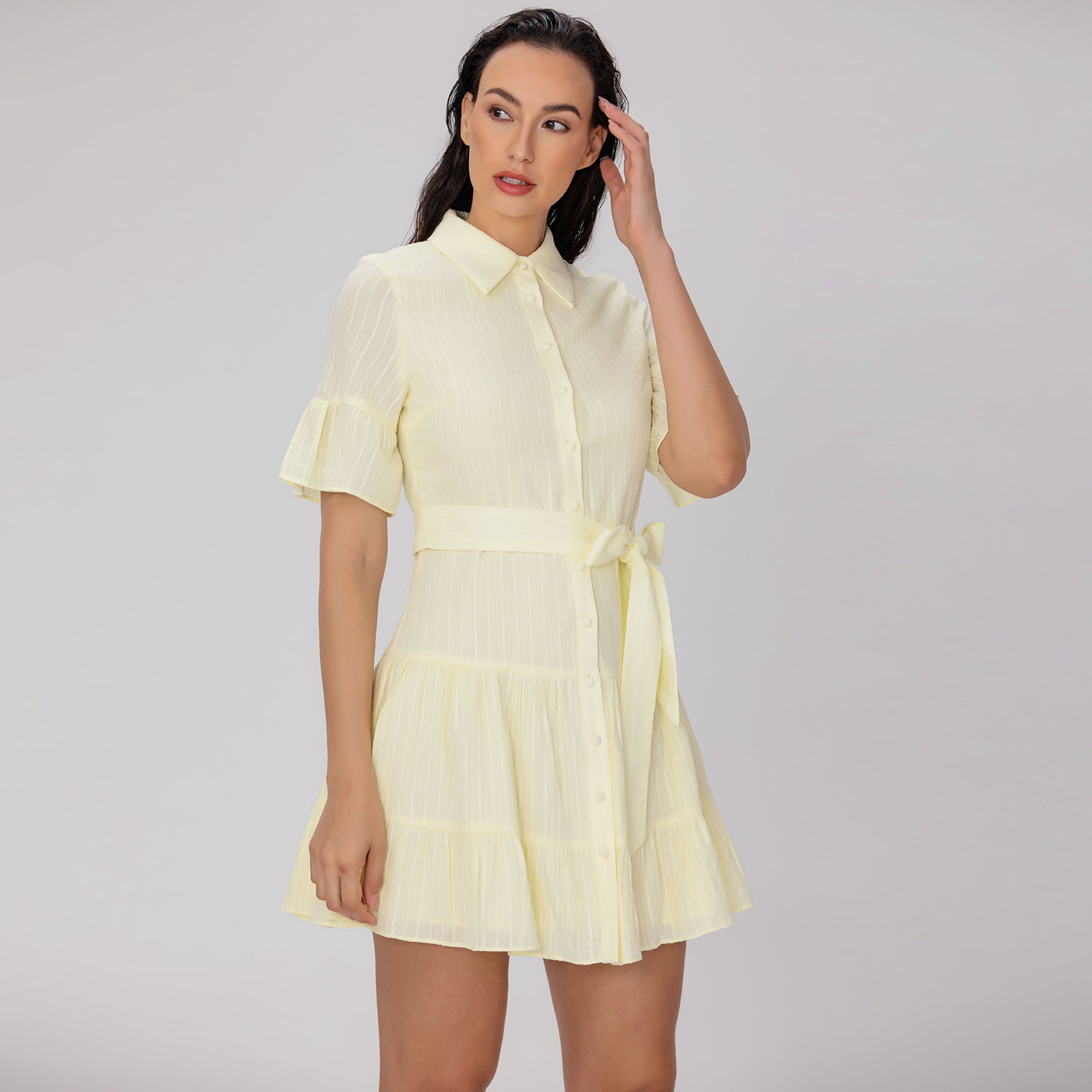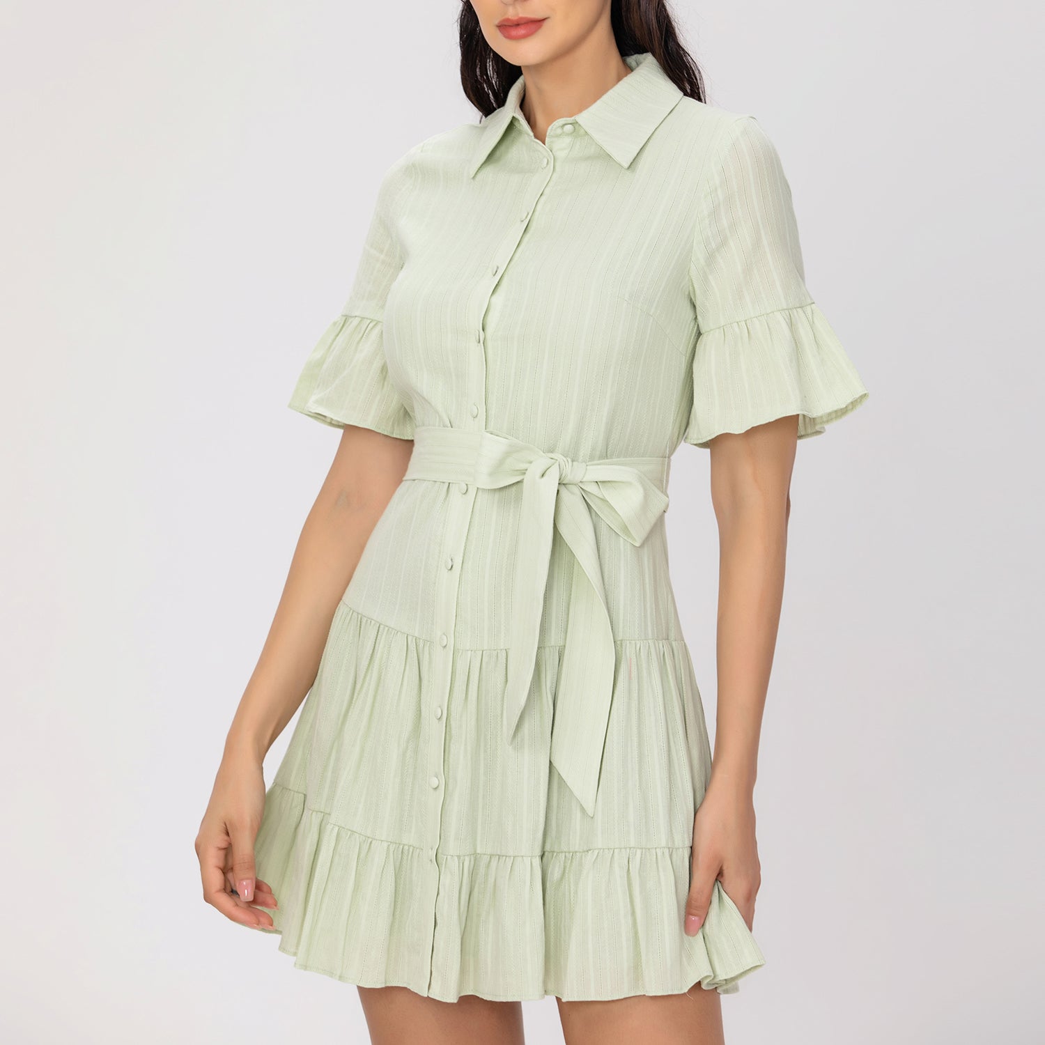 Cette robe chemise confectionnée en tissu léger et finement texturé, séduit par son style frais et féminin. Col chemise classique, manches courtes évasées, taille soulignée par une ceinture à nouer. La jupe à volants offre un mouvement aérien, parfait pour un look estival. Idéale pour une promenade ou une sortie décontractée entre amis ou des brunchs ensoleillés.\nUne pièce versatile qui s’associe aussi bien avec des sandales plates pour une allure décontractée qu’avec des escarpins pour un look plus raffiné.