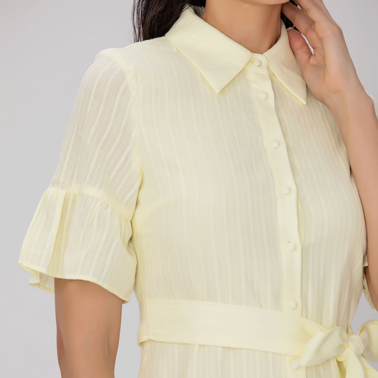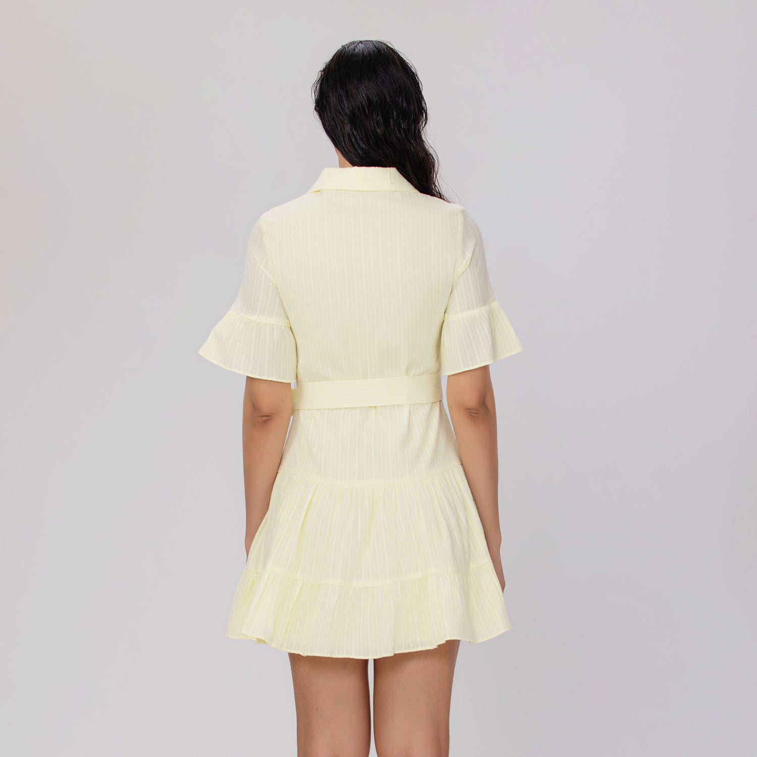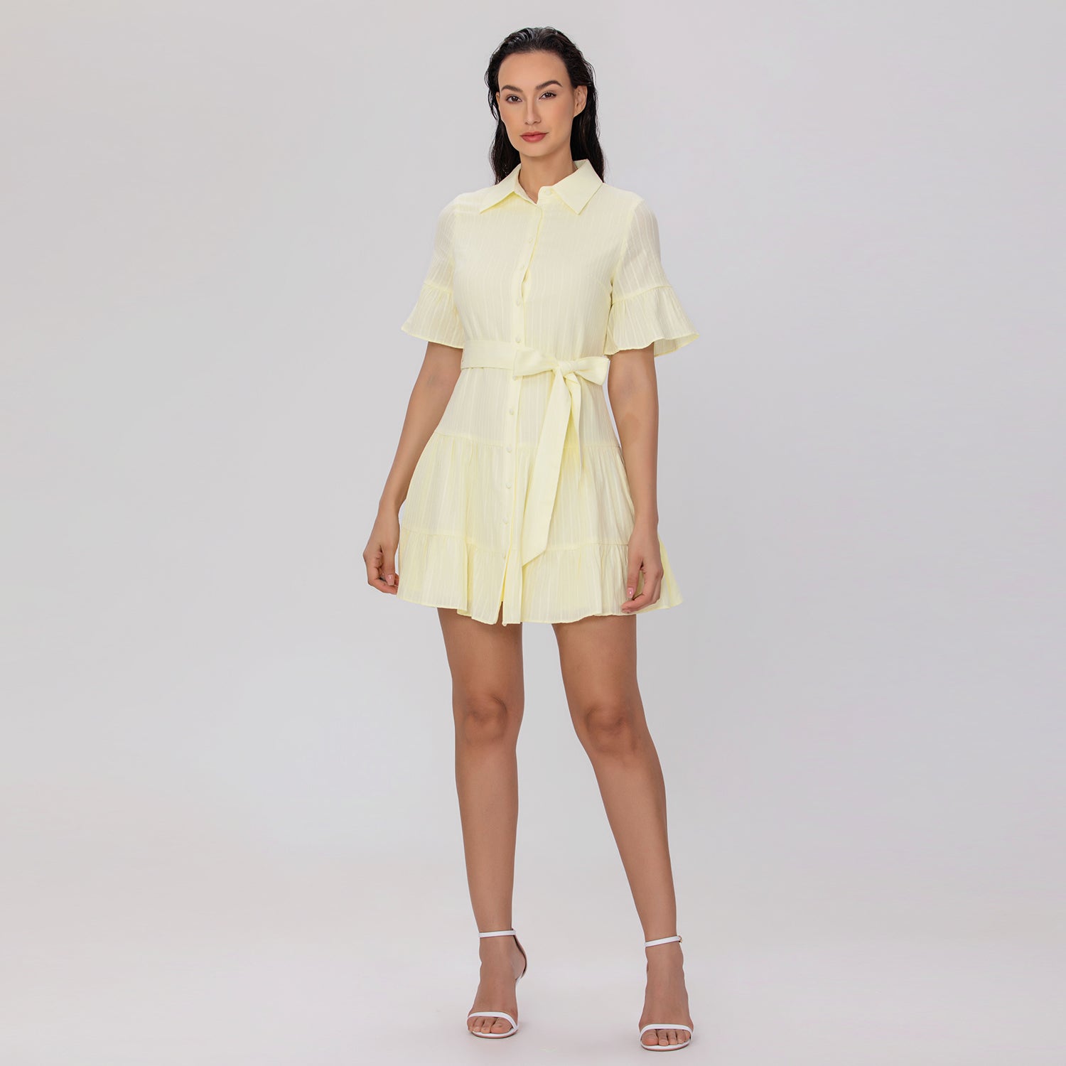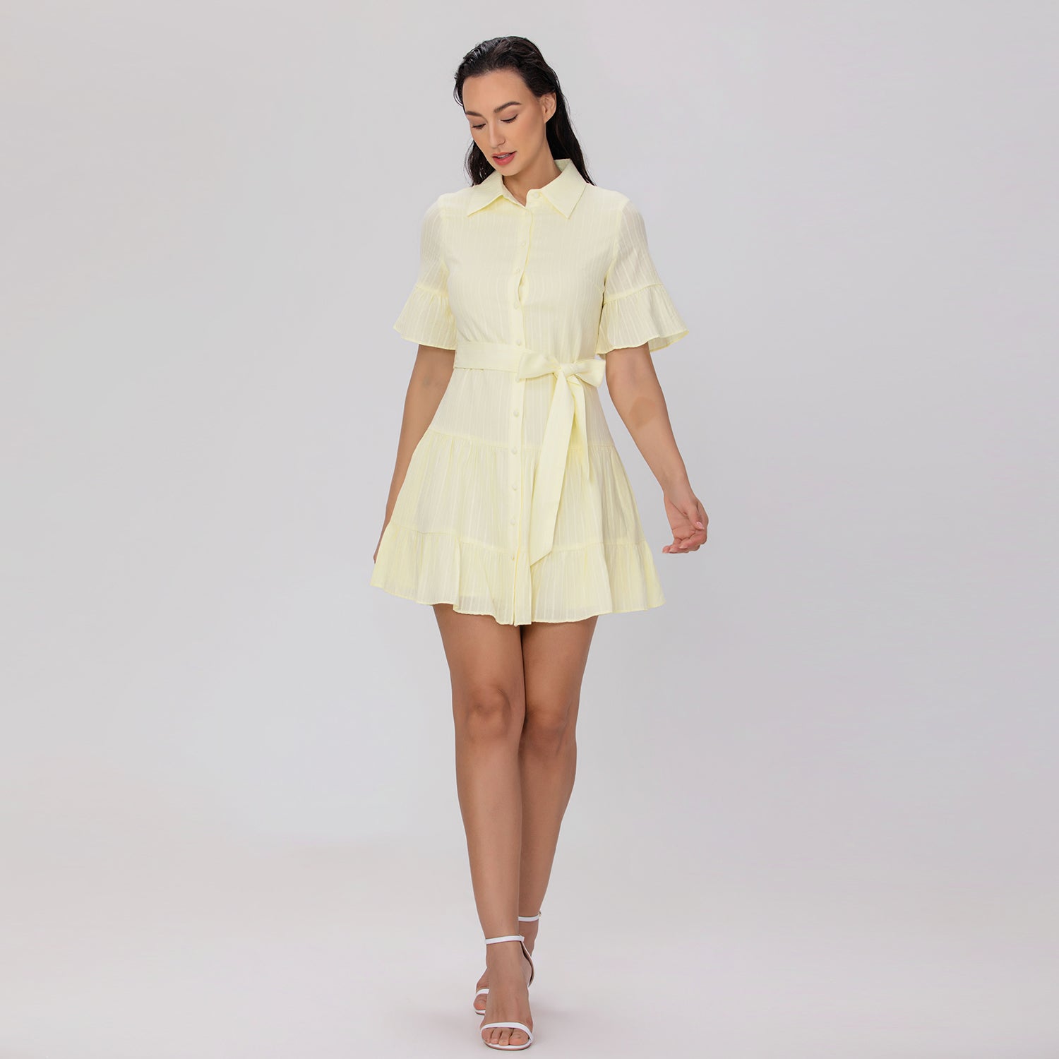 Cette robe chemise confectionnée en tissu léger et finement texturé, séduit par son style frais et féminin. Col chemise classique, manches courtes évasées, taille soulignée par une ceinture à nouer. La jupe à volants offre un mouvement aérien, parfait pour un look estival. Idéale pour une promenade ou une sortie décontractée entre amis ou des brunchs ensoleillés.\nUne pièce versatile qui s’associe aussi bien avec des sandales plates pour une allure décontractée qu’avec des escarpins pour un look plus raffiné.