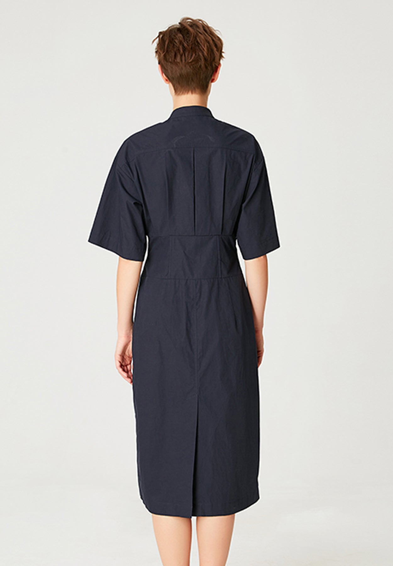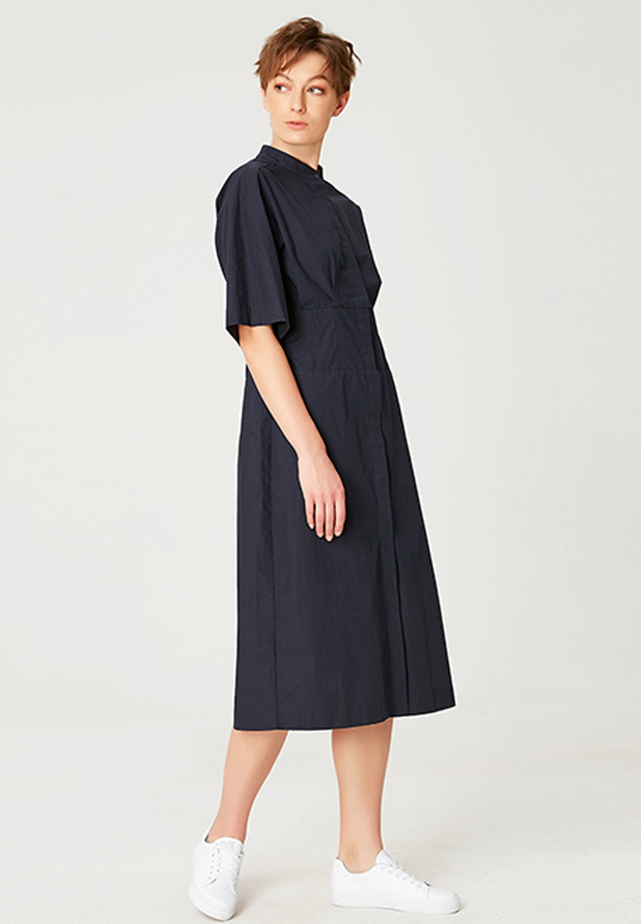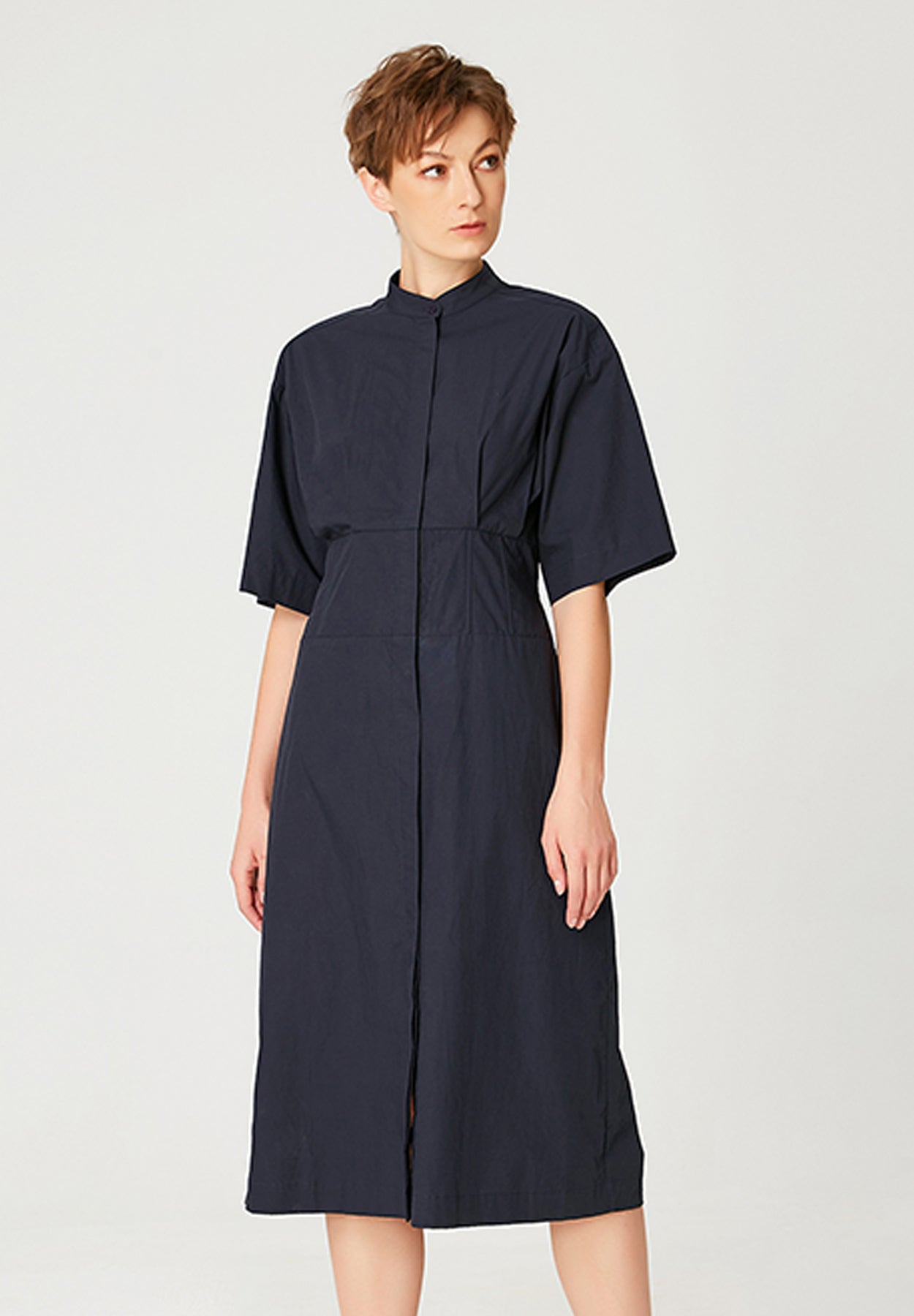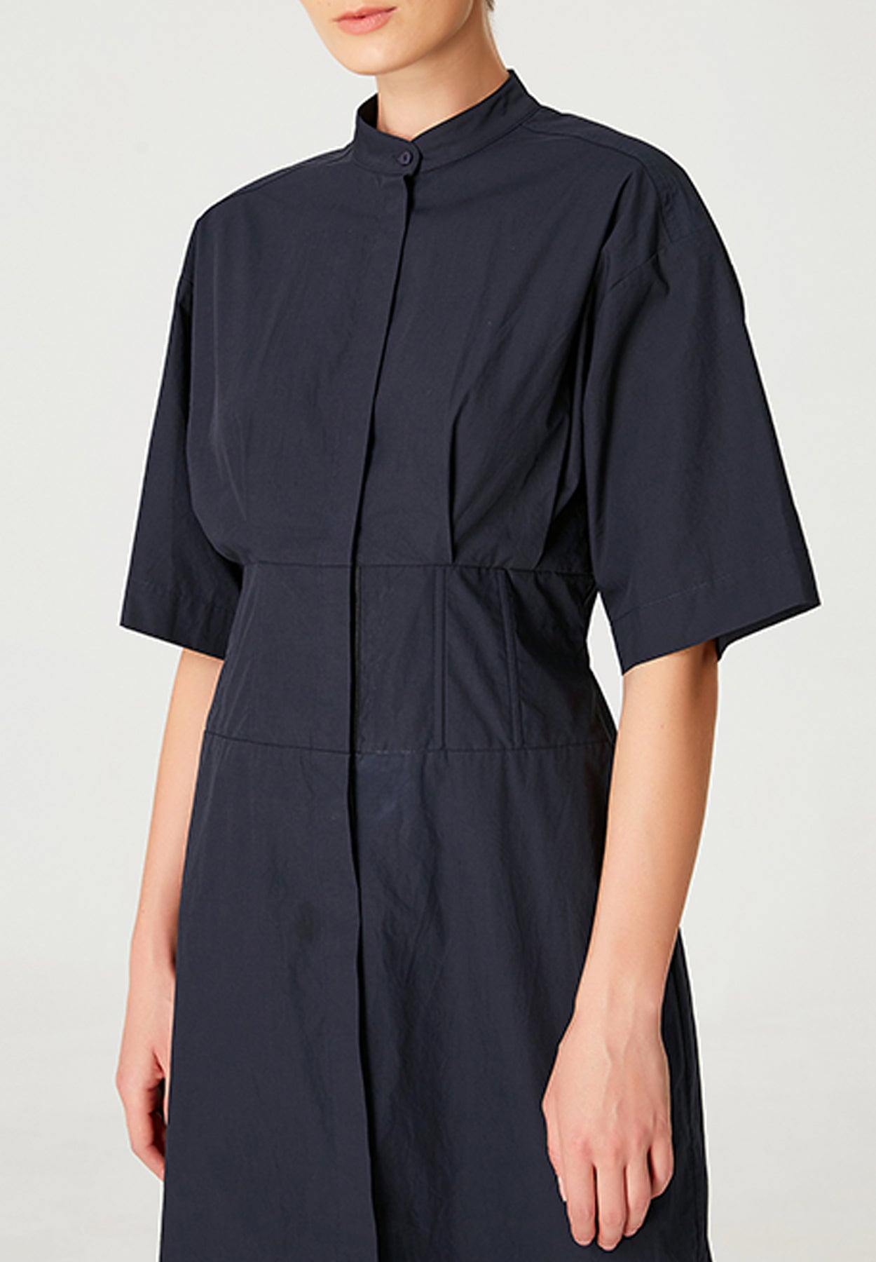 Une pièce originale et actuelle, cette robe chemise offre une coupe sophistiquée avec ses manches larges, sa taille soulignée avec une découpe type corset et son volume évasé. Le tout dans une popeline de coton rigide. The waist is highlighted with a corset-style structure. All in a rigid cotton poplin.