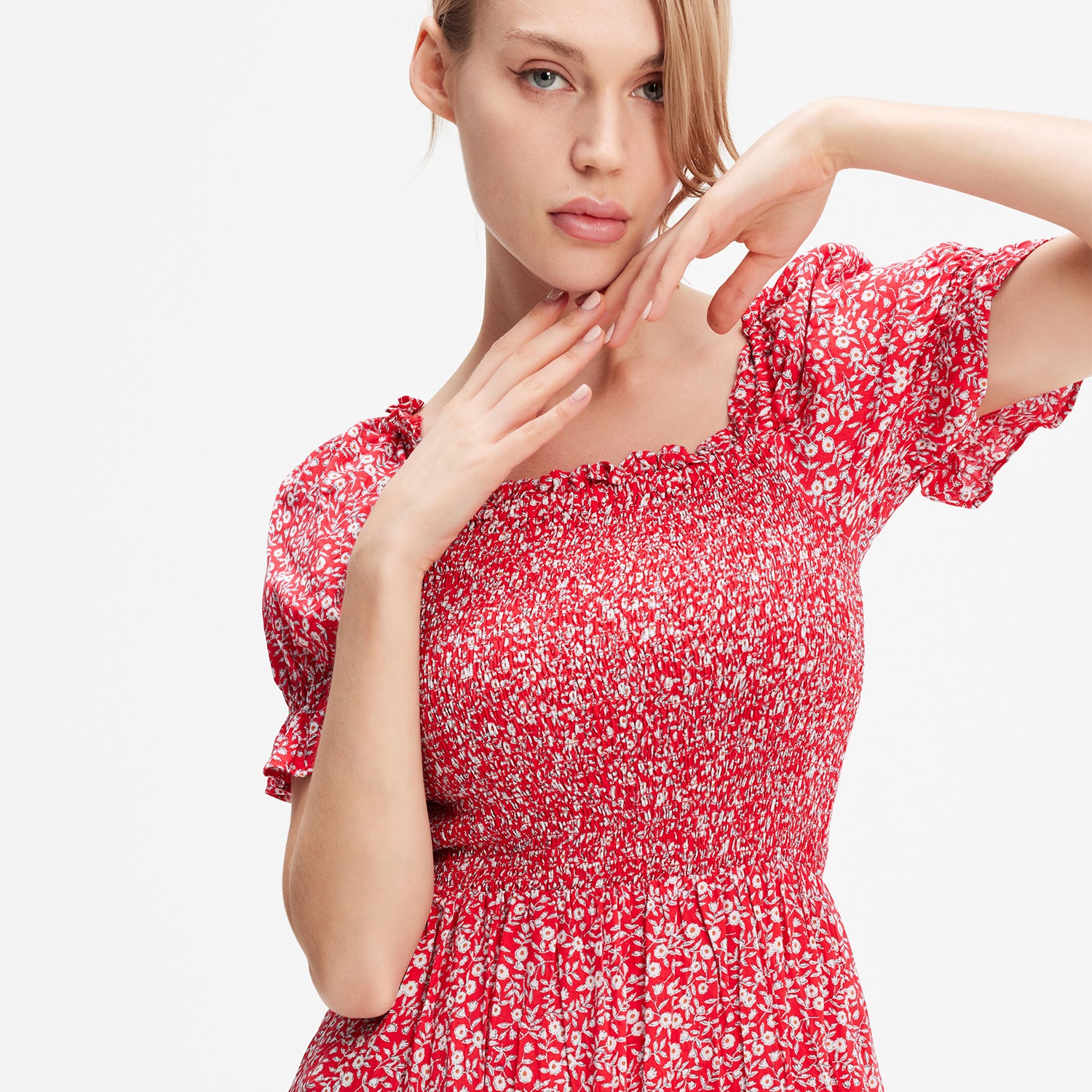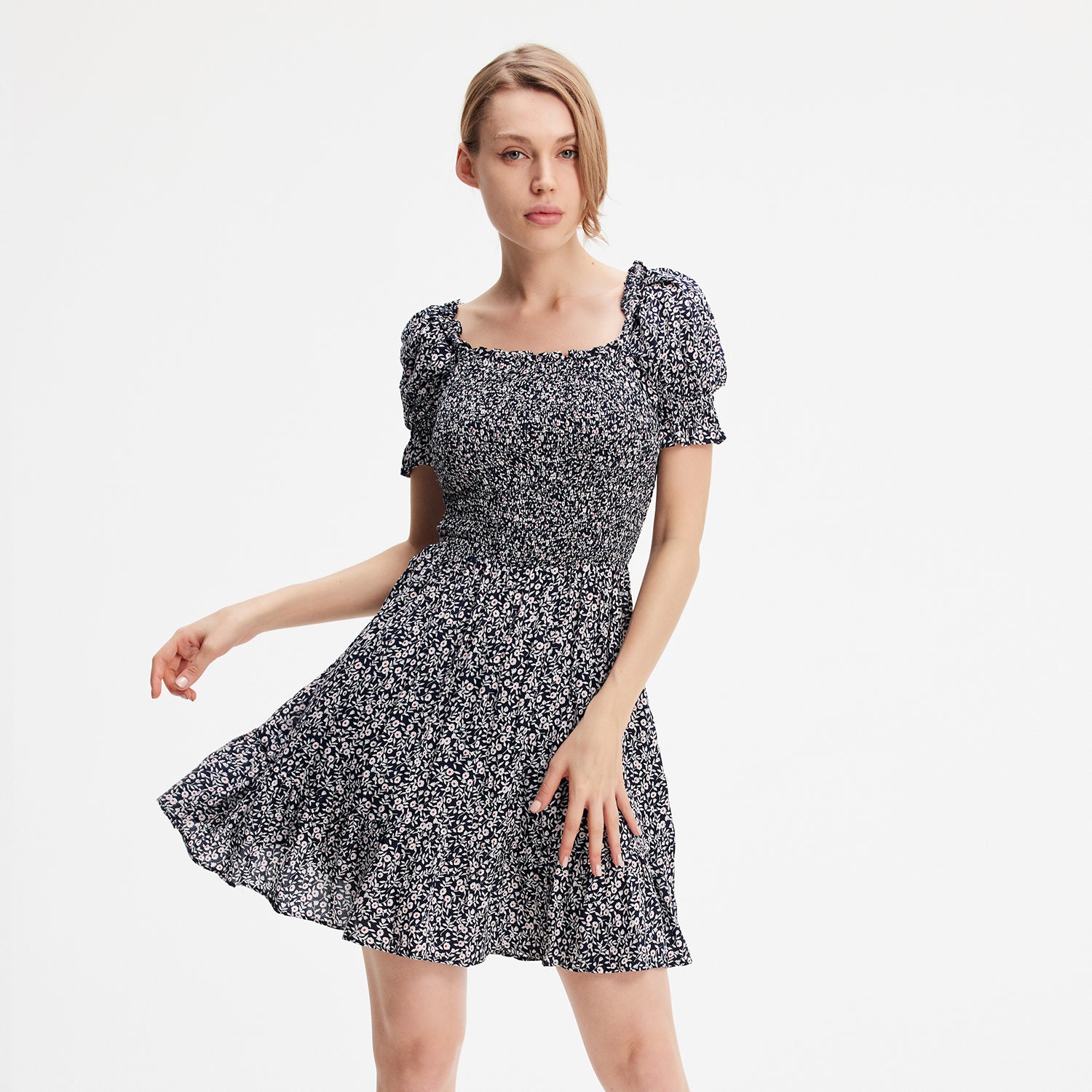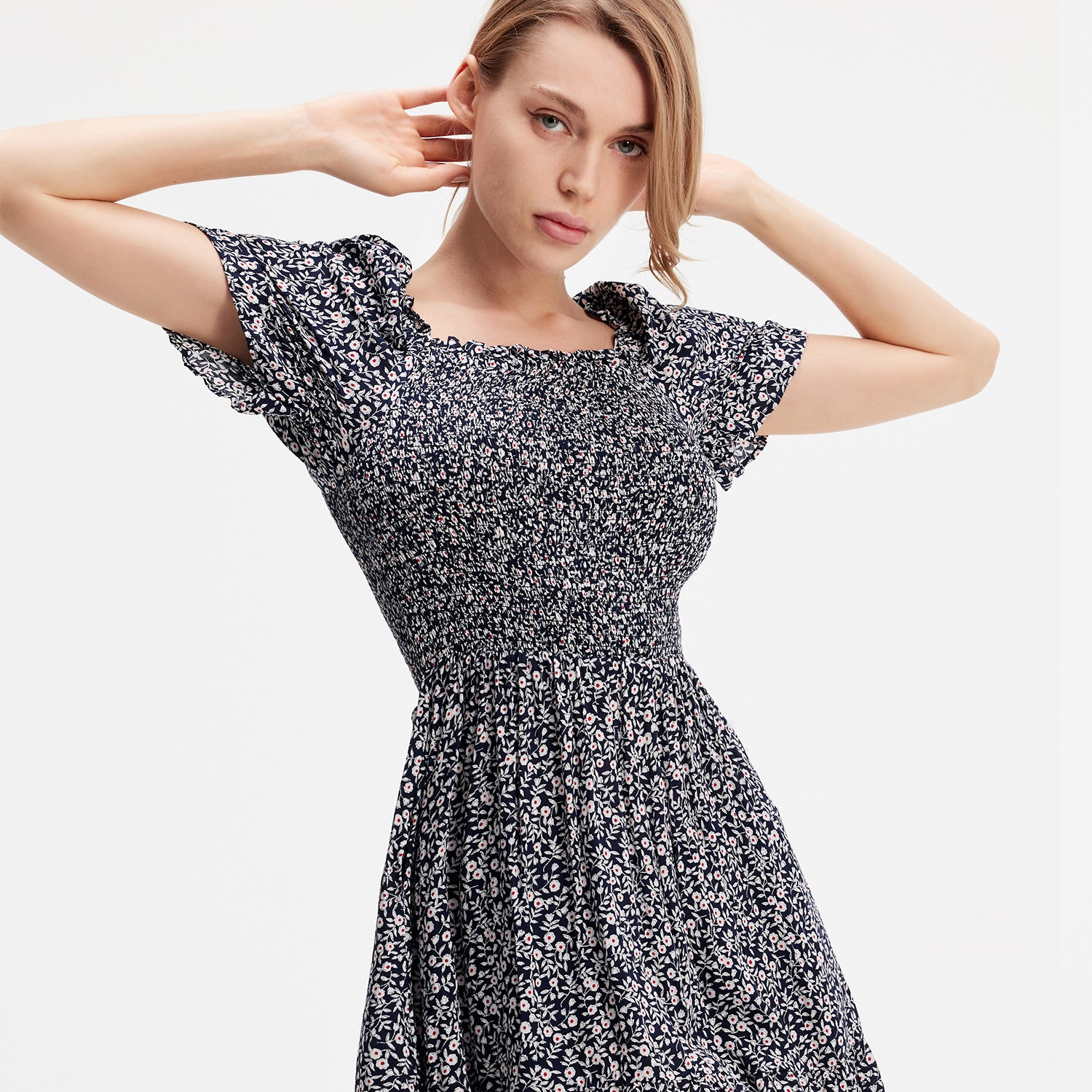 Une pièce courte facile à porter et légère. Buste ajusté grâces aux smocks, manches légèrement bouffantes et volume de jupe évasé. A porter avec des sneakers pour une allure décontractée.