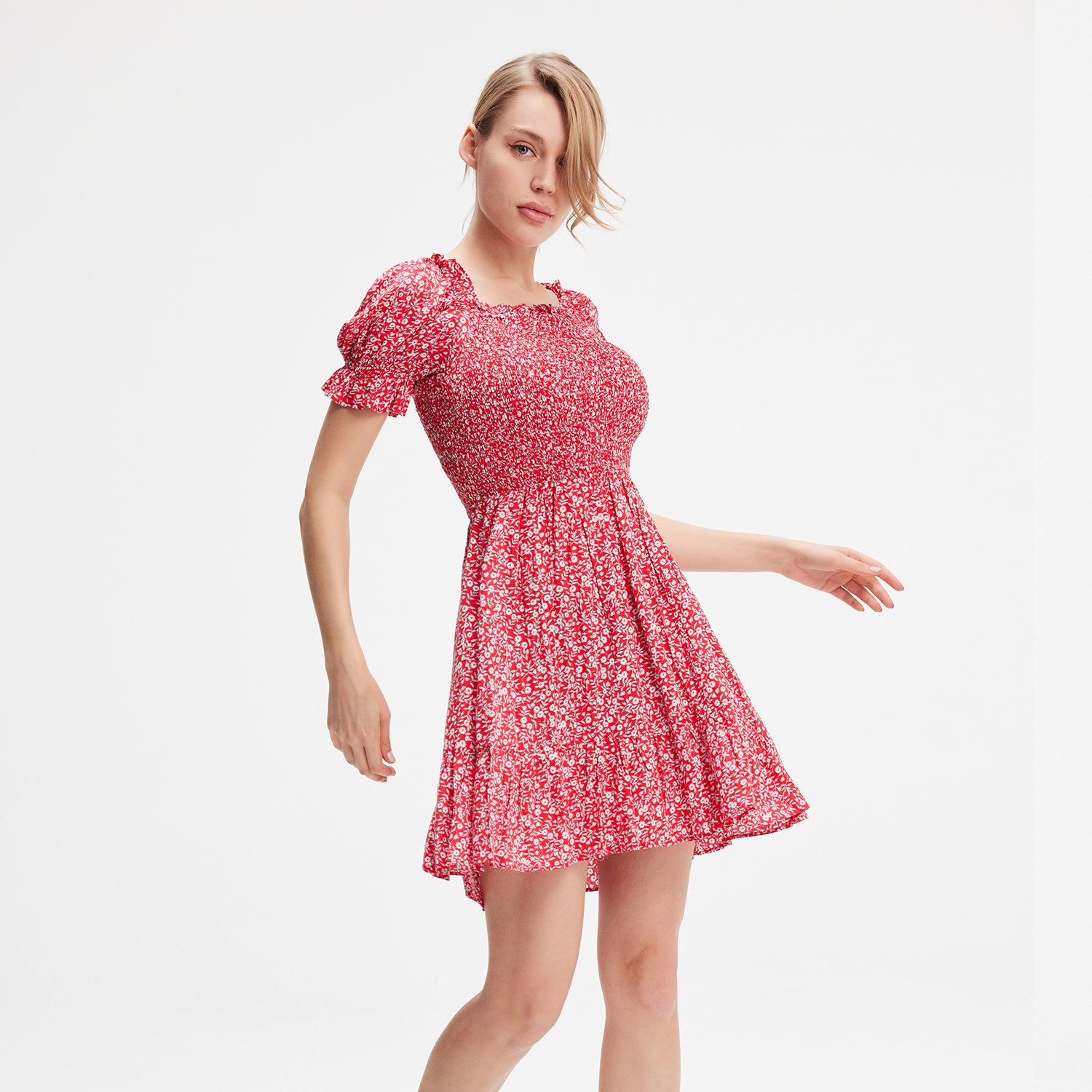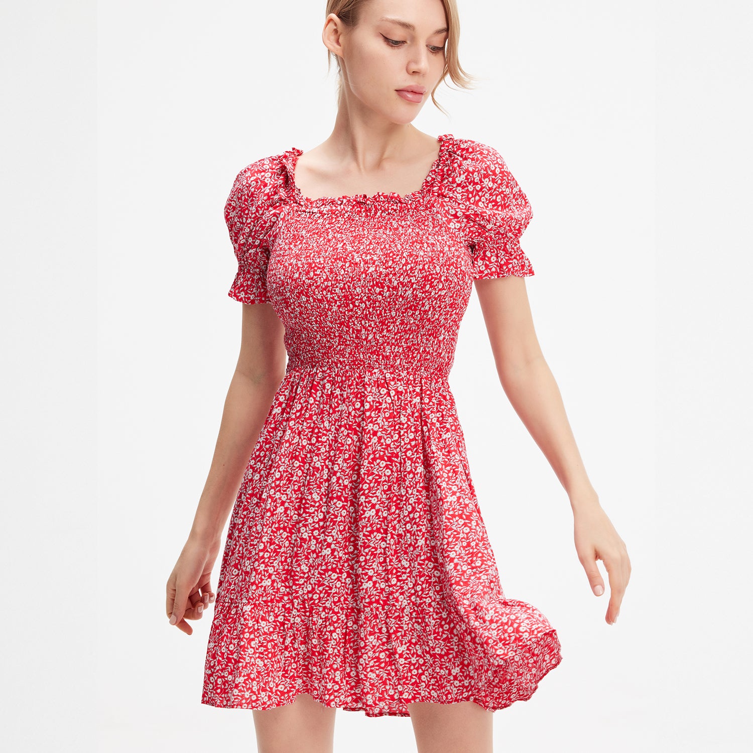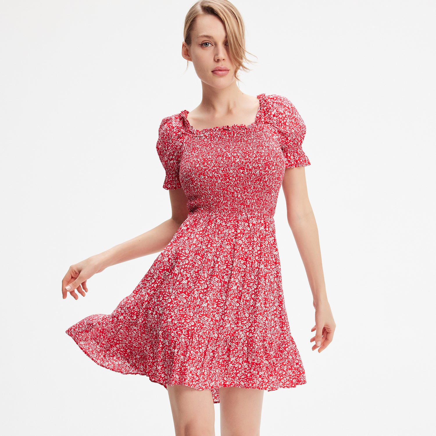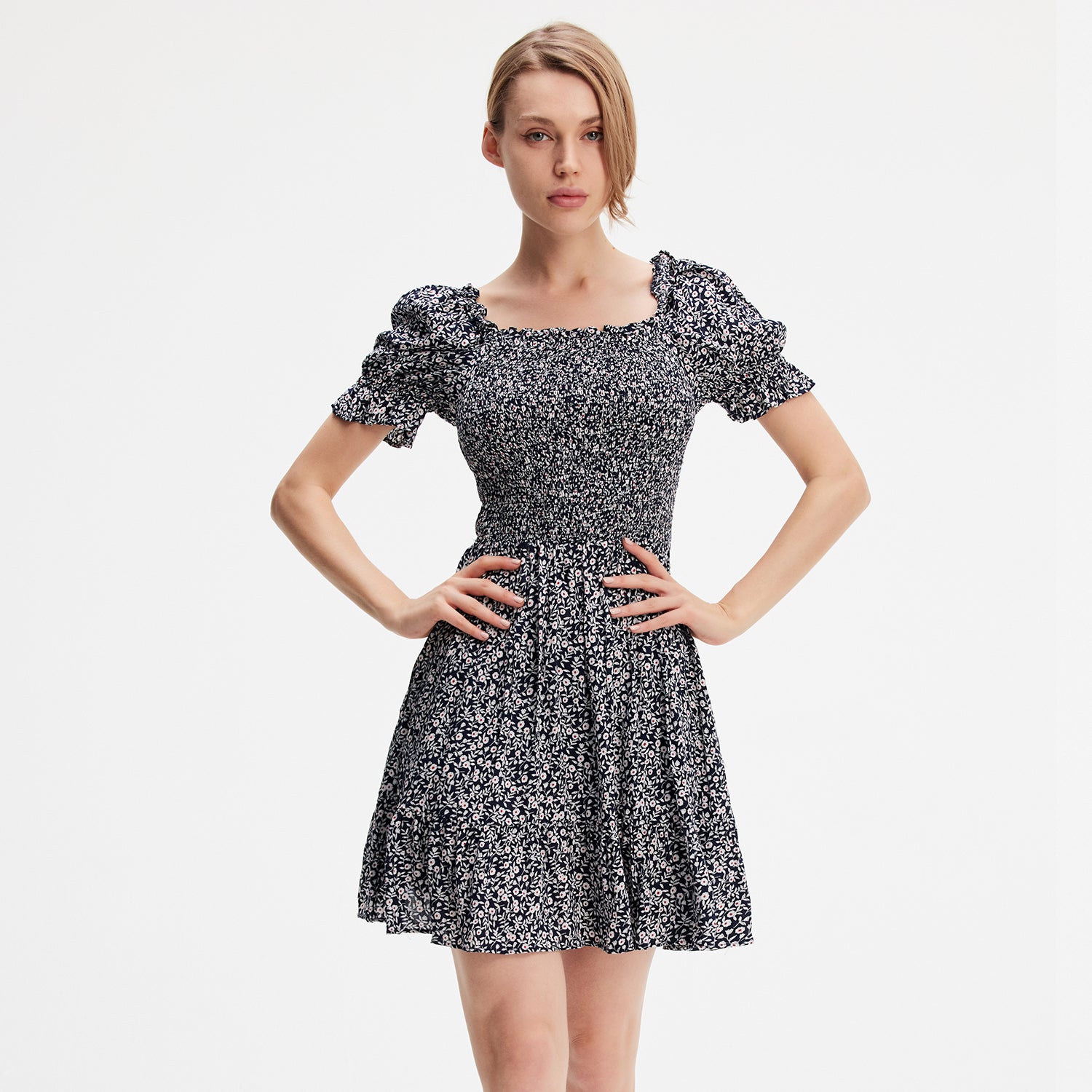 Une pièce courte facile à porter et légère. Buste ajusté grâces aux smocks, manches légèrement bouffantes et volume de jupe évasé. A porter avec des sneakers pour une allure décontractée.