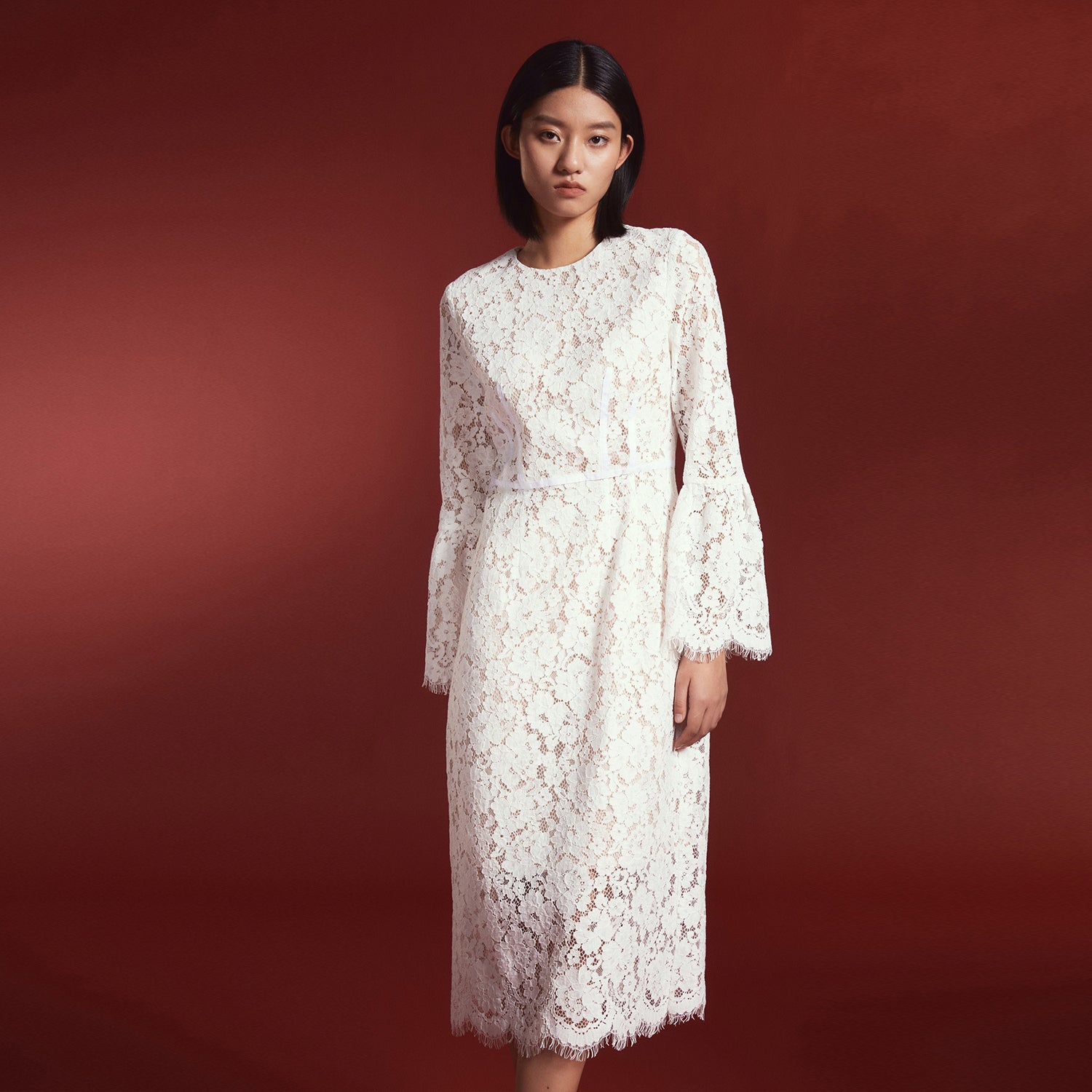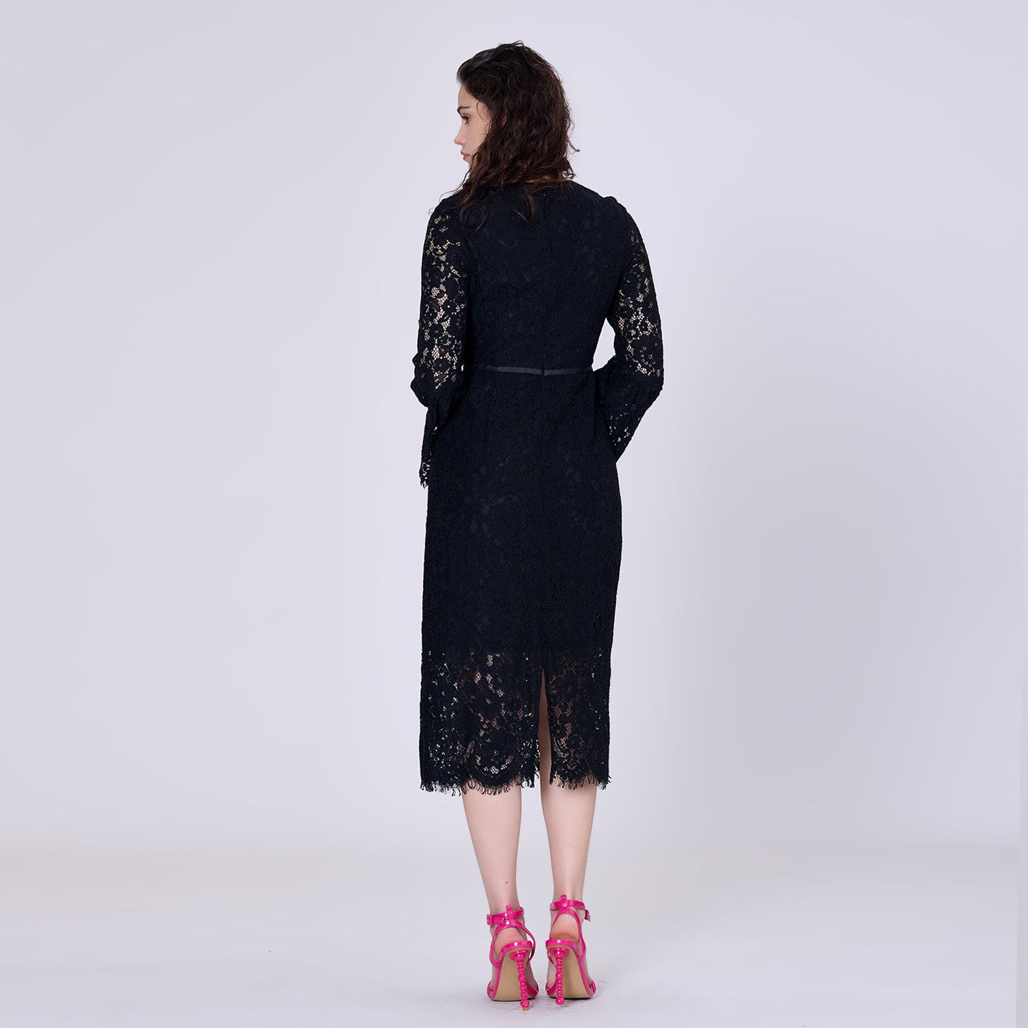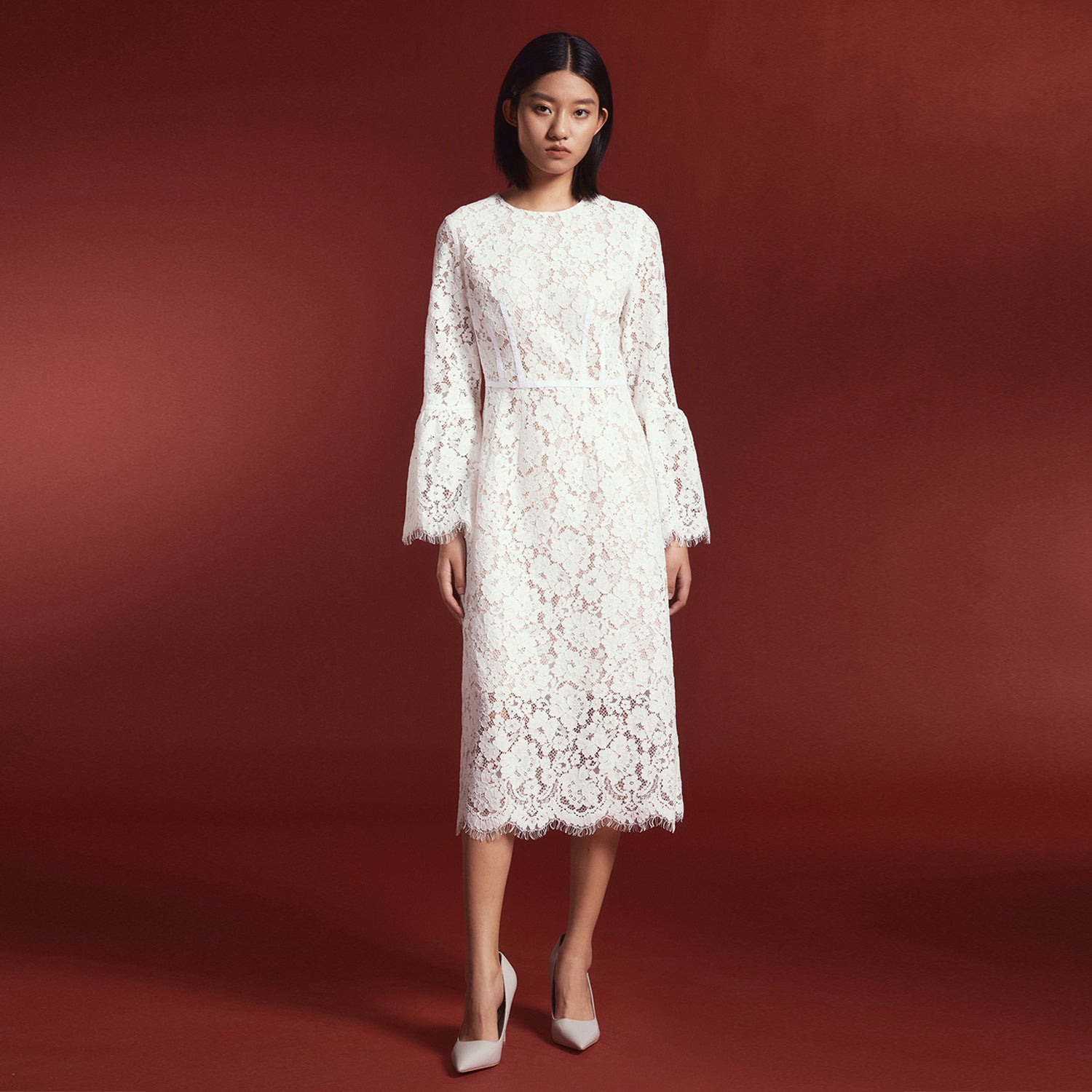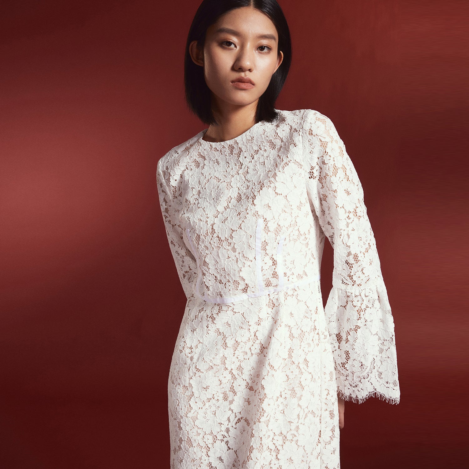 Cette robe arbore un look à la fois glamour et moderne grâce à sa dentelle et sa construction sculpturale. Forme prêt-du-corps, relevée au buste et à la taille par de fins rubans satinés rappelant les lignes d’un corset, manches longues finissant par un volume évasé. Une pièce à exhiber lors votre prochain cocktail ou soirée ou mariage.