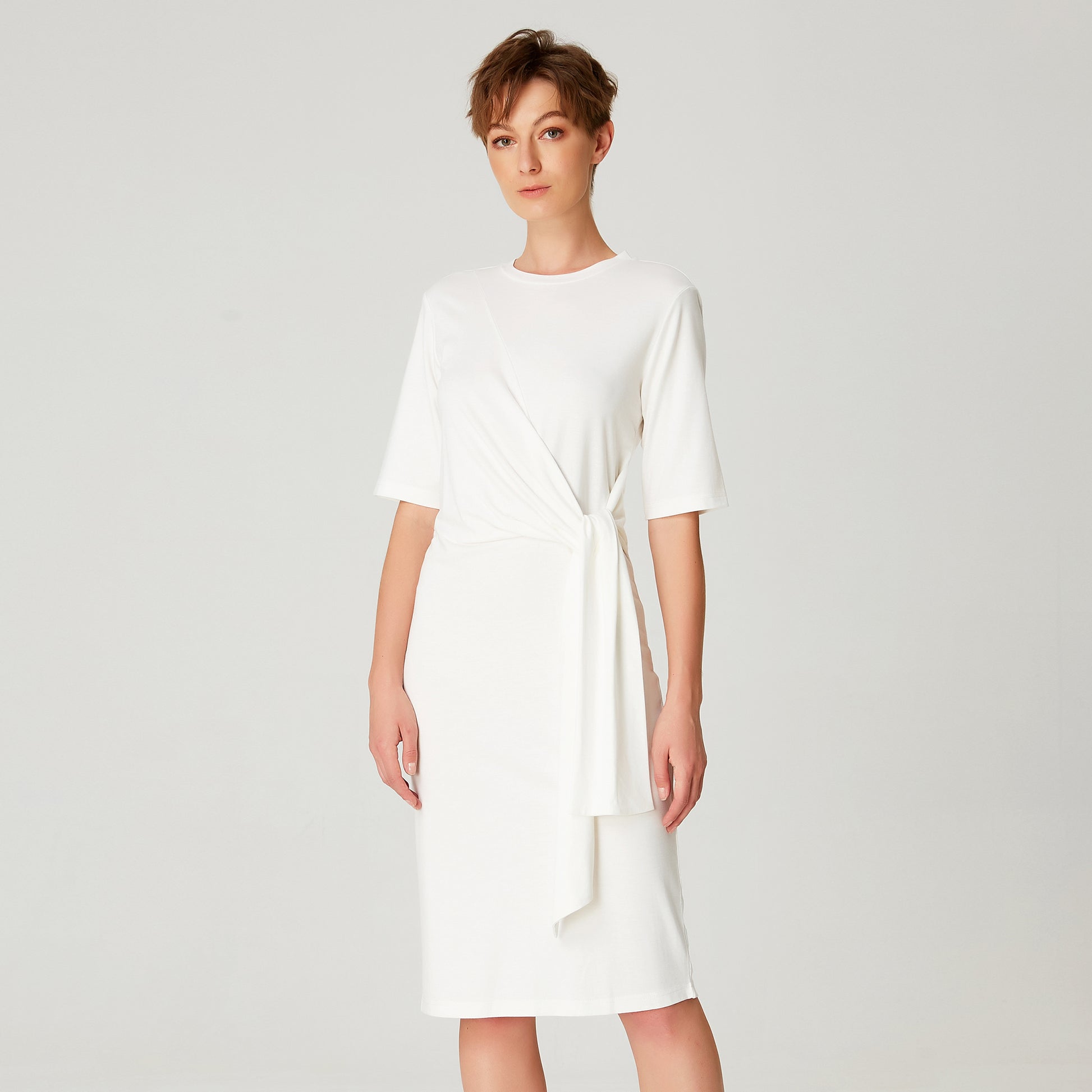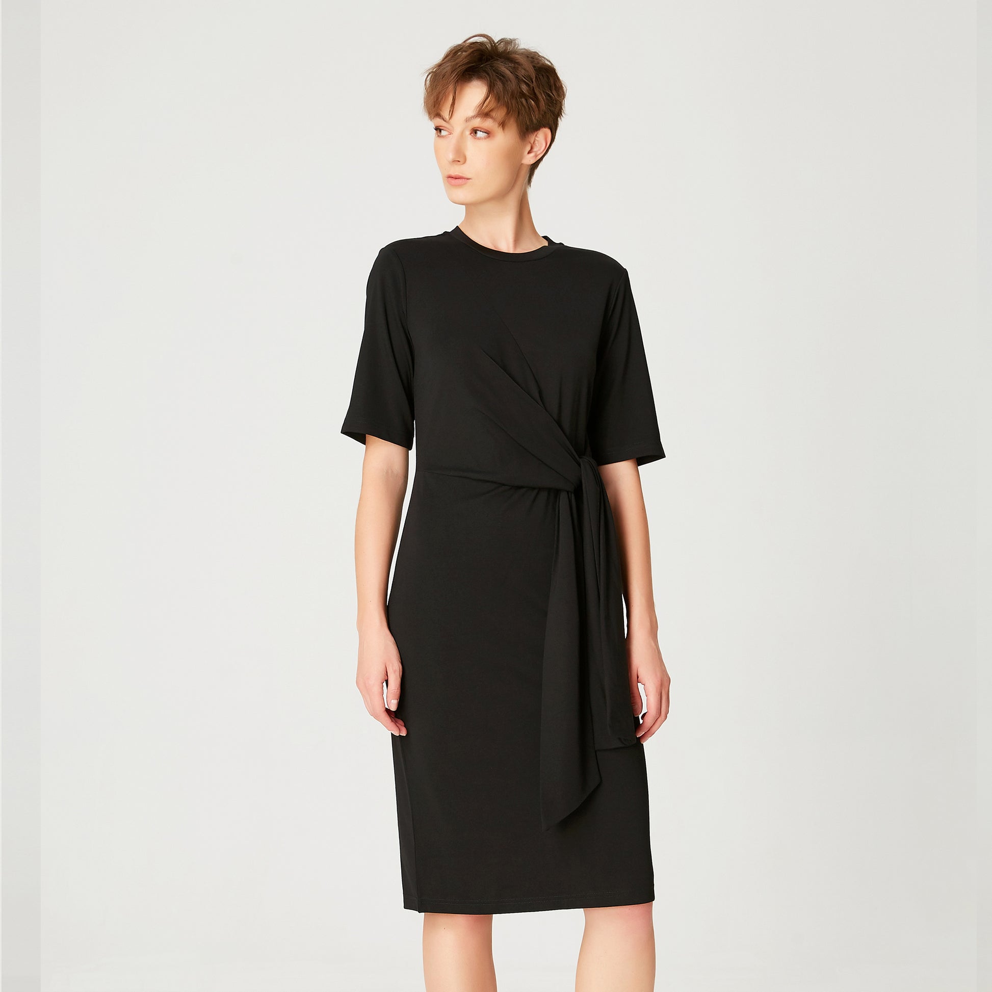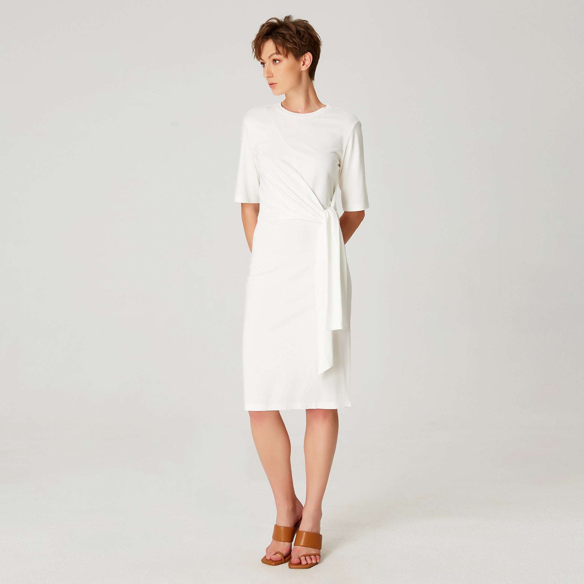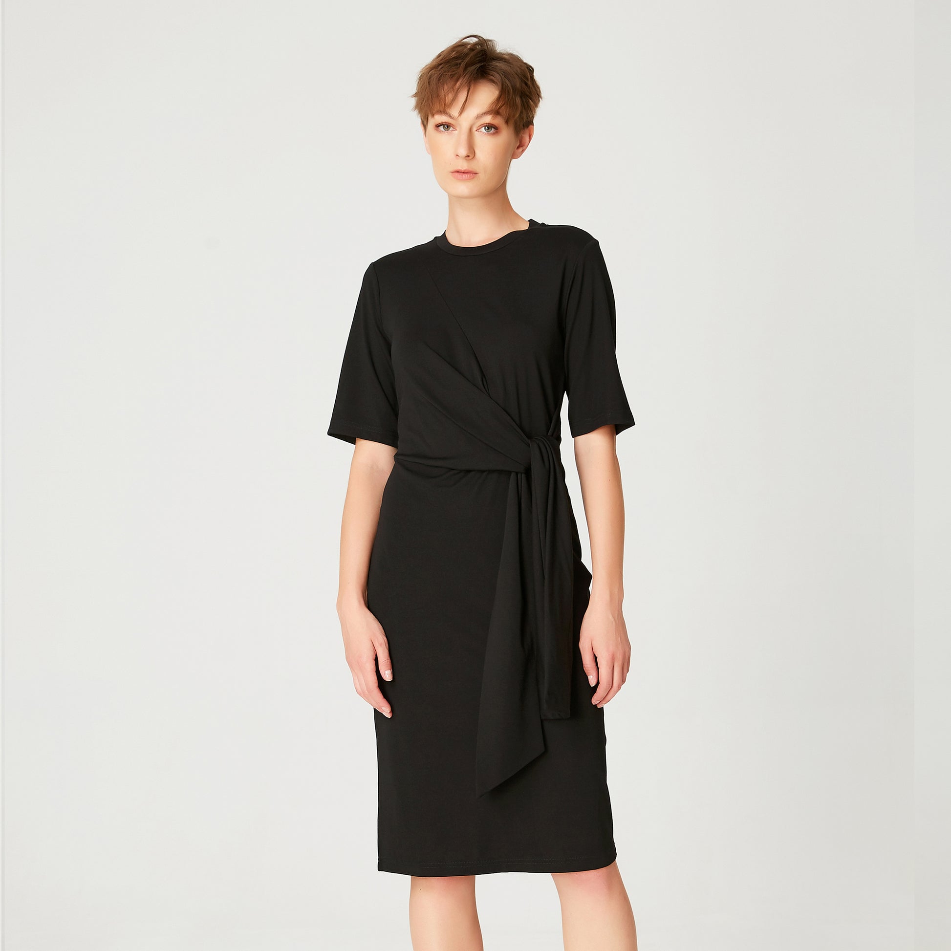 Une pièce de caractère, à la fois décontractée et originale avec un drapé asymétrique devant créé par deux pans à nouer. Une façon subtile de souligner la taille à votre convenance. Une robe élégante qui se porte aussi bien au bureau qu’en soirée. A subtle way to emphasize the waist to your liking. An elegant dress that can be worn both in the office and in the evening.