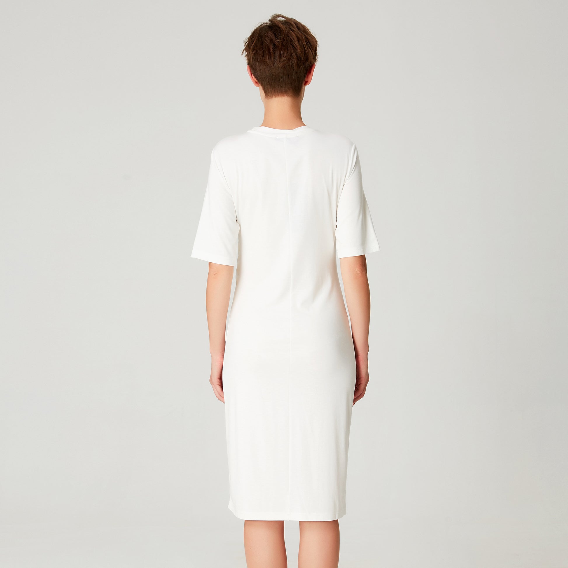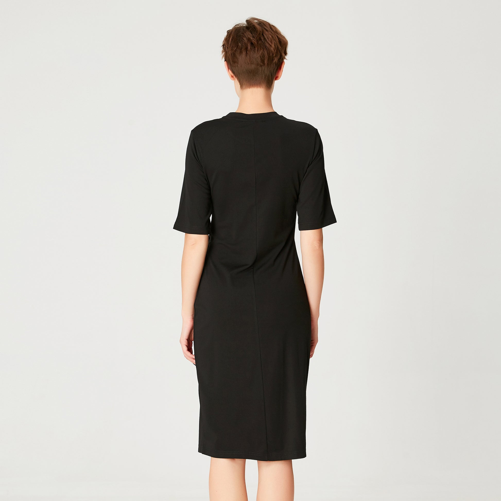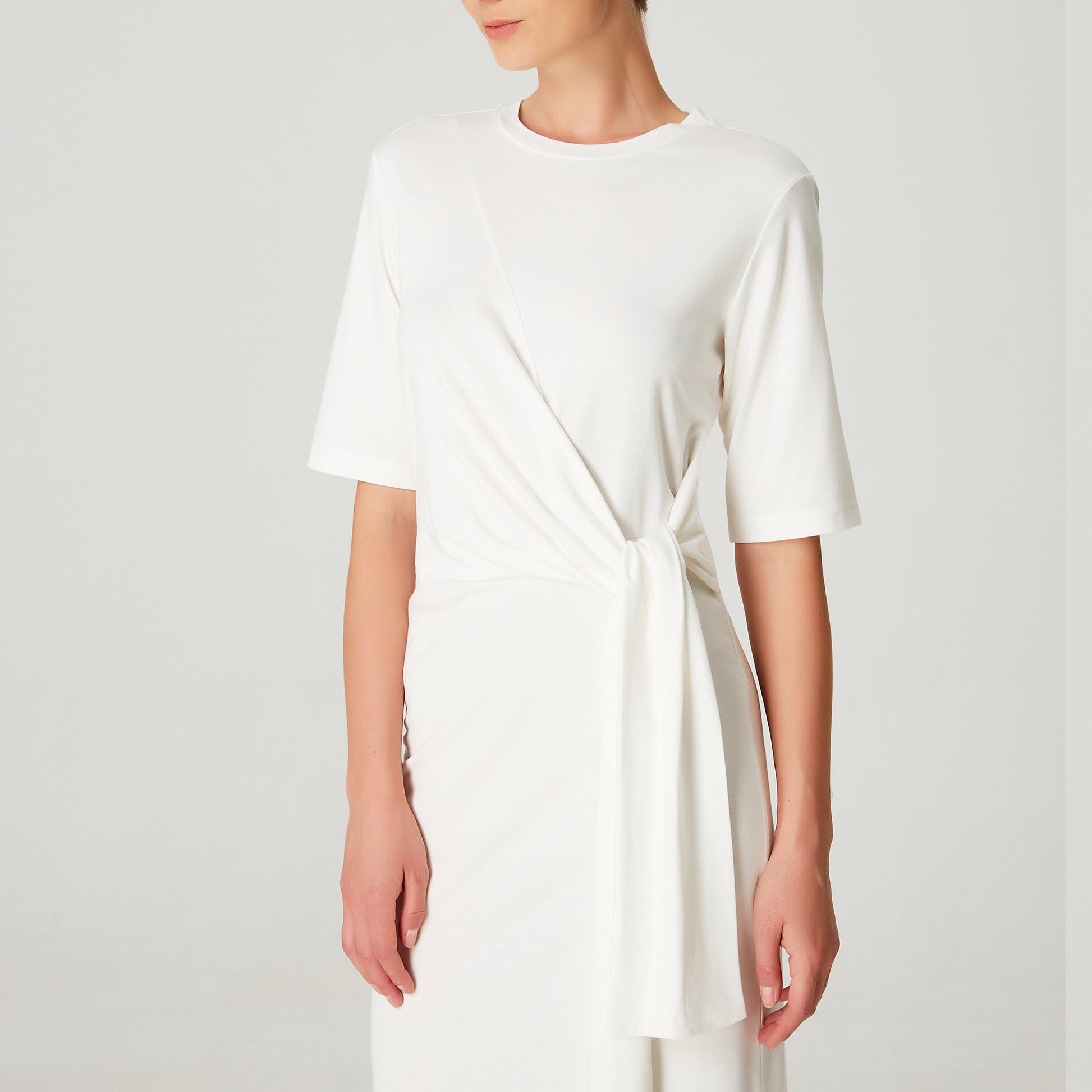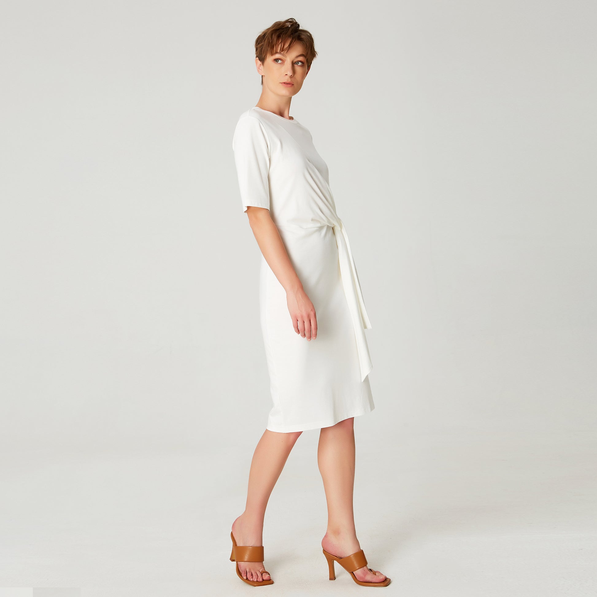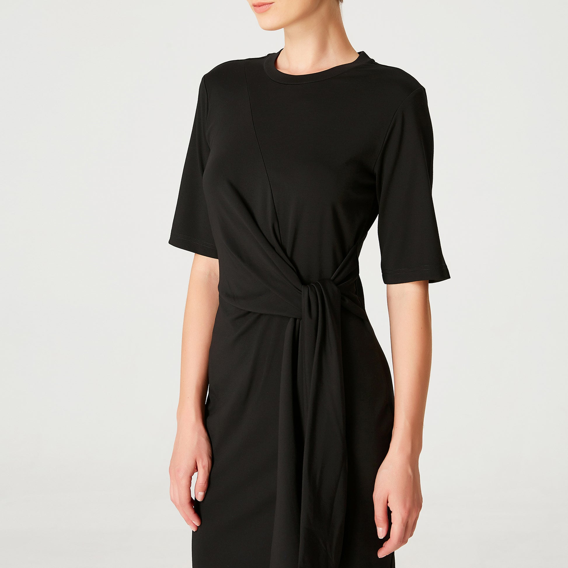 Une pièce de caractère, à la fois décontractée et originale avec un drapé asymétrique devant créé par deux pans à nouer. Une façon subtile de souligner la taille à votre convenance. Une robe élégante qui se porte aussi bien au bureau qu’en soirée. A subtle way to emphasize the waist to your liking. An elegant dress that can be worn both in the office and in the evening.