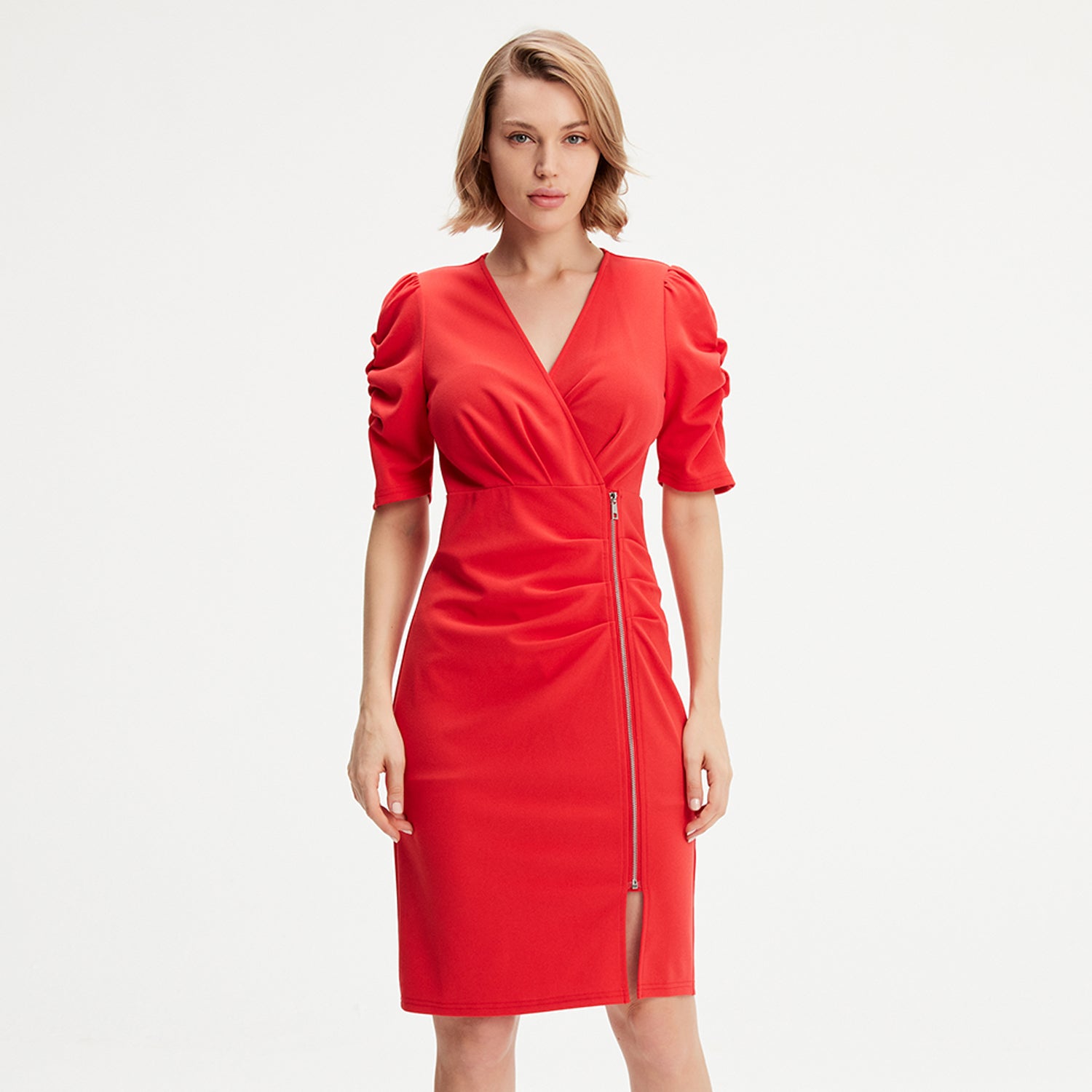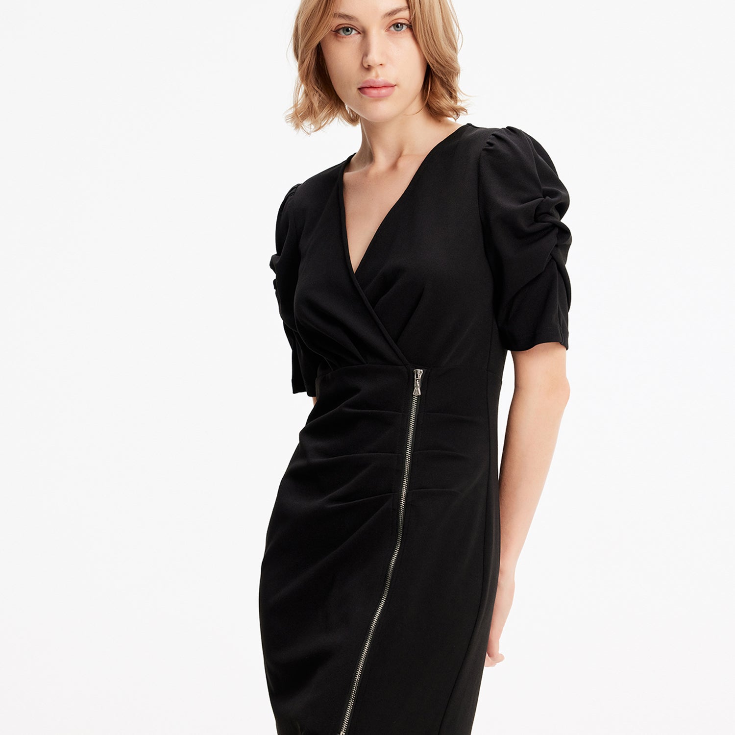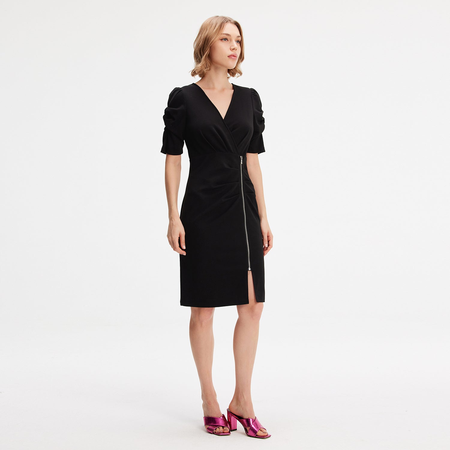 Confortable et séduisante, cette pièce souligne élégamment ma silhouette par sa découpe empire, son décolleté V et sa ligne près du corps. Ouverte sur le côté- devant grâce à un zip et un système portefeuille. Manches agrémentés de fronces. A porter en journée comme en soirée.