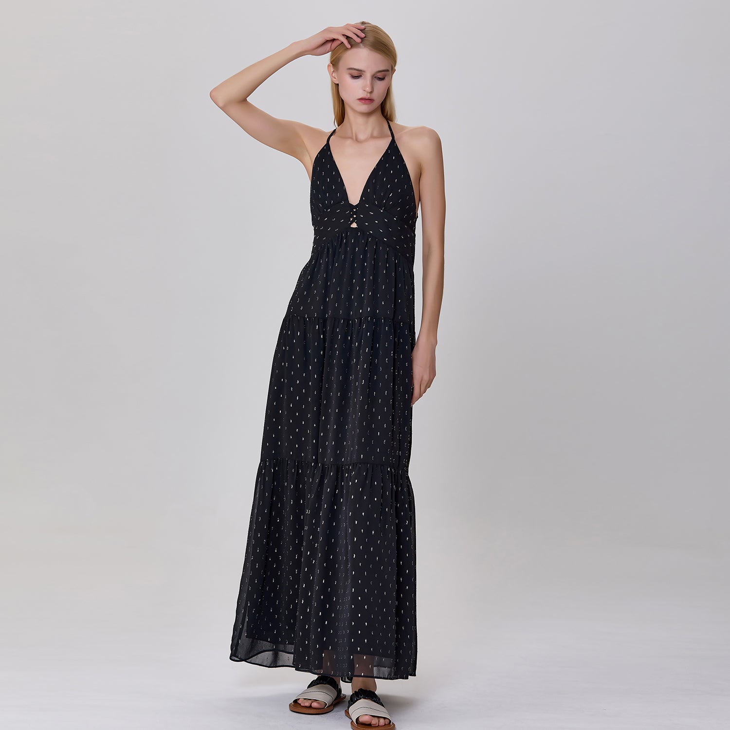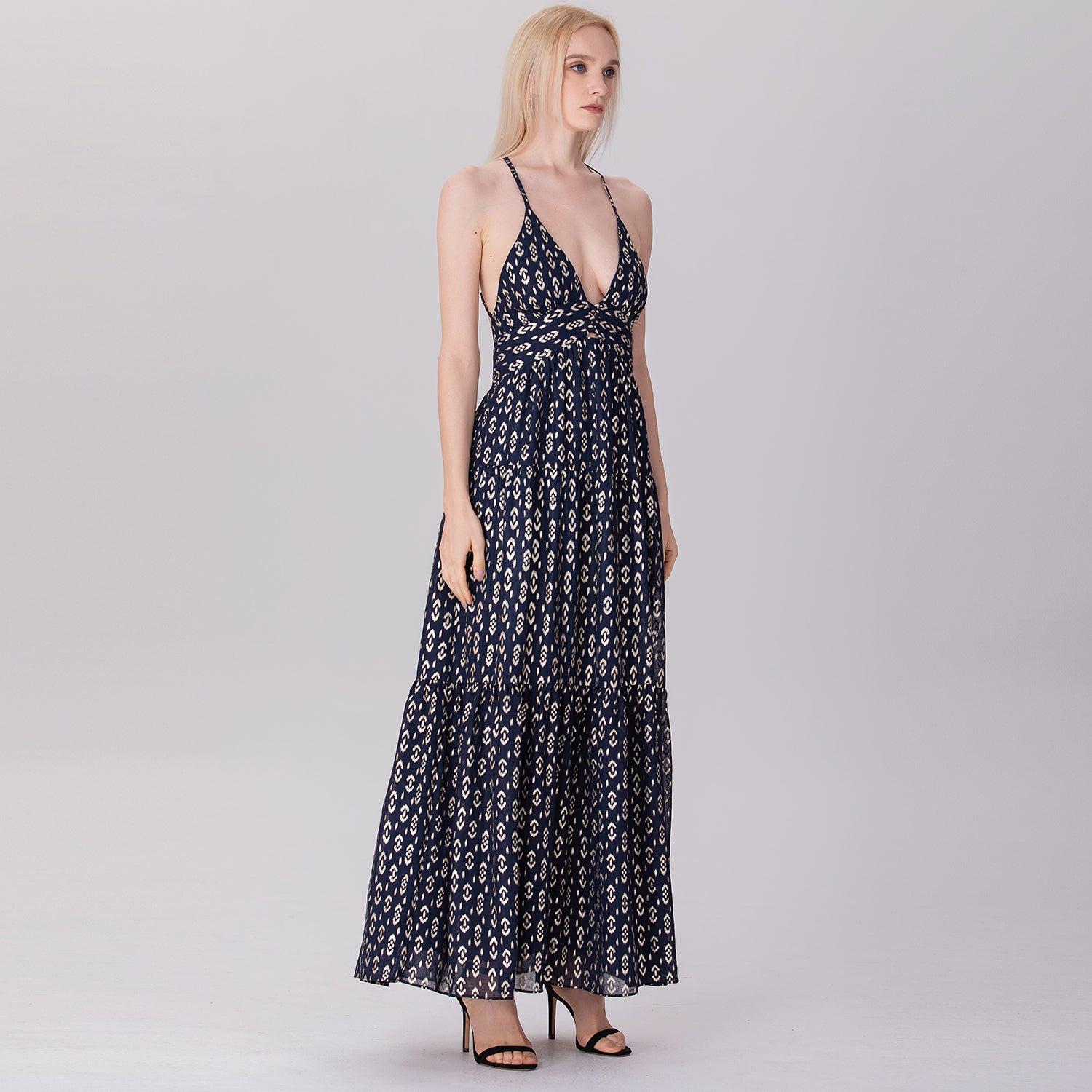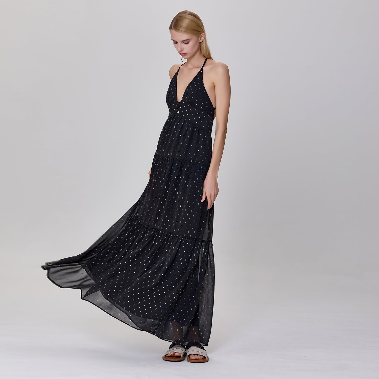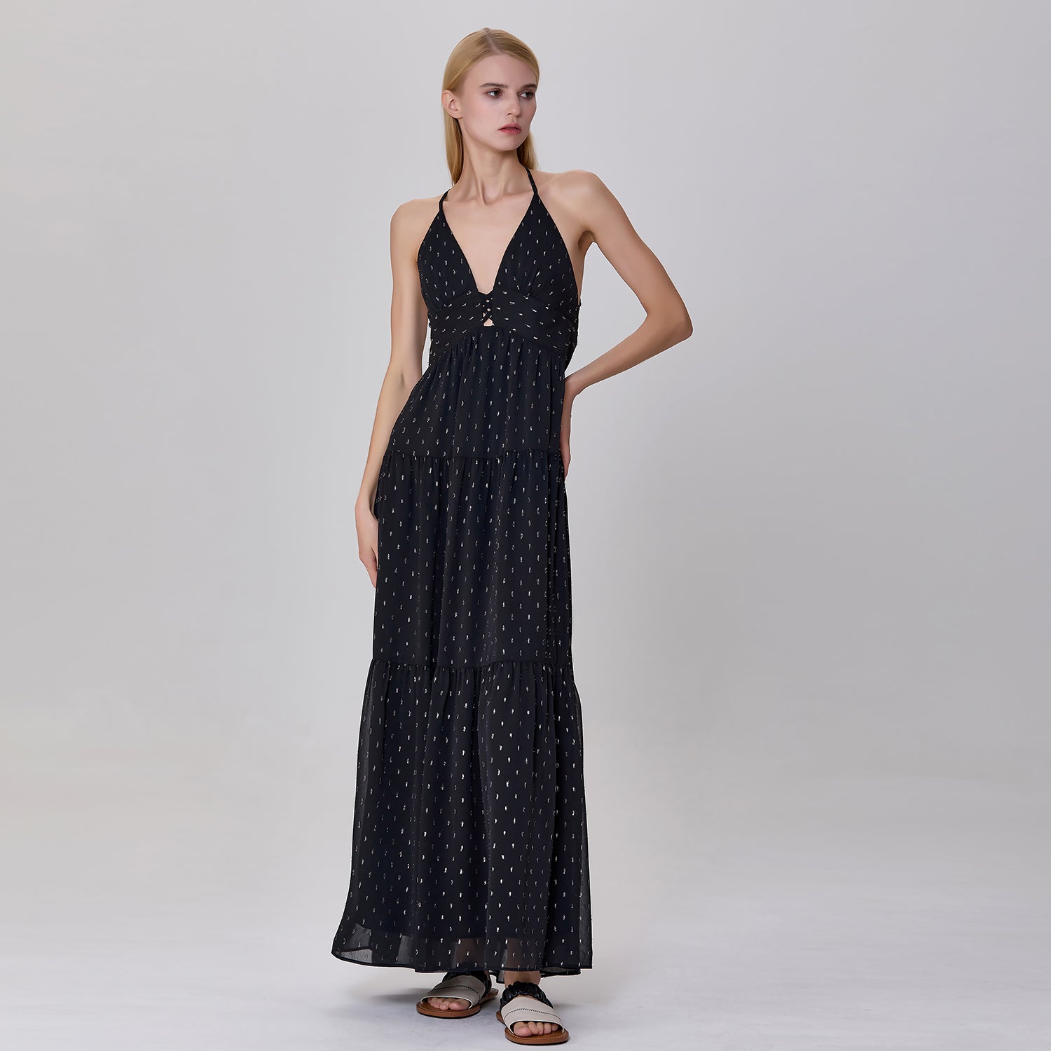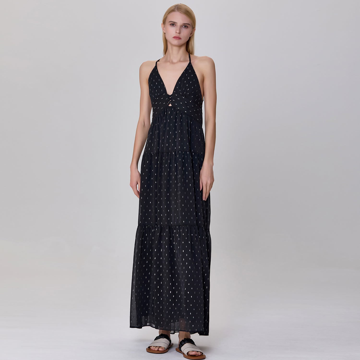 Une robe longue et élégante qui présente un décolleté en V profond et un ajouré sur le buste avec des croisillons audacieux. Sa coupe empire ajustée sous la poitrine s'élargit progressivement en une jupe fluide à plusieurs niveaux, créant un mouvement léger et aérien. Les bretelles fines, croisées dans le dos et son ouverture plongeante apportent une touche séduisante et glamour, parfaite pour des occasions estivales décontractées ou semi-formelles.