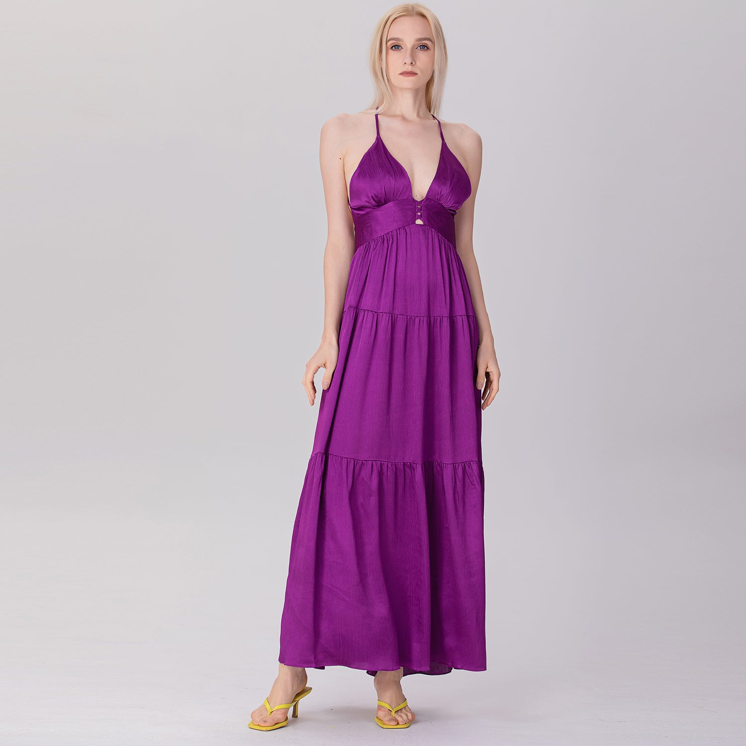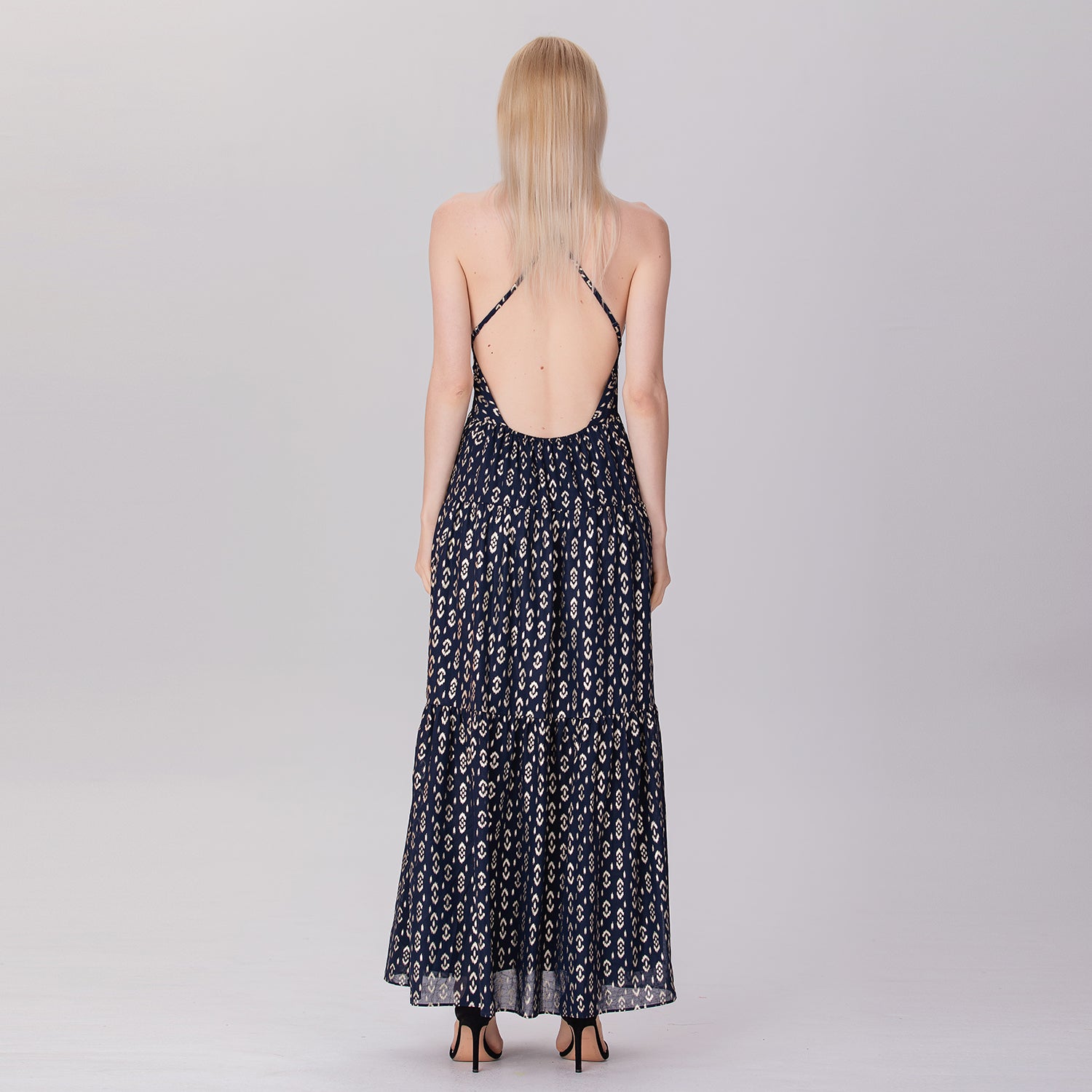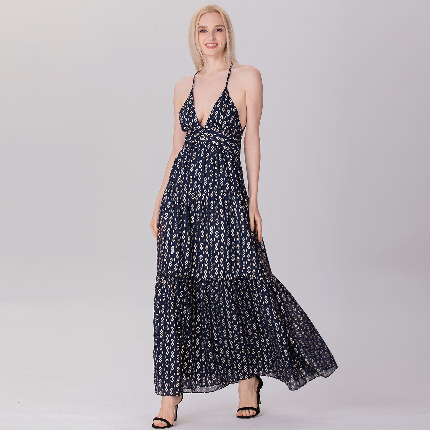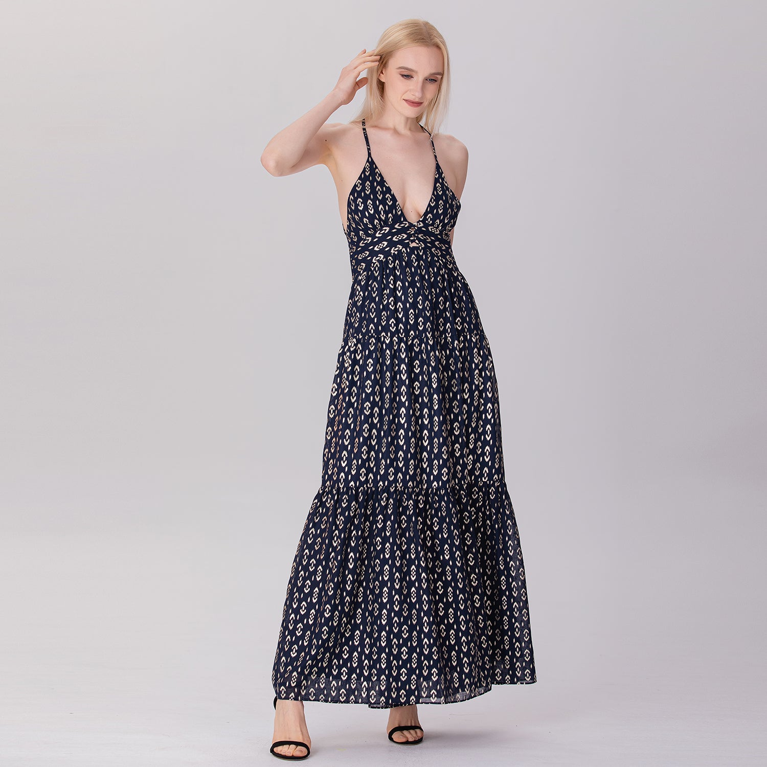 Une robe longue et élégante qui présente un décolleté en V profond et un ajouré sur le buste avec des croisillons audacieux. Sa coupe empire ajustée sous la poitrine s'élargit progressivement en une jupe fluide à plusieurs niveaux, créant un mouvement léger et aérien. Les bretelles fines, croisées dans le dos et son ouverture plongeante apportent une touche séduisante et glamour, parfaite pour des occasions estivales décontractées ou semi-formelles.