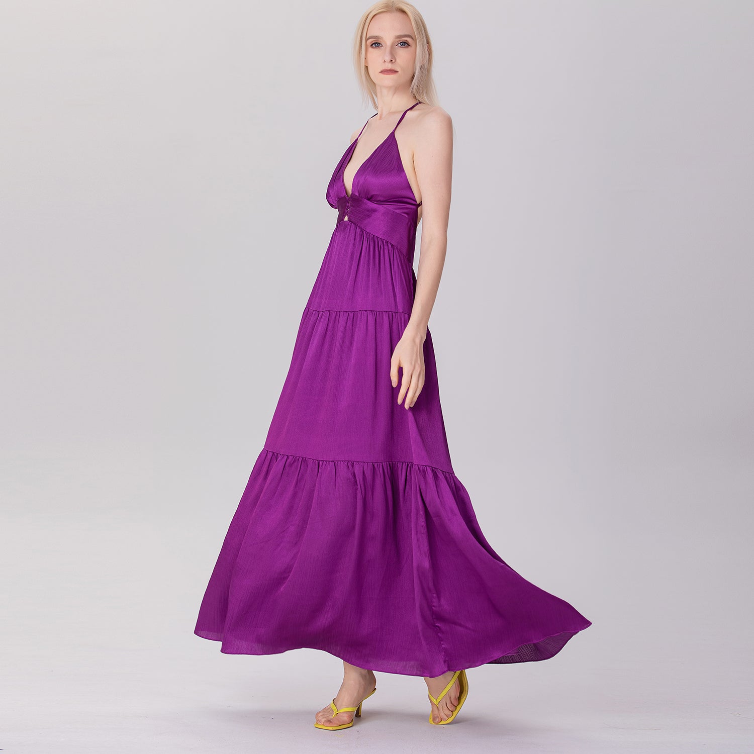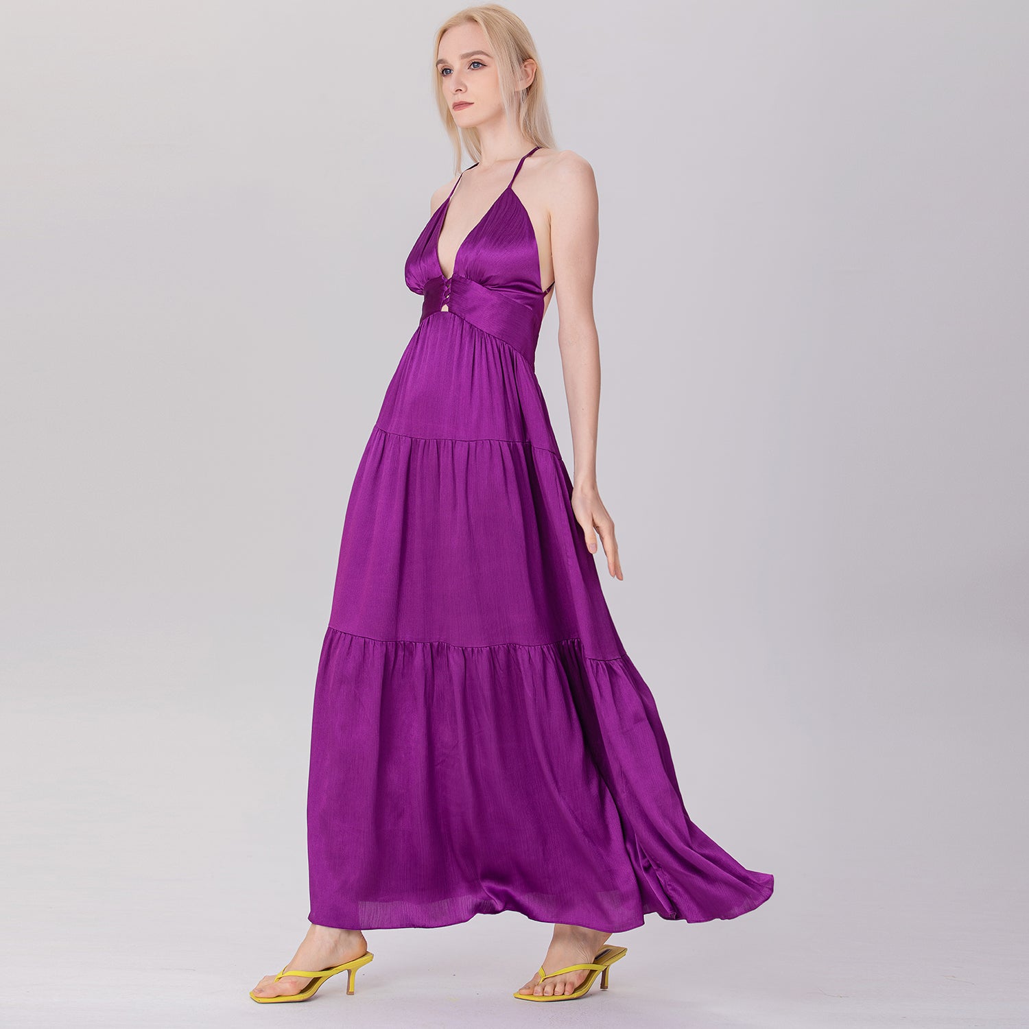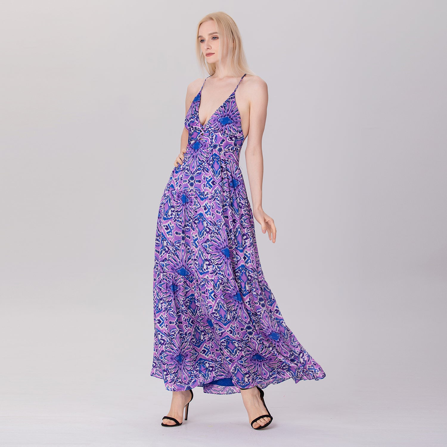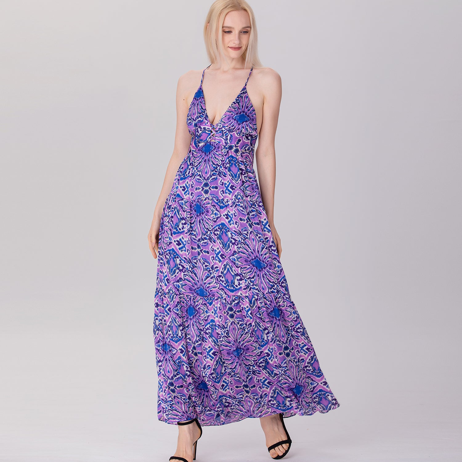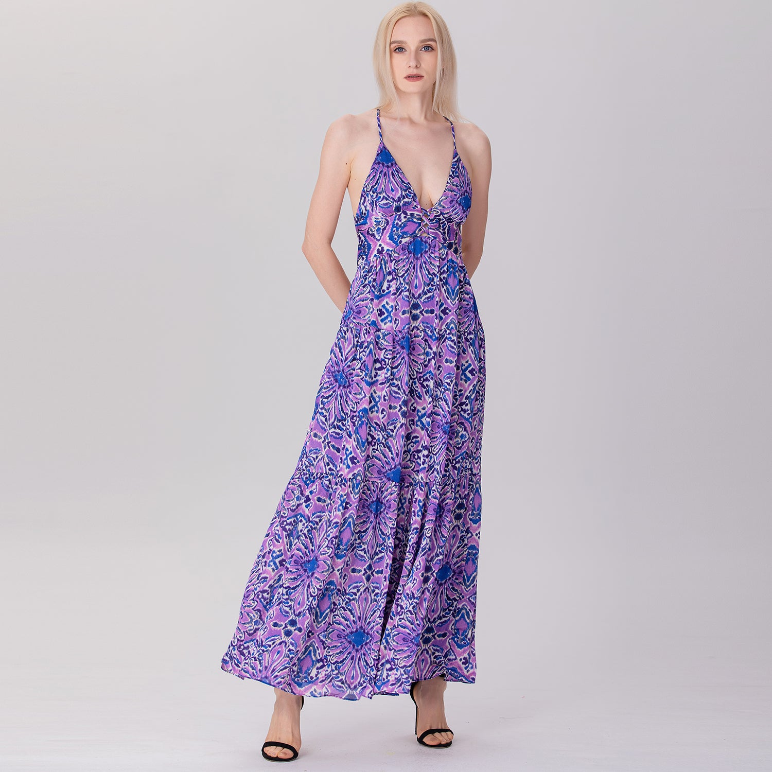 Une robe longue et élégante qui présente un décolleté en V profond et un ajouré sur le buste avec des croisillons audacieux. Sa coupe empire ajustée sous la poitrine s'élargit progressivement en une jupe fluide à plusieurs niveaux, créant un mouvement léger et aérien. Les bretelles fines, croisées dans le dos et son ouverture plongeante apportent une touche séduisante et glamour, parfaite pour des occasions estivales décontractées ou semi-formelles.