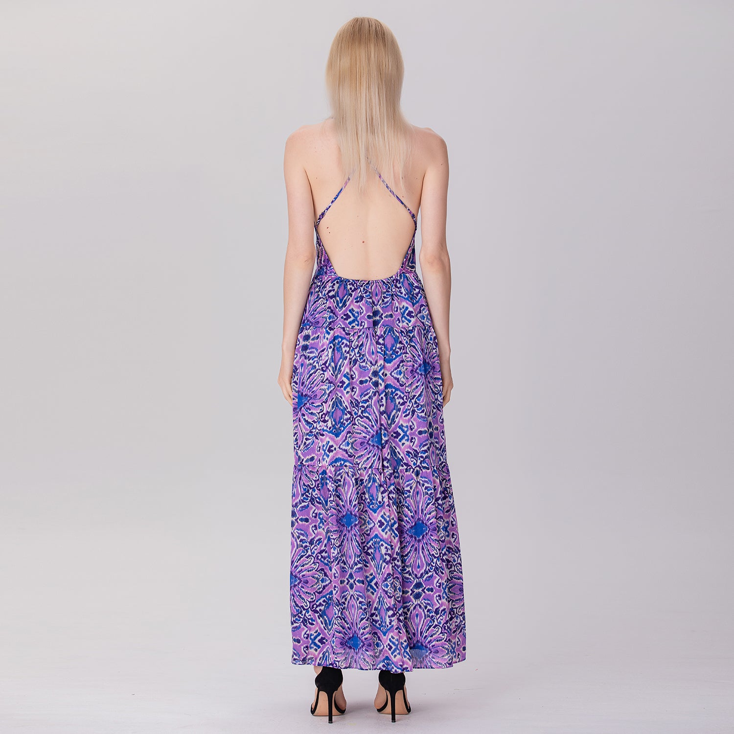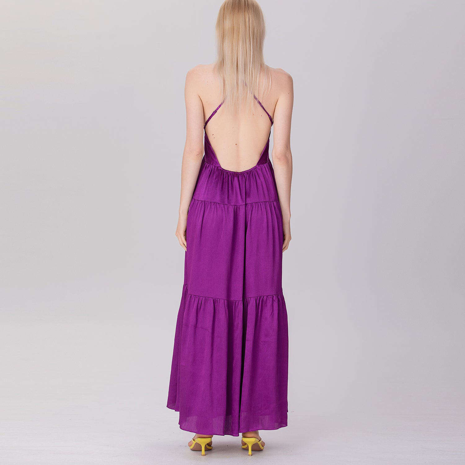 Robe longue dos nu à bretelles et empiècements évasés