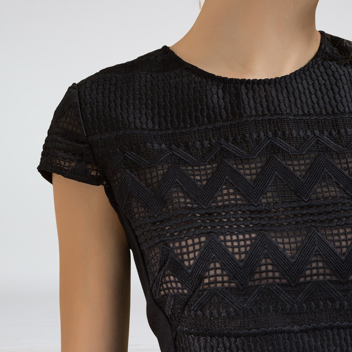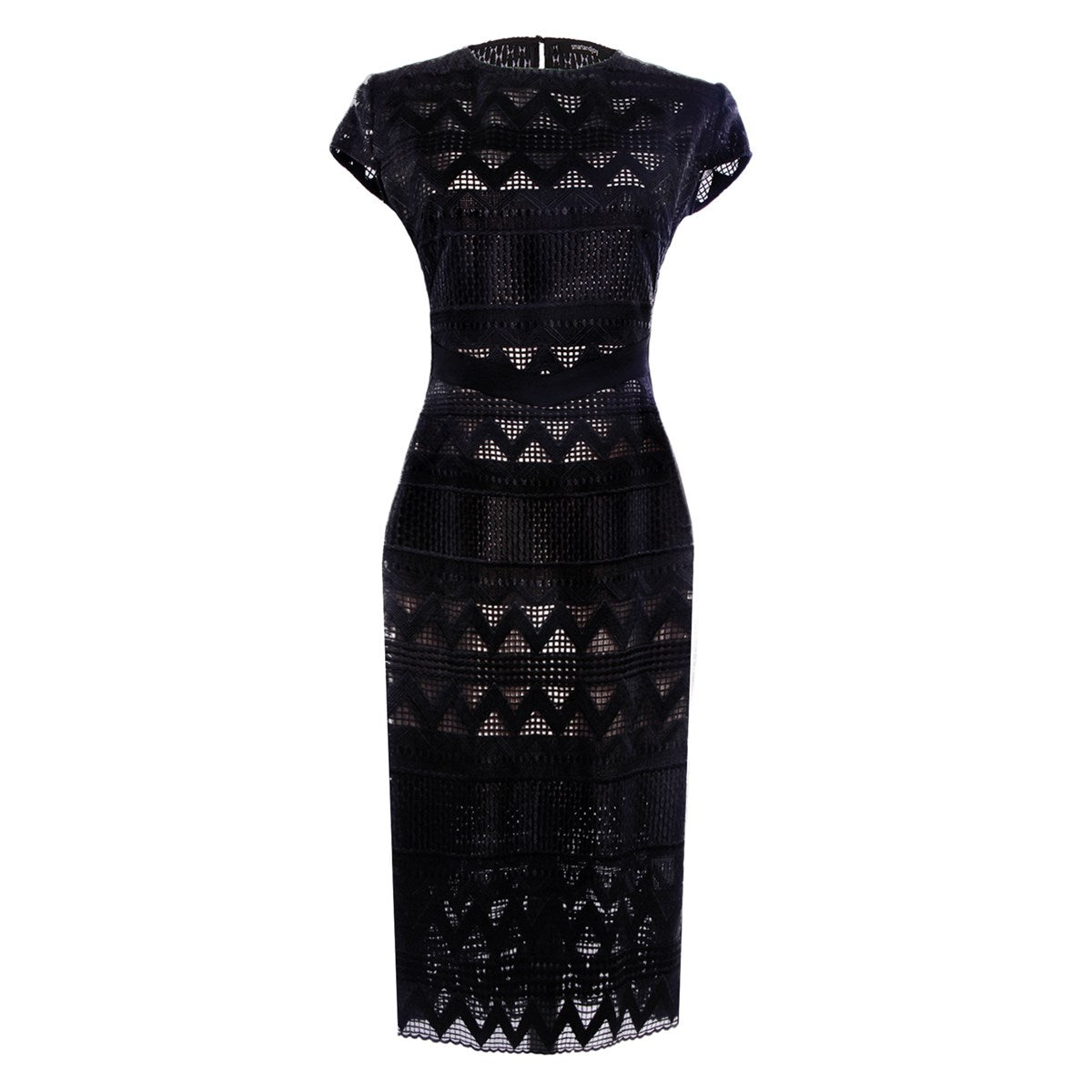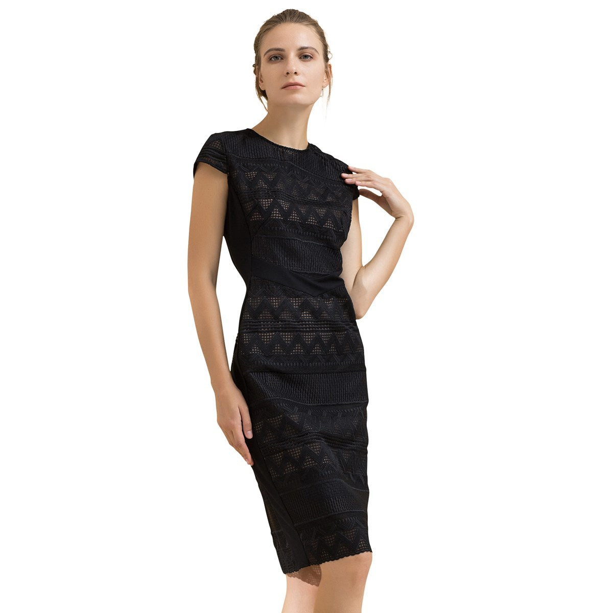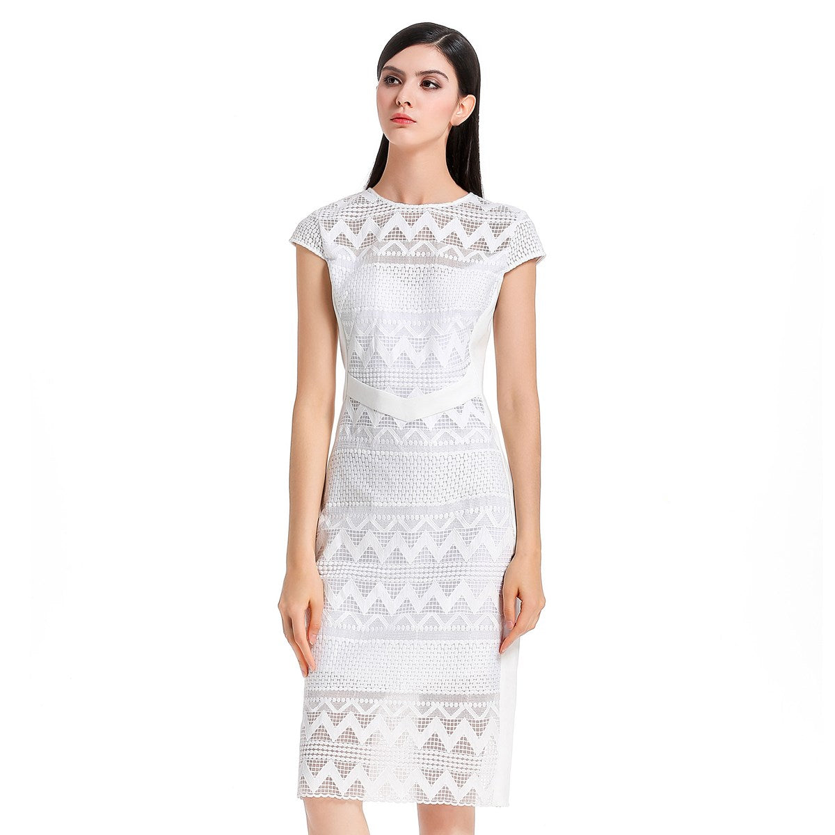 Robe mi-longue ajustée dentelle et maille avec mancherons par S&J-London SmartandJoyCette robe est parfaitement coupée pour mettre en valeur élégamment votre silhouette grâce à une astucieuse découpe de pièces en maille très stretch sur les côtés. Devant et dos se place une dentelle rebrodée sur organza qui présente un motif géométrique moderne et dévoile subtilement les épaules par transparence. Un grand zipper métal parcours tout le milieu dos et vous permet d’ajuster l’ouverture de la partie jupe. Une pièce intemporelle et féminine qui se porte au travail comme en soirée.