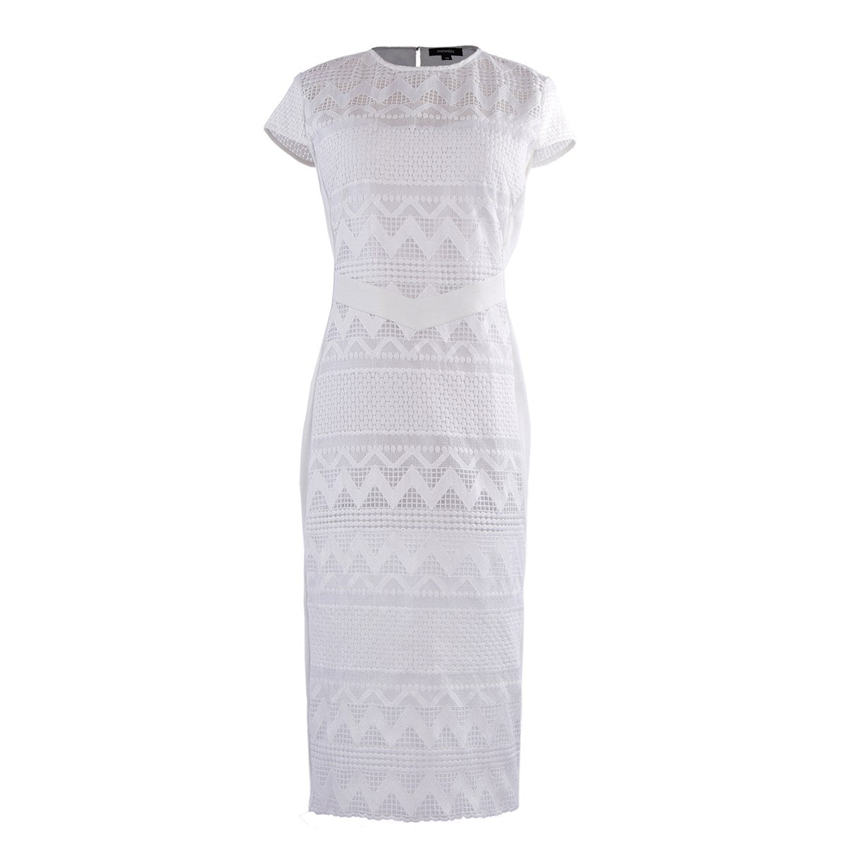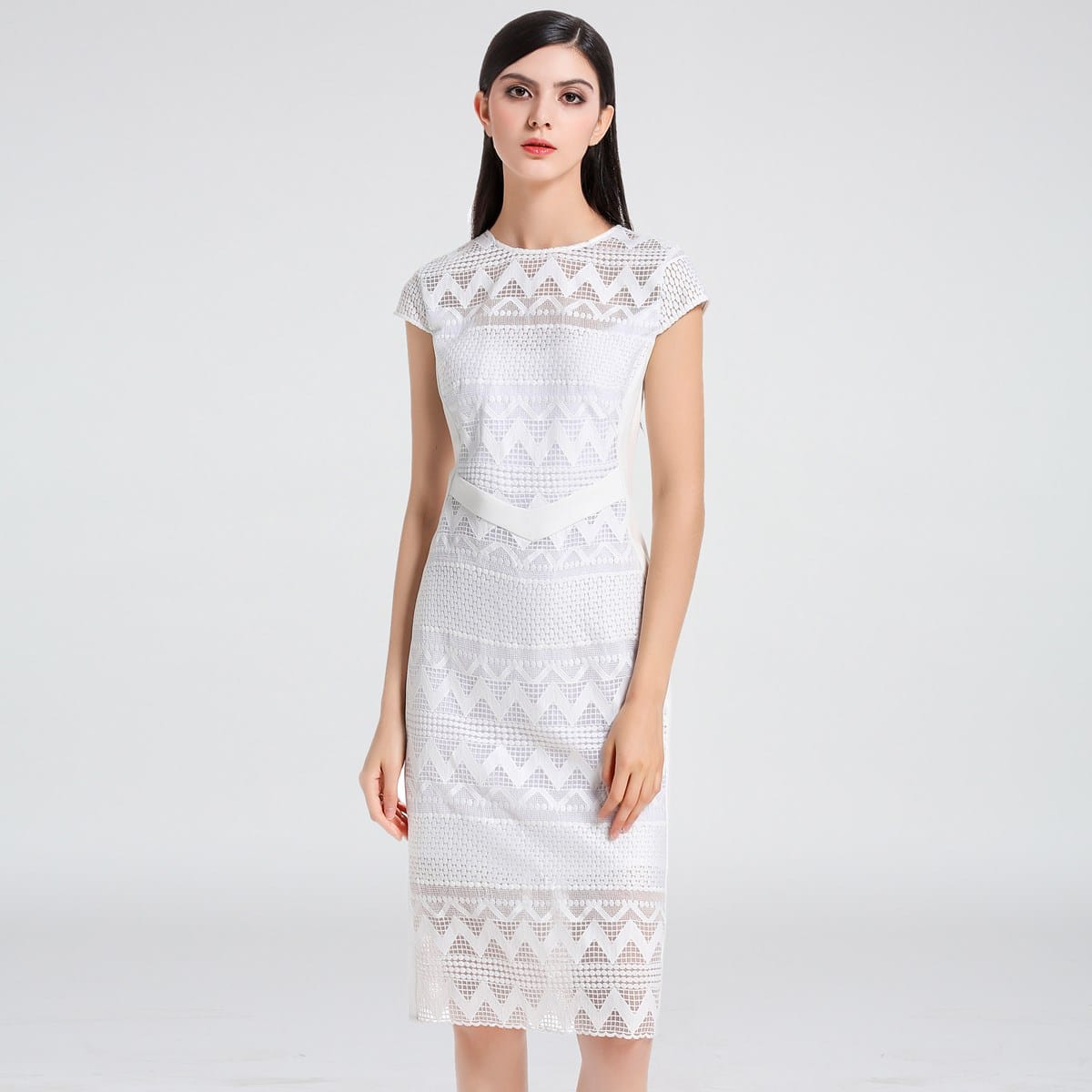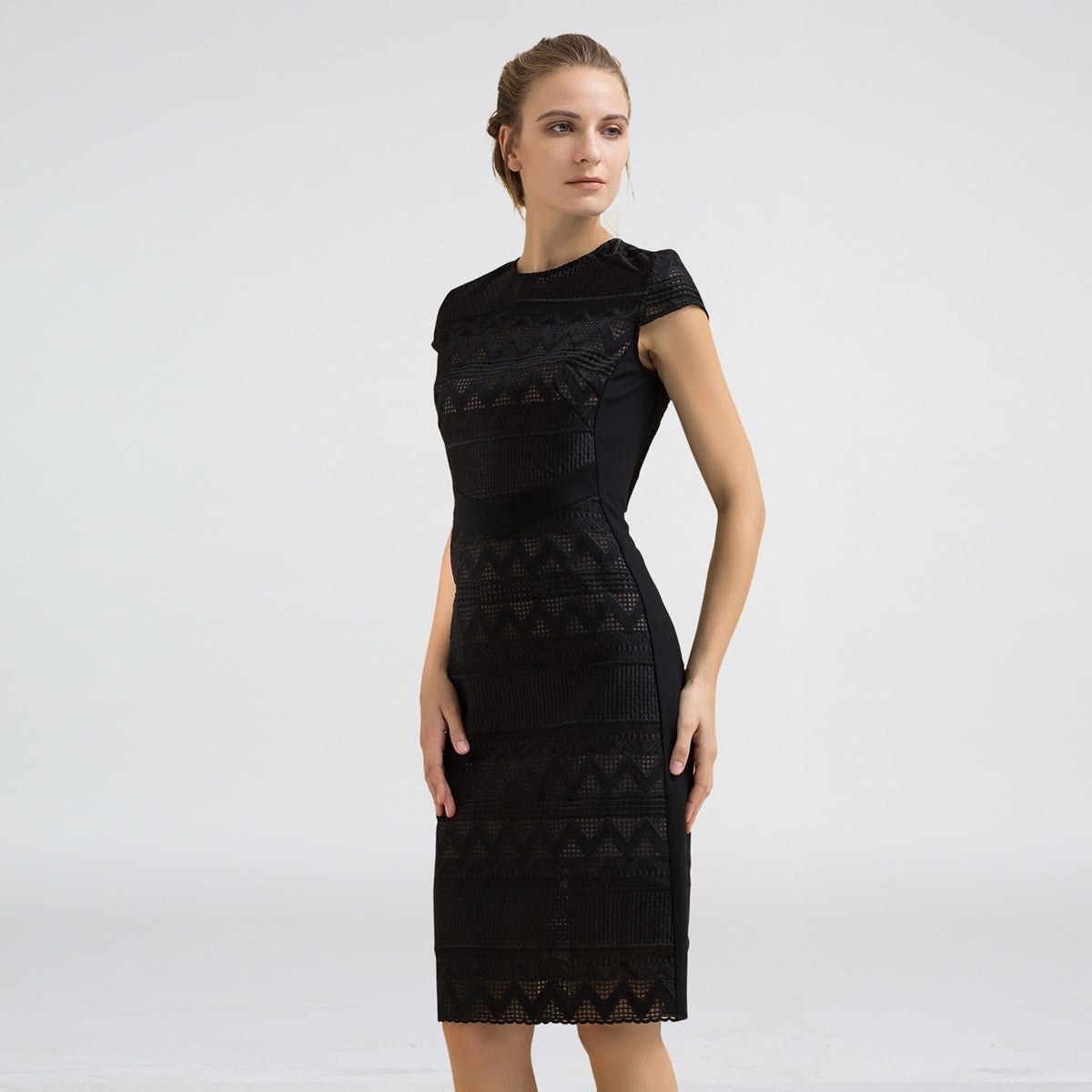 Robe mi-longue ajustée dentelle et maille avec mancherons par S&J-London SmartandJoyCette robe est parfaitement coupée pour mettre en valeur élégamment votre silhouette grâce à une astucieuse découpe de pièces en maille très stretch sur les côtés. Devant et dos se place une dentelle rebrodée sur organza qui présente un motif géométrique moderne et dévoile subtilement les épaules par transparence. Un grand zipper métal parcours tout le milieu dos et vous permet d’ajuster l’ouverture de la partie jupe. Une pièce intemporelle et féminine qui se porte au travail comme en soirée.