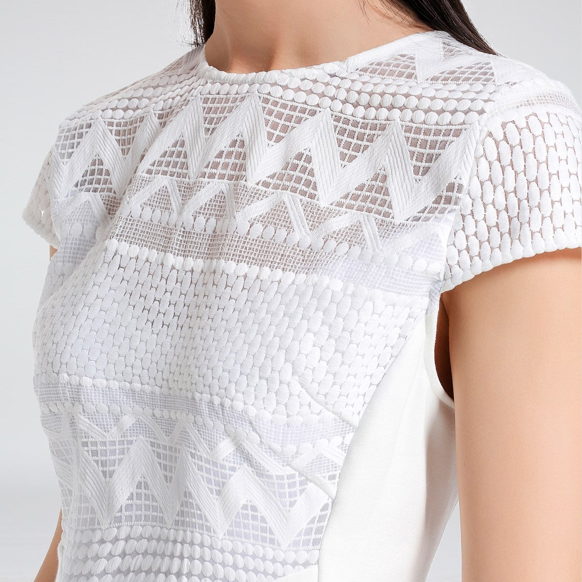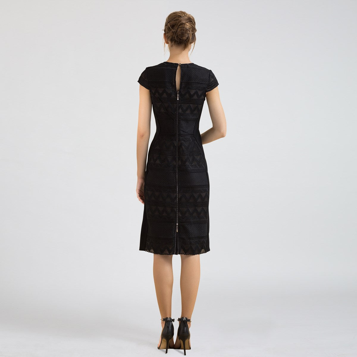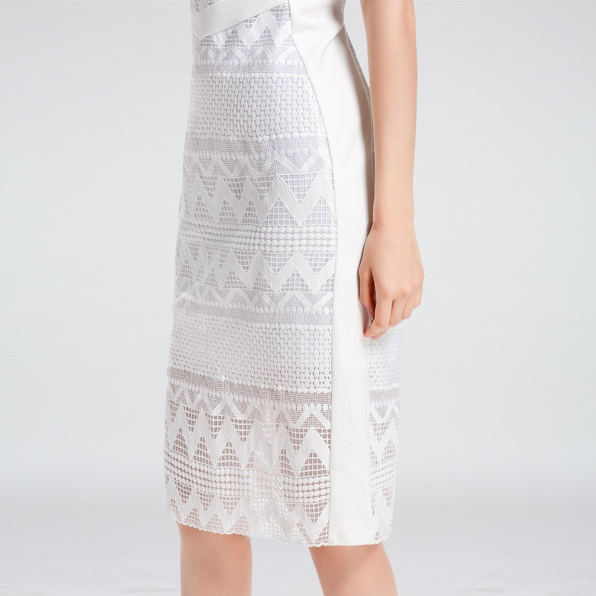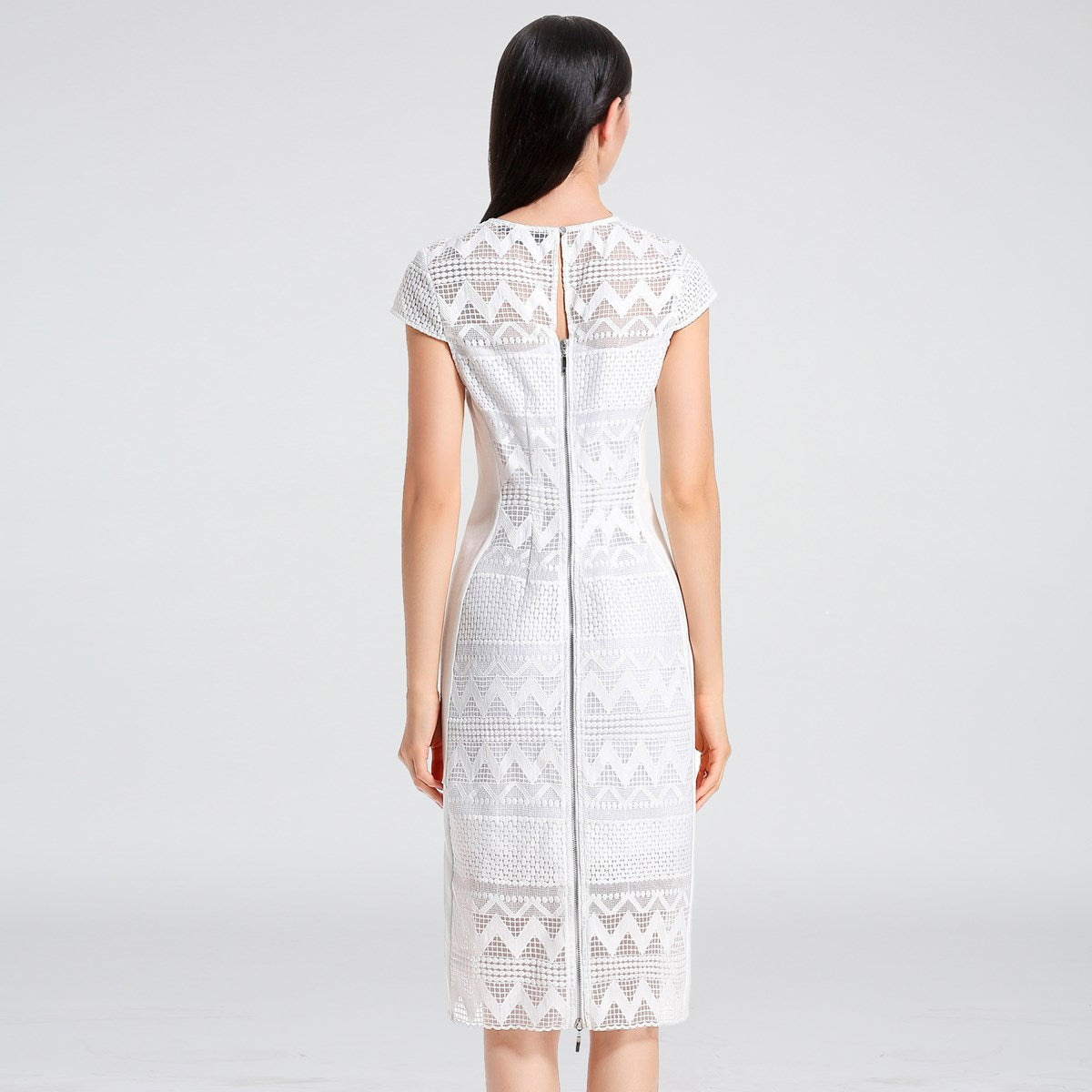Robe mi-longue ajustée dentelle et maille avec mancherons par S&J-London SmartandJoyCette robe est parfaitement coupée pour mettre en valeur élégamment votre silhouette grâce à une astucieuse découpe de pièces en maille très stretch sur les côtés. Devant et dos se place une dentelle rebrodée sur organza qui présente un motif géométrique moderne et dévoile subtilement les épaules par transparence. Un grand zipper métal parcours tout le milieu dos et vous permet d’ajuster l’ouverture de la partie jupe. Une pièce intemporelle et féminine qui se porte au travail comme en soirée.