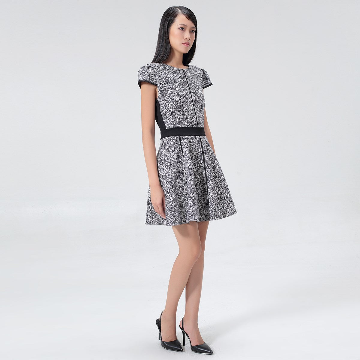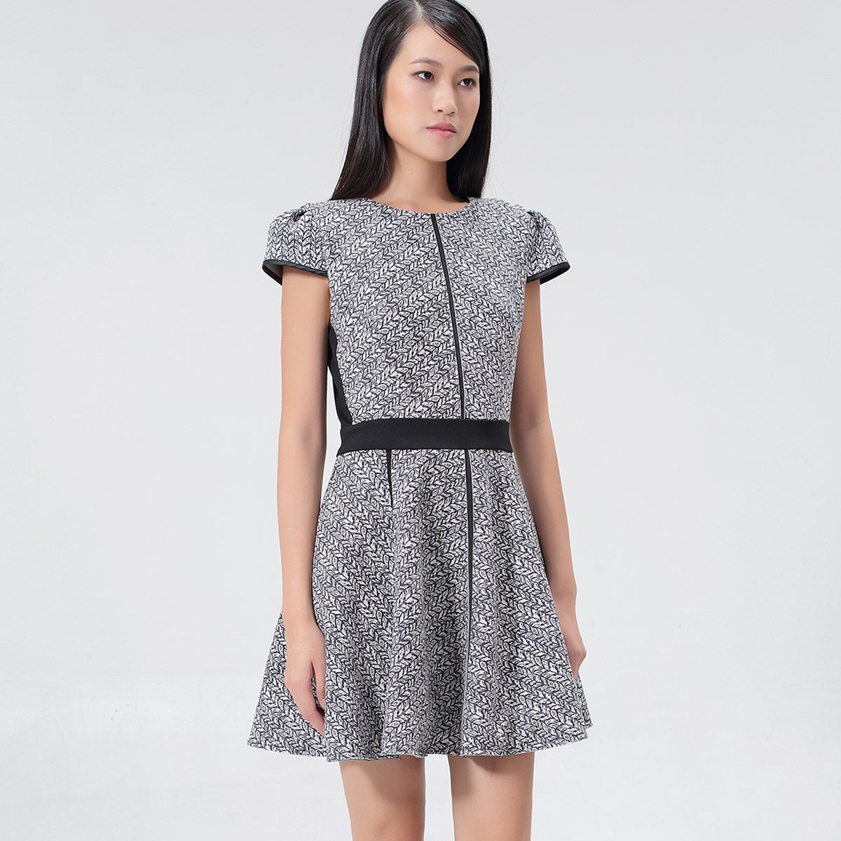 Une pièce à la coupe flatteuse, cintrée à la taille, largement évasée et relevée de deux manchettes. Structurée par des liserais noirs aux manches, à la jupe et à la ceinture pour souligner élégamment la silhouette. La matière est une suédine imprimée double et stretch, qui offre un porté confortable et gainant. A porter avec des ballerines pour un look sage ou avec des bottes plates pour une allure plus décontractée.