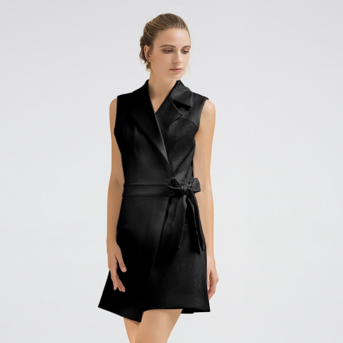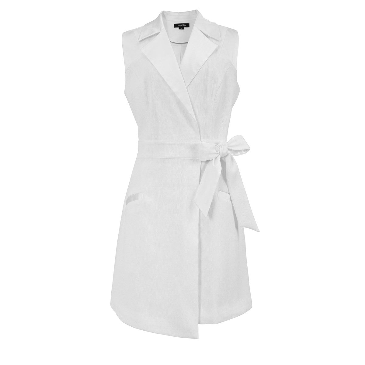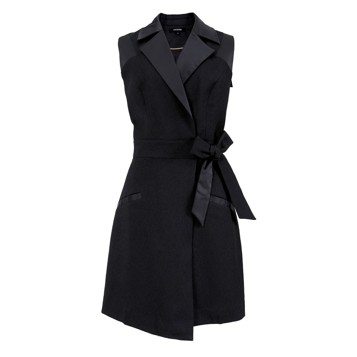 Cette élégante robe portefeuille peut se porter soit seule en robe, soit comme un gilet long avec pantalon slim et blouse simple en-dessous lors de la mi-saison. Doté d'un tissu subtilement texturé mélangé à un satin mat épais sur les revers de col, c'est l'un des ""classiques revisité"" des studios Smart and Joy. Une valeur sûre dans n'importe quelle garde-robe. Une pièce intemporelle qui égayera votre journée de travail et habillera votre soirée ! A porter sans modération.\n\nDétails produit:\n