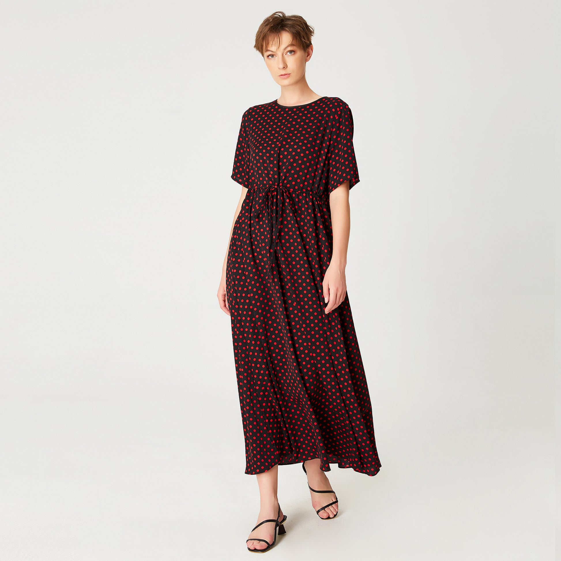 Une pièce un rien rétro avec son imprimé à pois. Une coupe confortable soulignée à la taille pas un cordon coulissant à nouer sur le devant. On peut jouer le coté décontracté en la portant avec une paire de sneakers ou des boots, et une veste en jean.