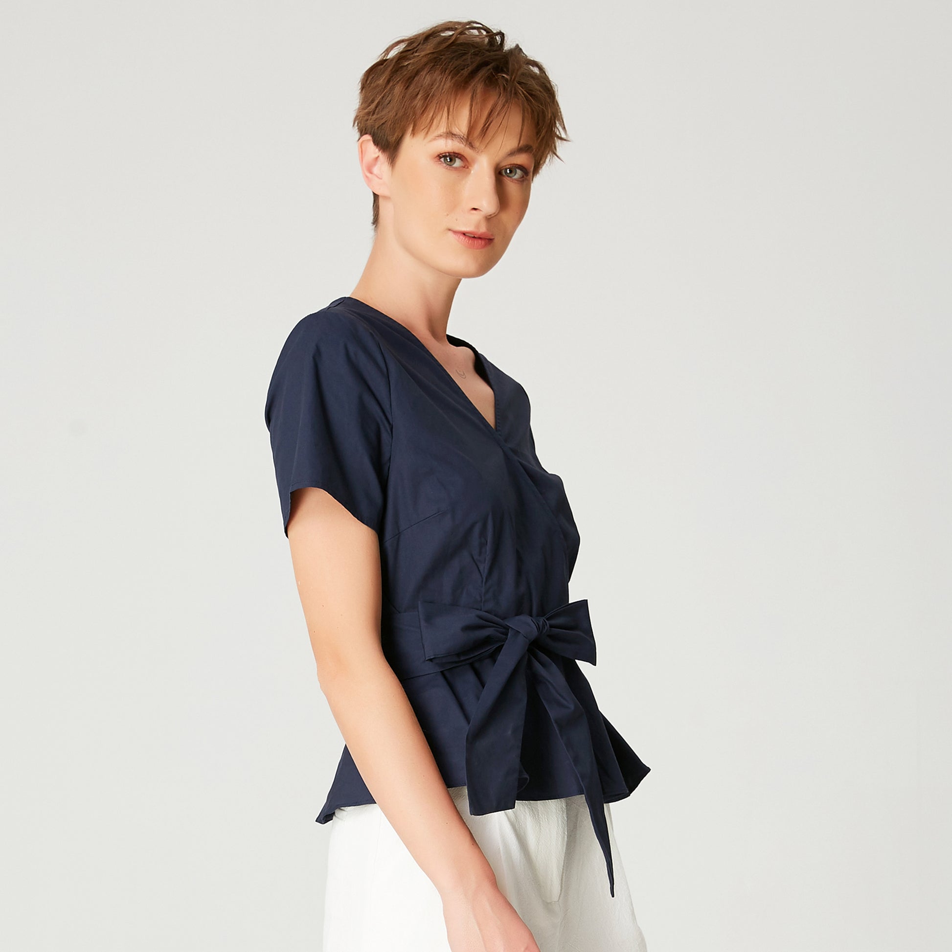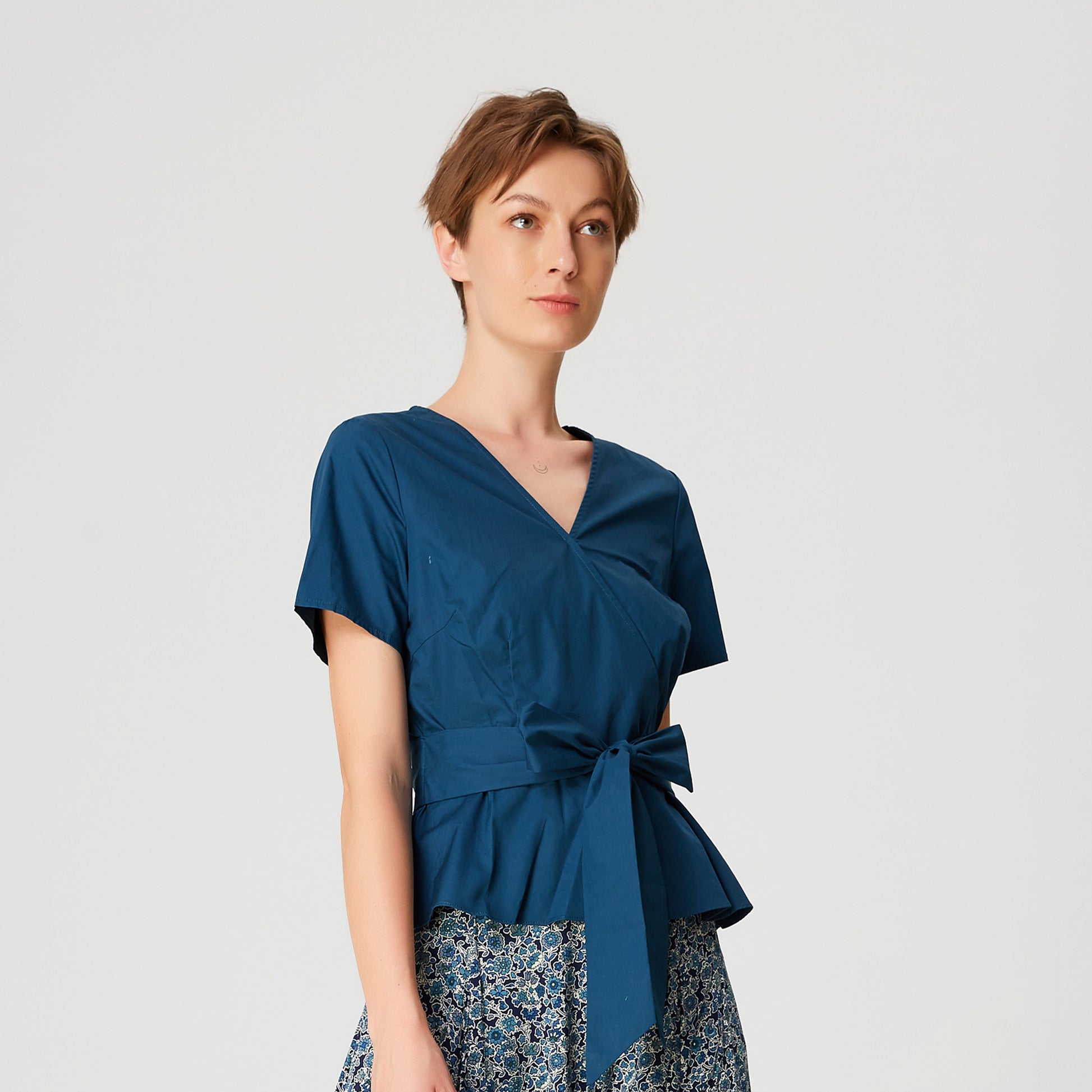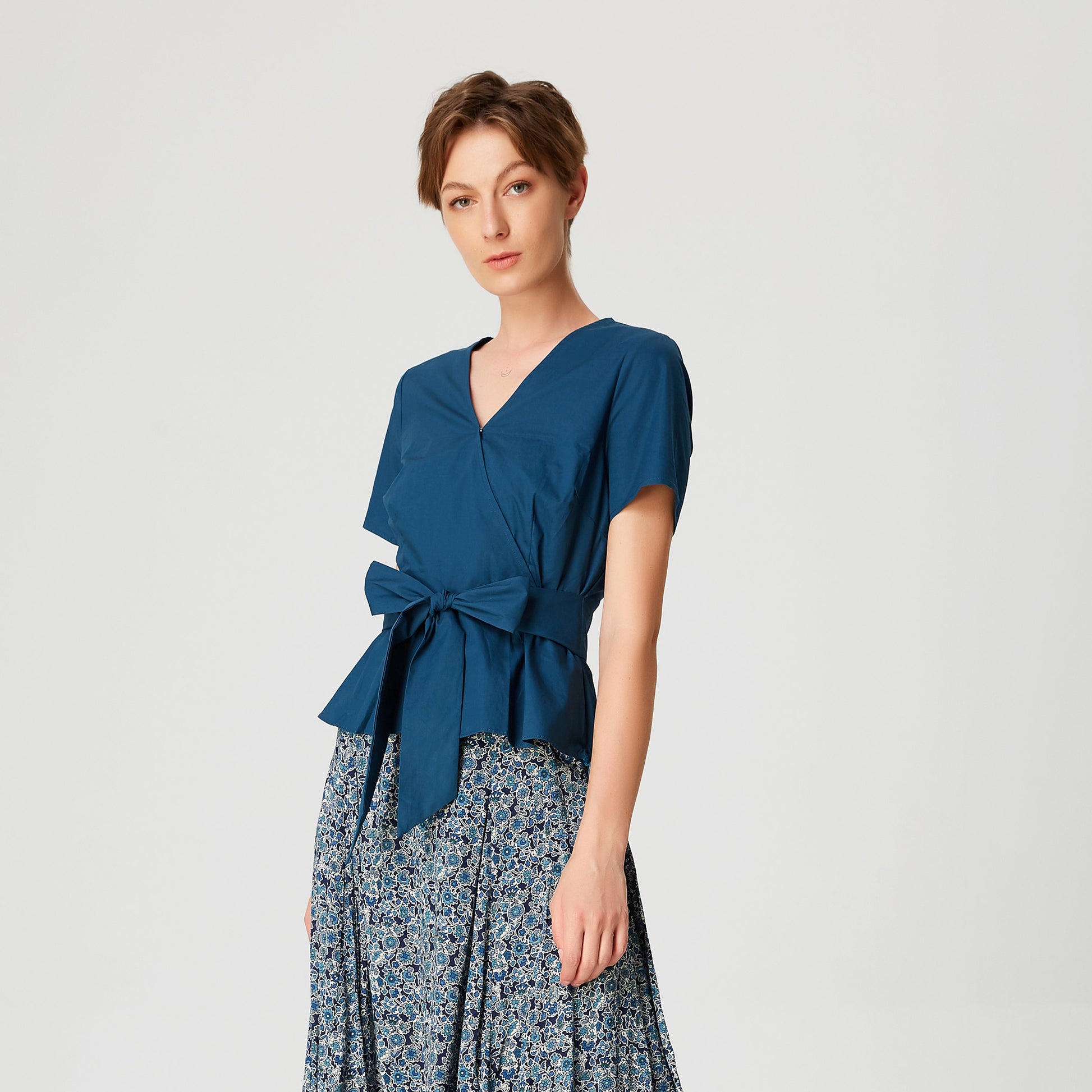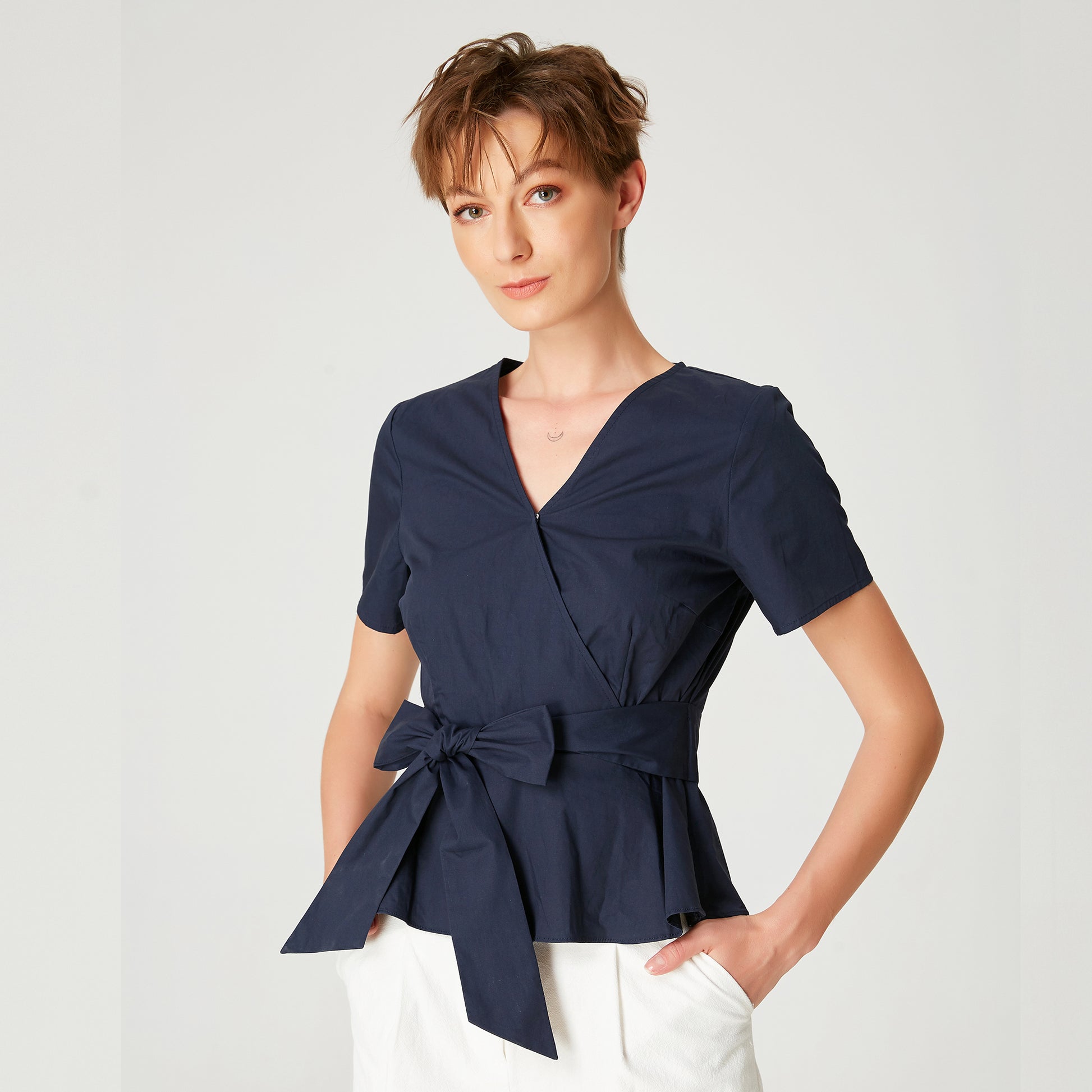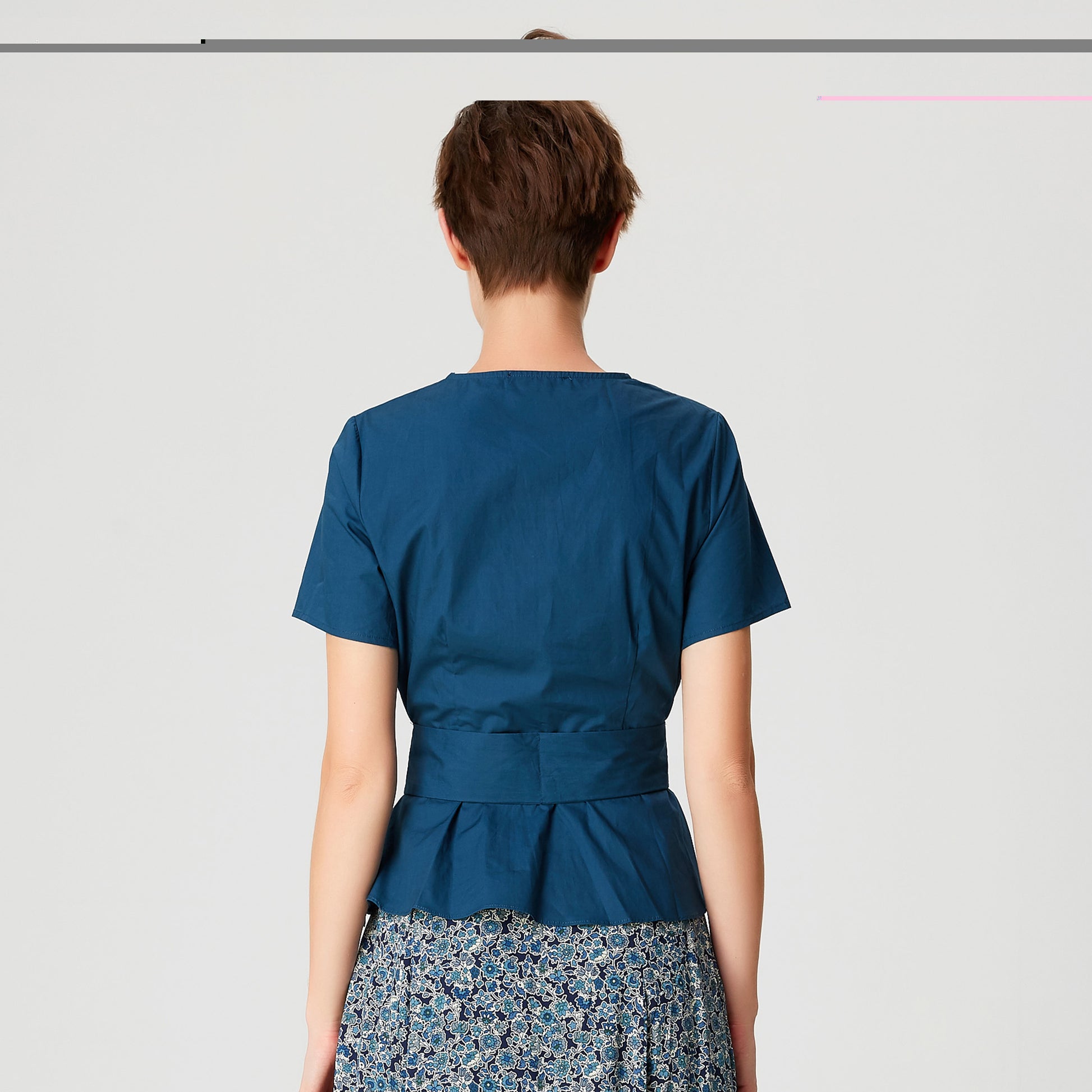 Une coupe féminine et raffinée, ce top s’agrémente d’une large ceinture à-même à nouer, soit devant, soit au dos au grès de vos envies. Le buste est élégamment mis en valeur par l’encolure en v avec effet cache cœuret les pinces poitrines. A associer avec une jupe droite ou un pantalon cigarette.